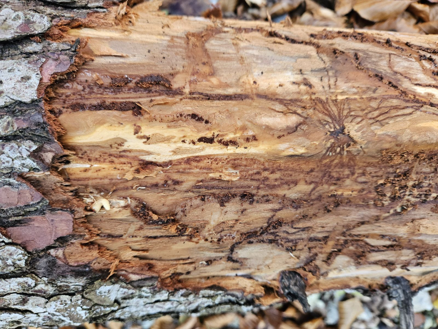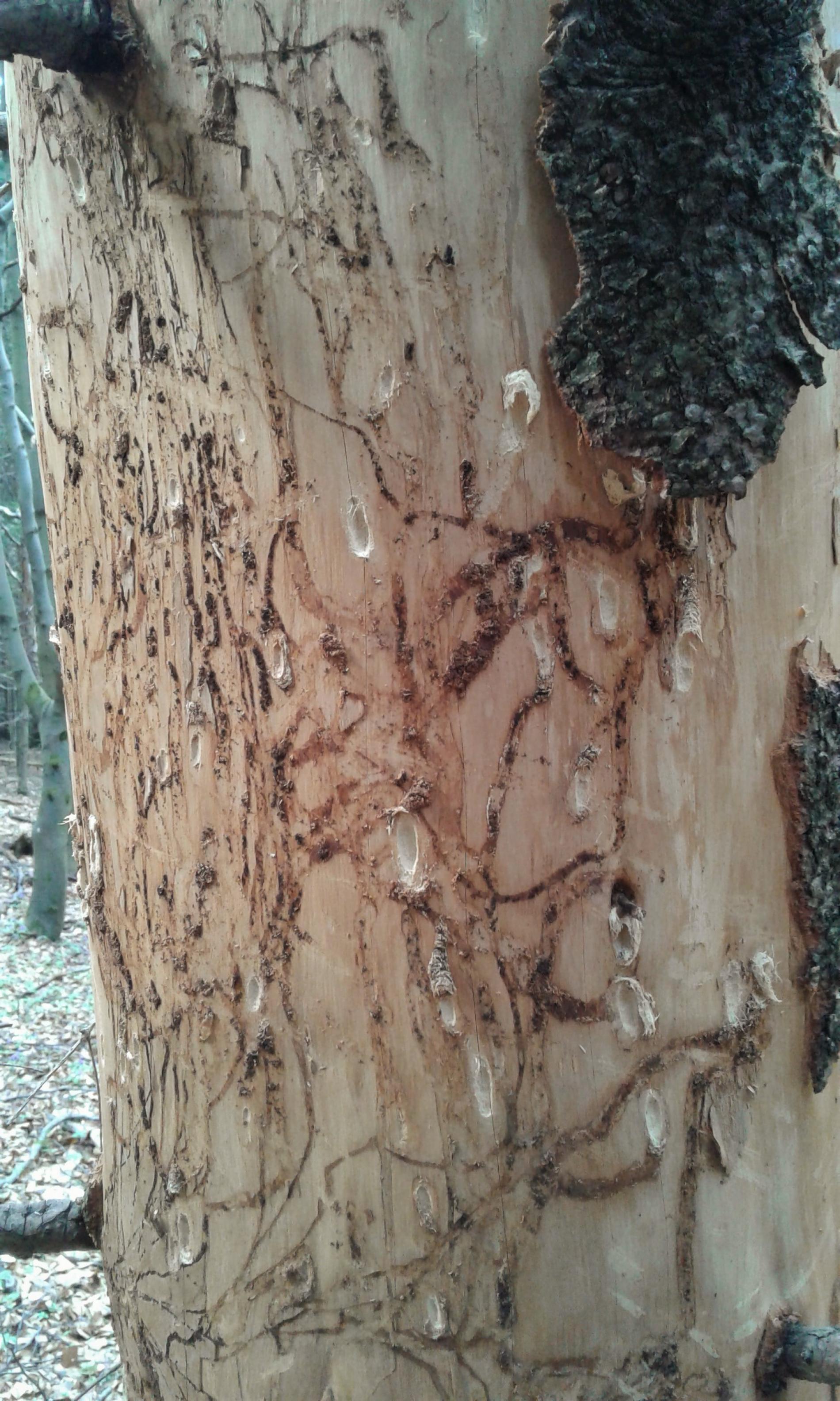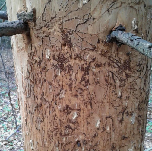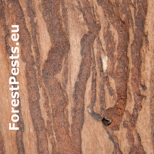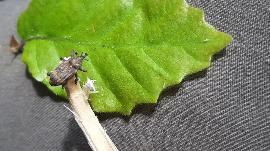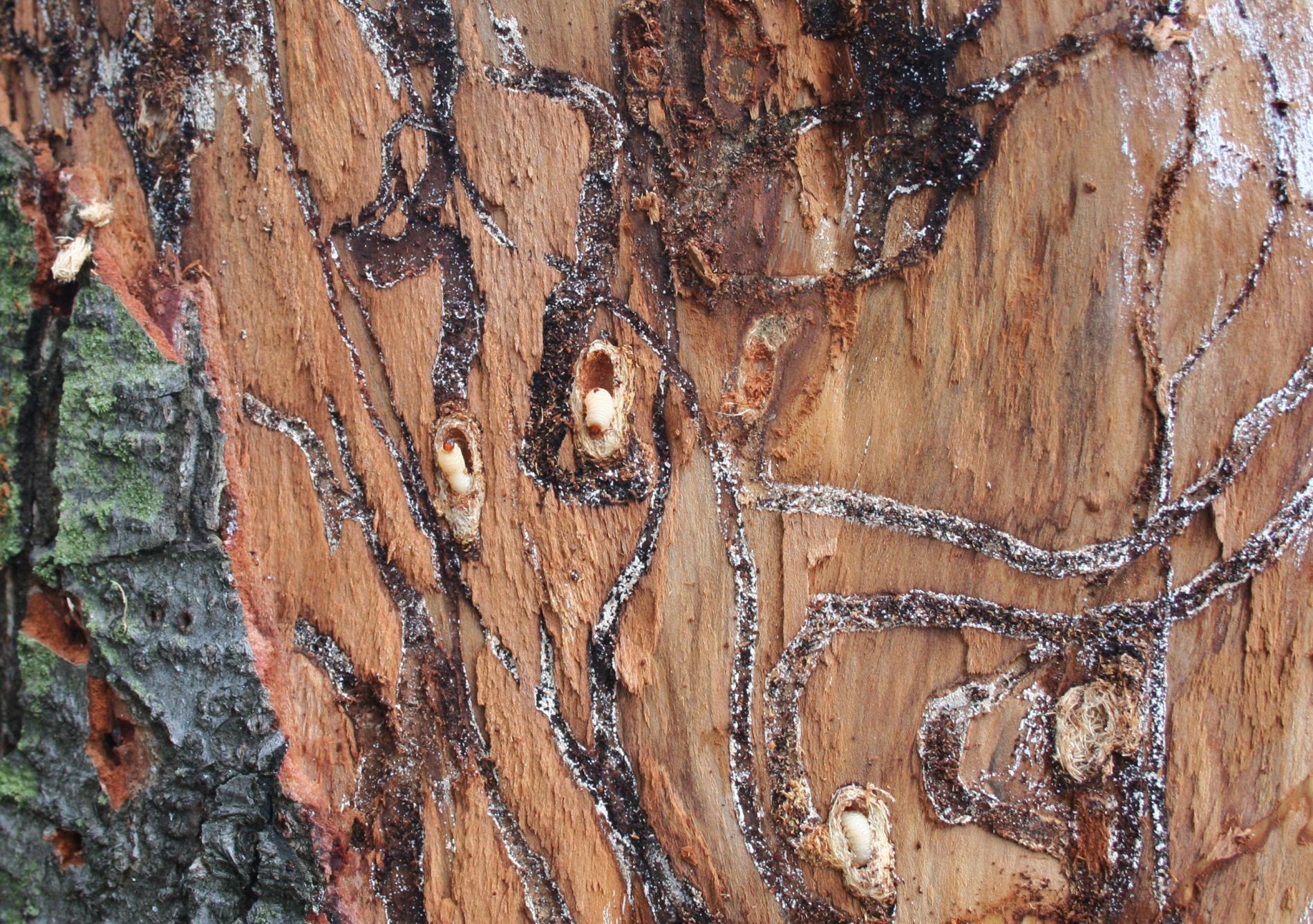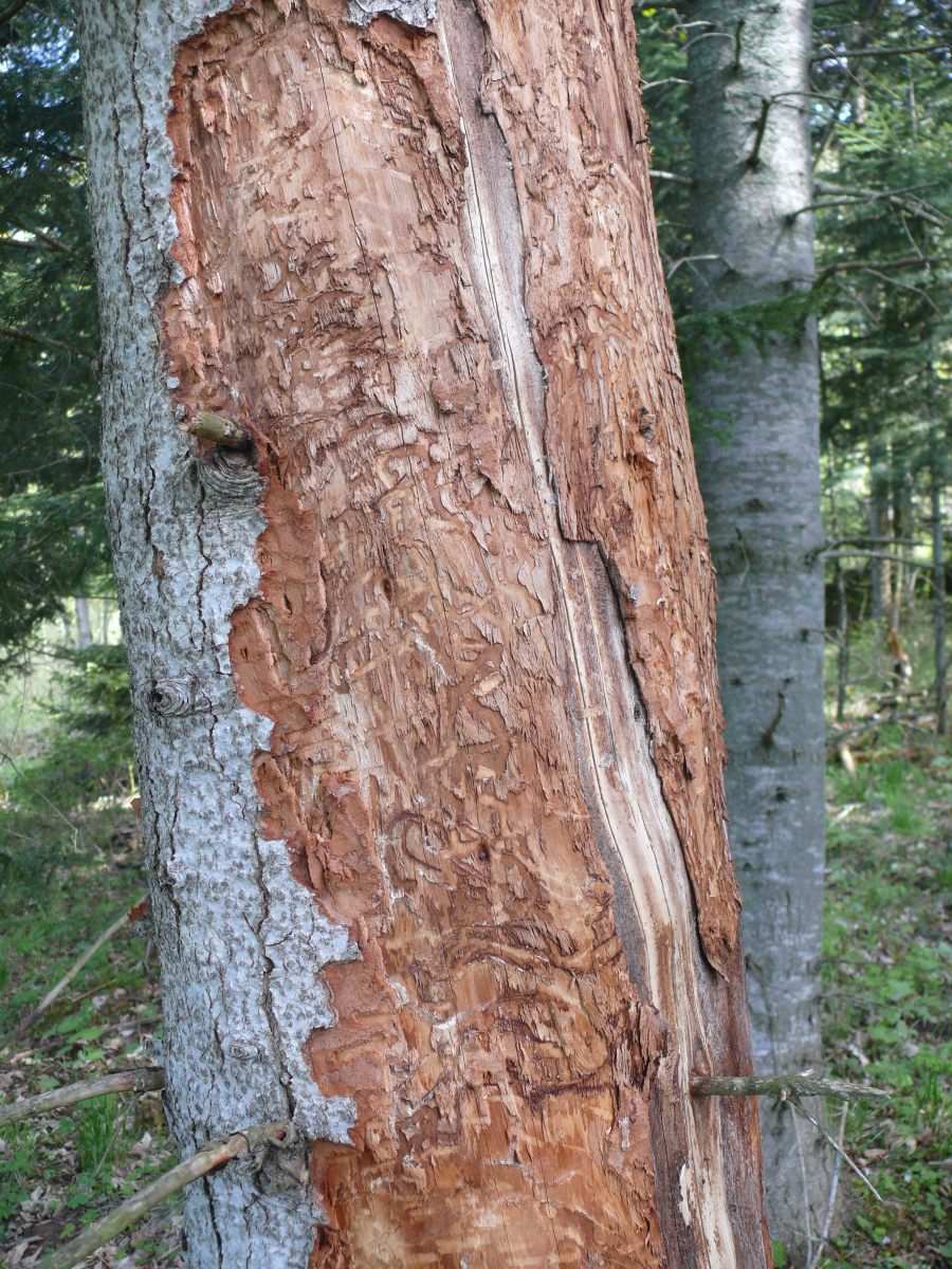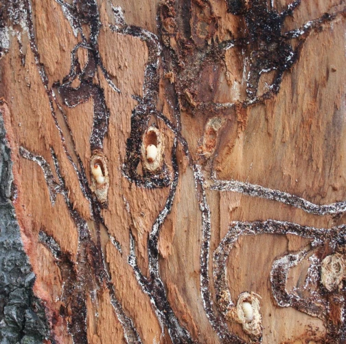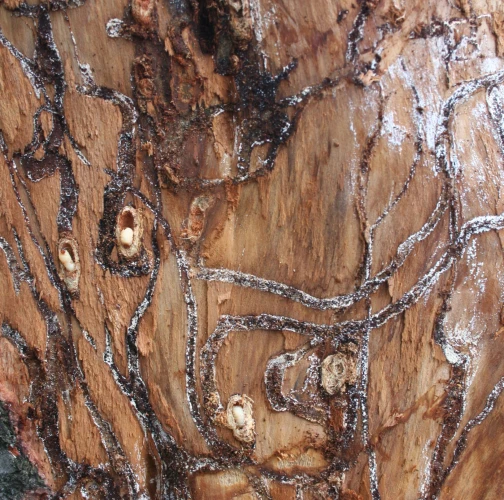 The larvae of Pissodes piceae develop under the bark of fir trunks, preferably in trees between 40-80 years old. The female of the species lays multiple eggs into a pit gnawed off in the bark. Once hatched, the larvae bore into the bark and gradually create galleries by biting away at it. At the ends of these galleries, oval pupal chambers are formed, which are embedded in wood and filled with a small layer of fine wood chips. The pupae, which have a visible "nose," develop inside these chambers before emerging as brown adults with yellow spots on their elytrae. This pest species completes its life cycle annually. Adult insects may live for up to two years and lay eggs throughout their lifetime, resulting in various life stages occurring at the same time. The species is a dangerous pest that has a tendency to cause mass outbreaks on weakened trees, often in conjunction with other pest species.