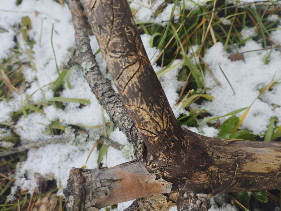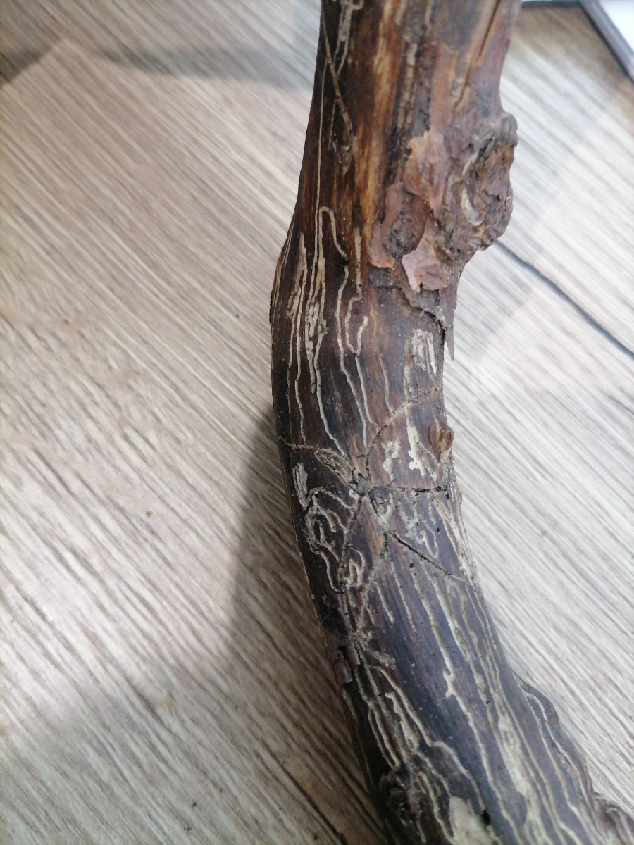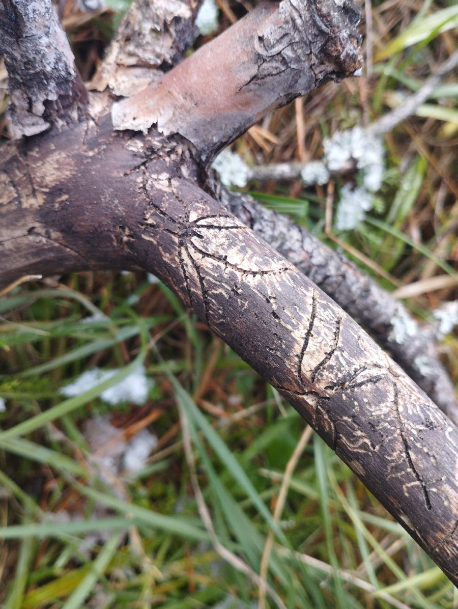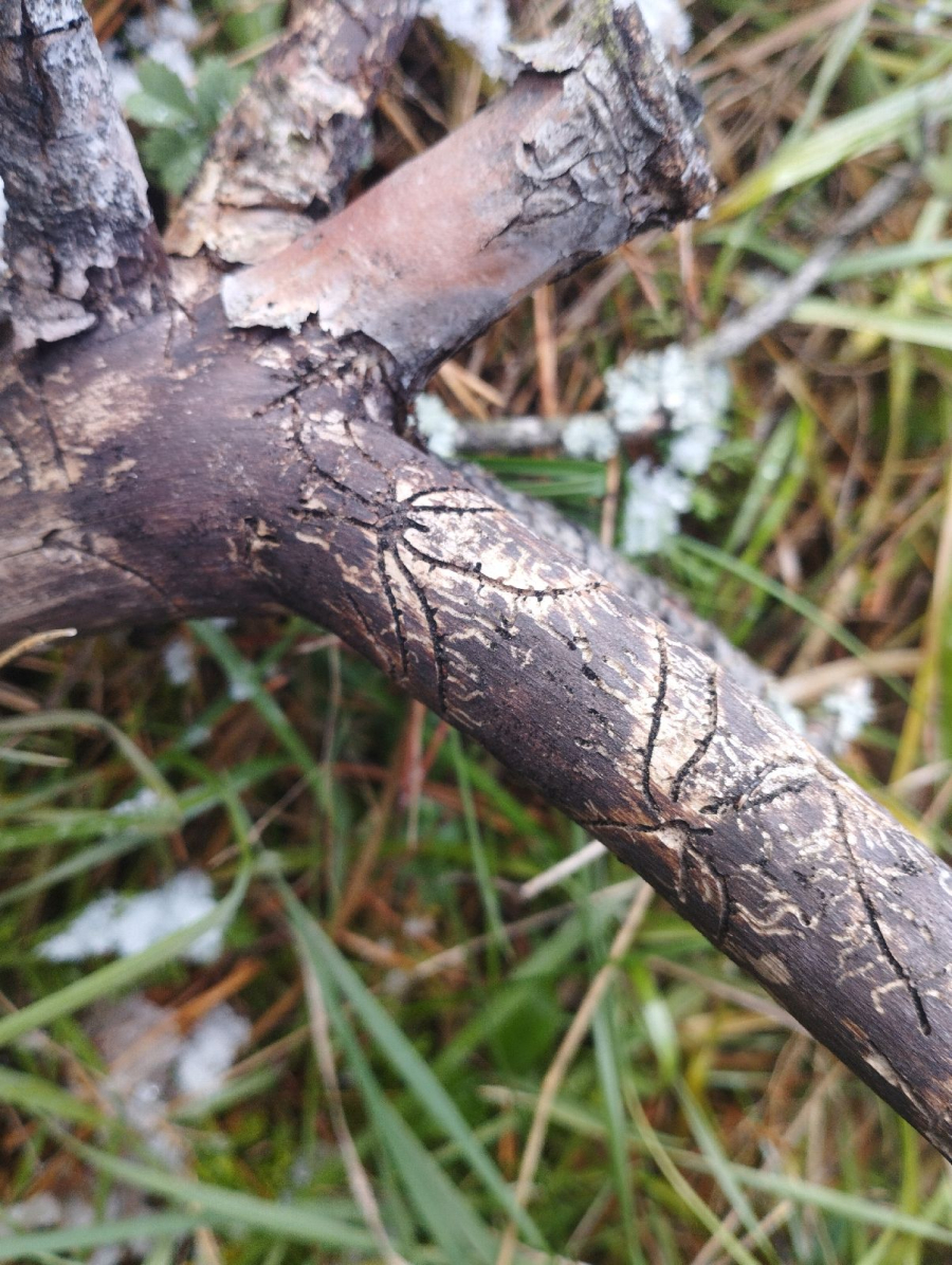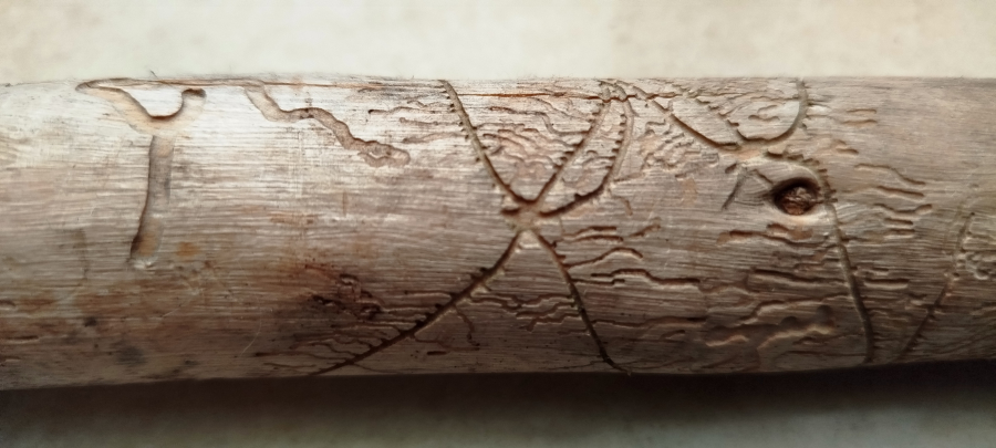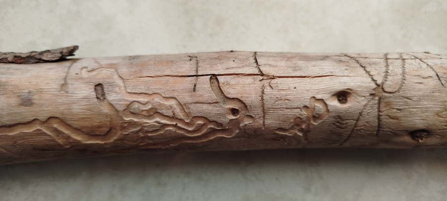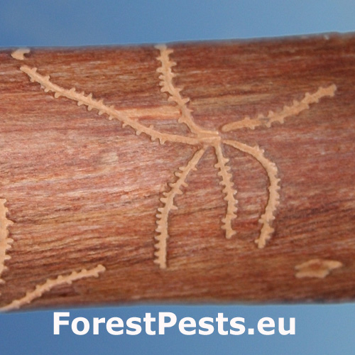 Galleries under the bark. Egg galleries usually branch out from the nuptial chamber forming a star-shape pattern.