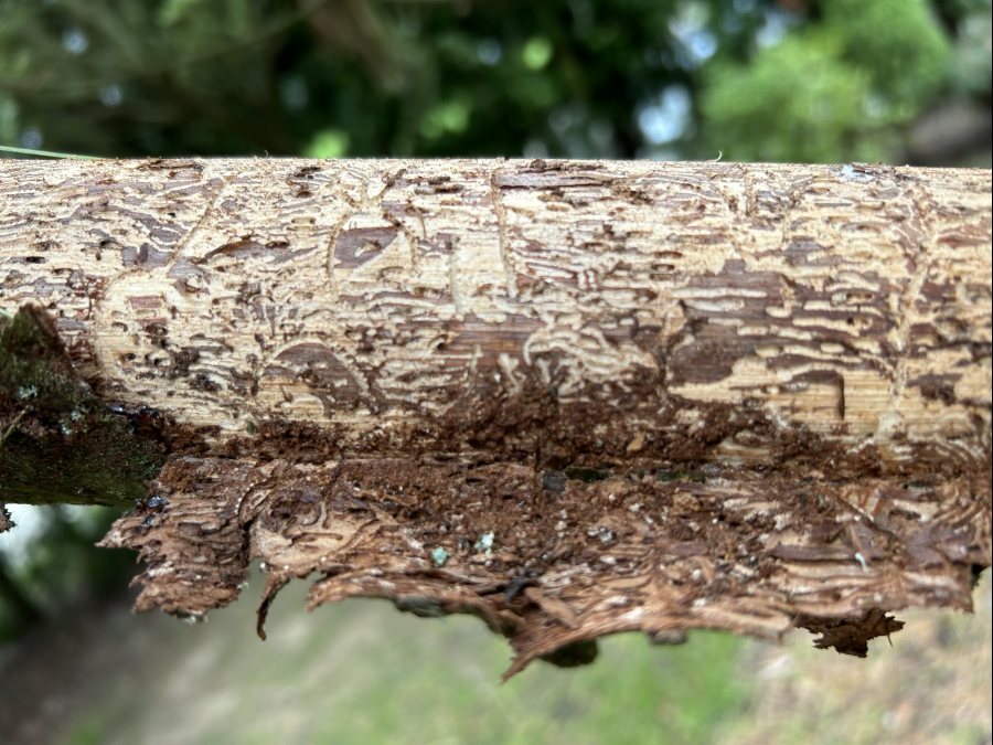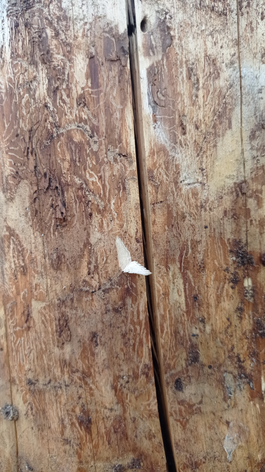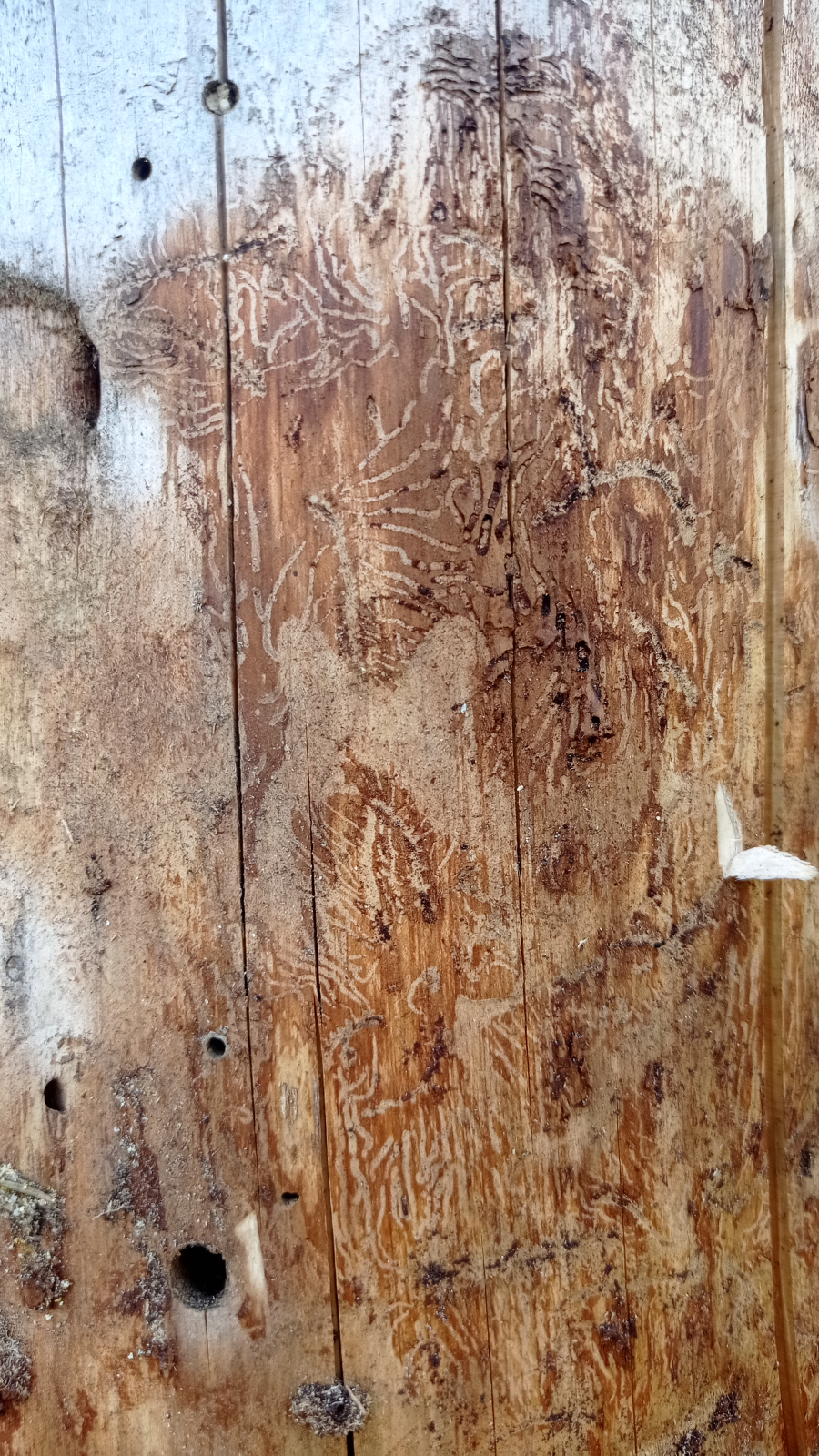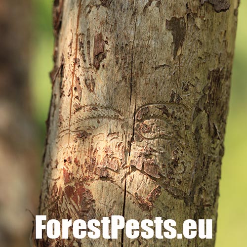 The nuptial chamber is hidden in the bark and is not visible in the wood which makes the insect galleries distinct from those of similar species.