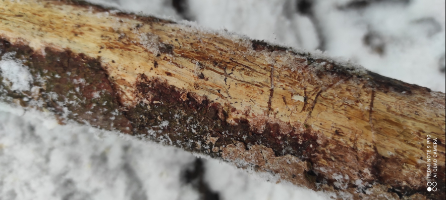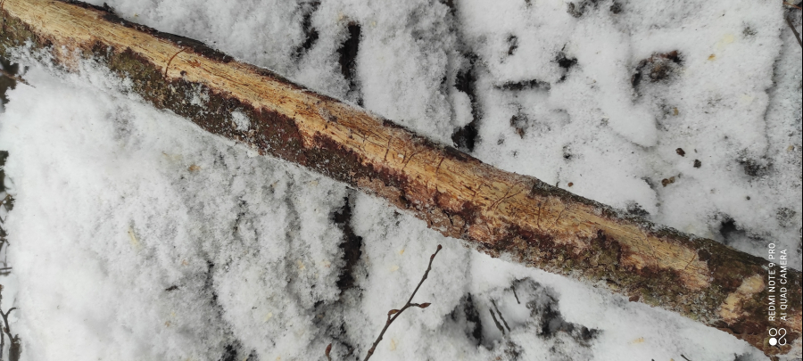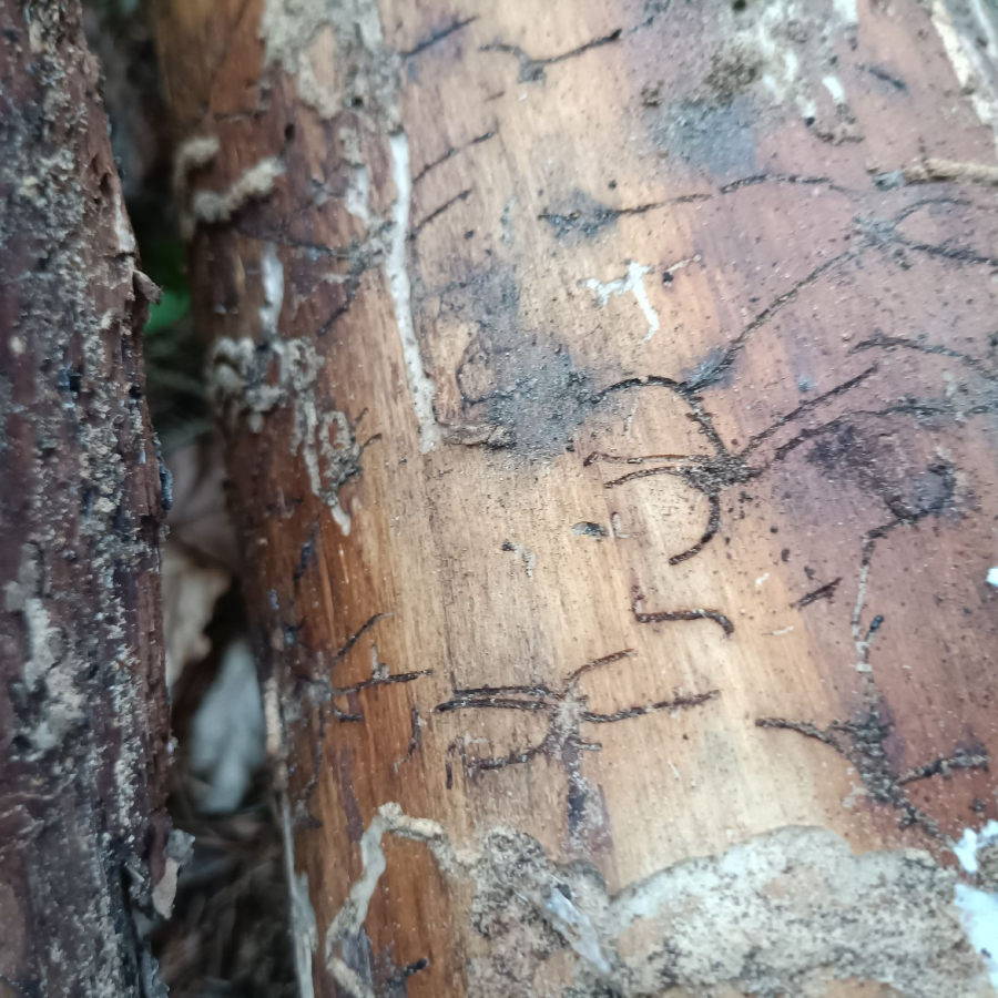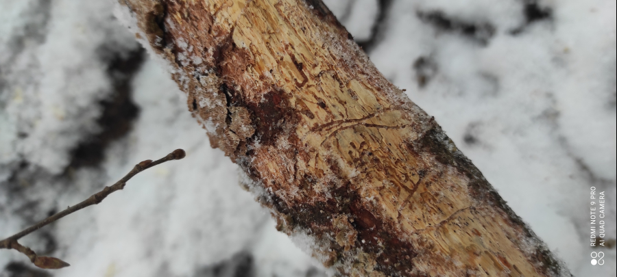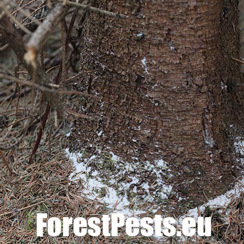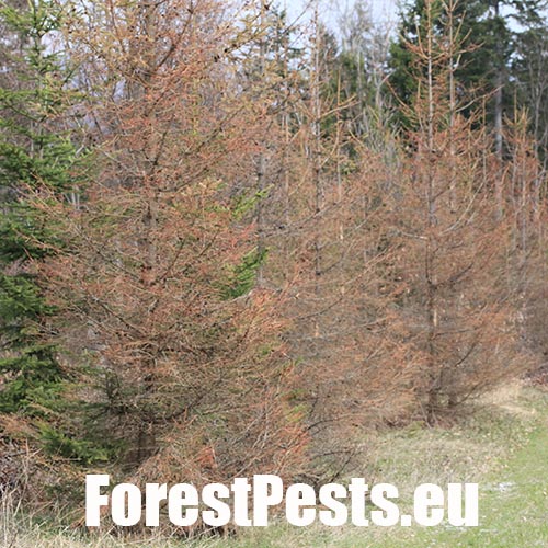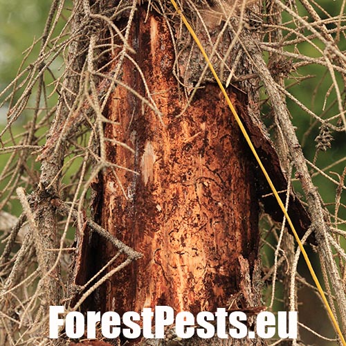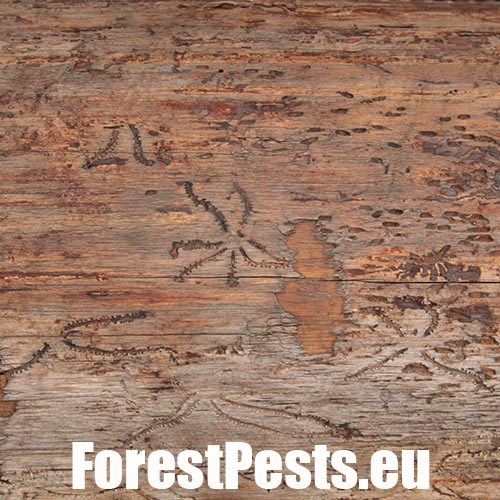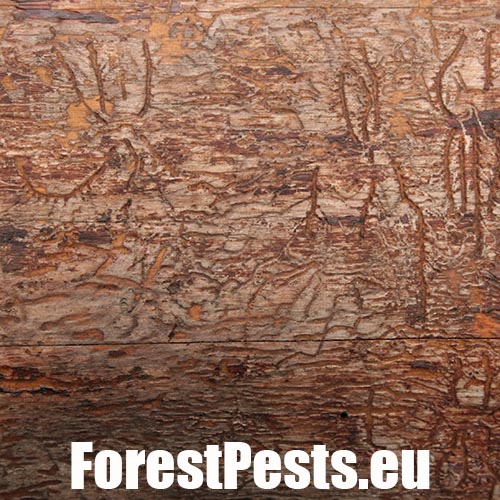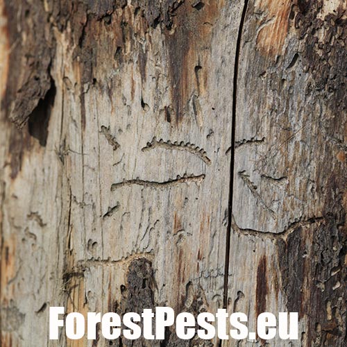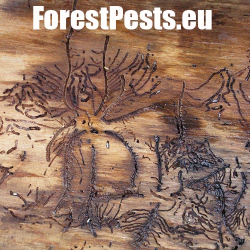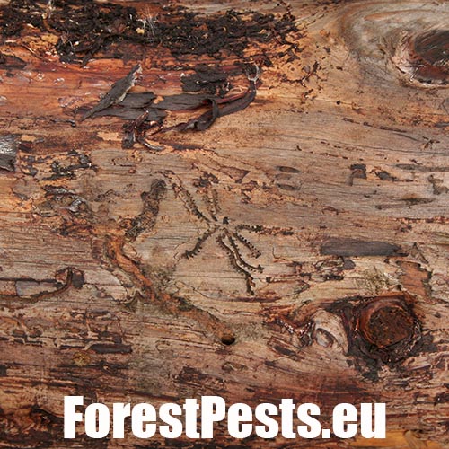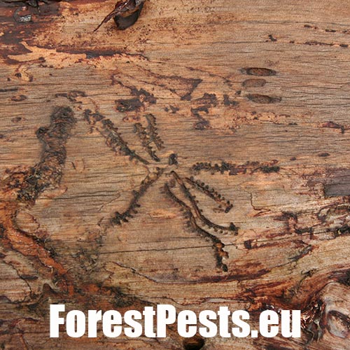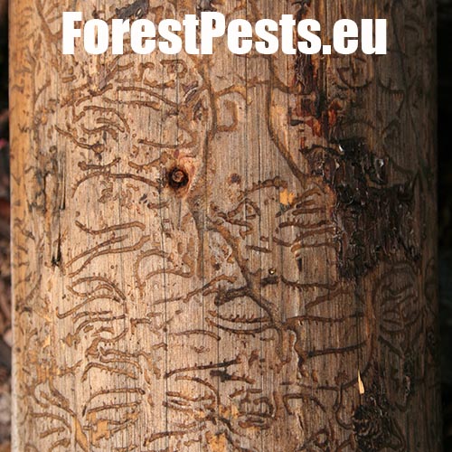 The beetle’s body is short, cylindrical, brown-black (black pronotum, brownish elytra) and glossy. This beetle is rather small for bark beetles, being only 1.6–2.8 mm long. The adults of the first generation occur in spring – April and May. The male is joined in the nuptial chamber by 3–6 females that, after mating, bore radial star shaped maternal galleries. The nuptial chamber is hidden in the bark and is not visible in the wood, which makes the insect galleries distinct from those of similar species. There are 2 or 3 generations in a year. The pest invades thinner barked trunks, branches and tops of felled, windthrown or weakened trees. In case of outbreak it may become a primary killer of even healthy trees in stands aged between 10 and 40 years. Often shares its habitat with the eighttoothed spruce bark beetle.