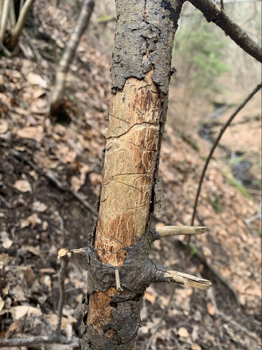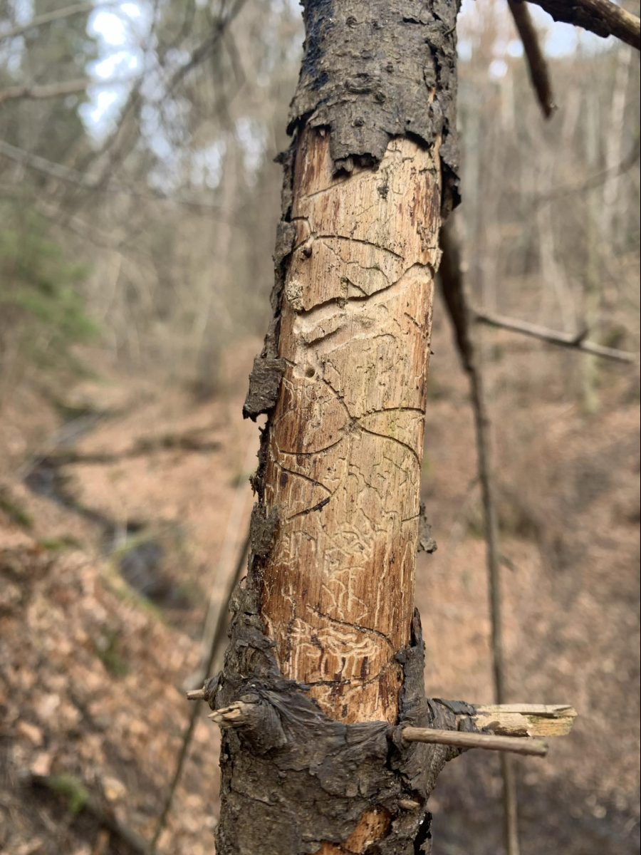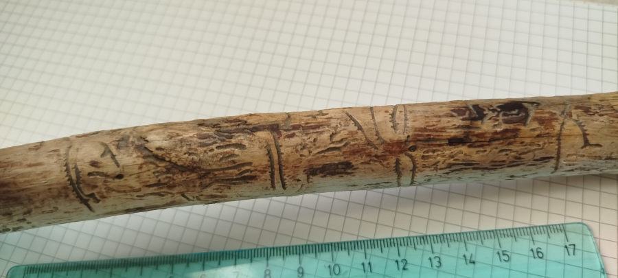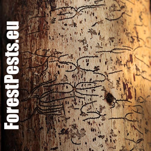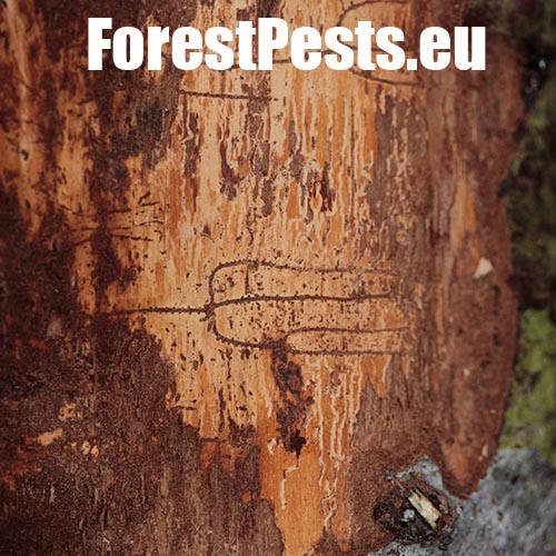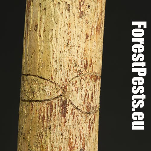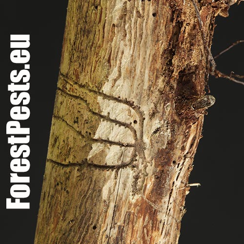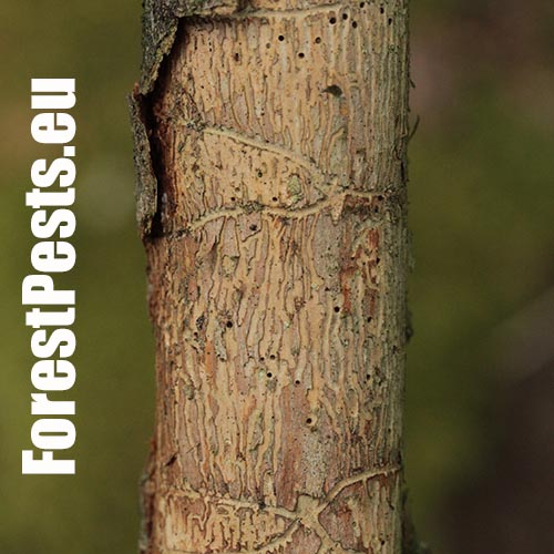 The adult is 1.7-2.2 mm long beetle. Its life-cycle is similar to that of silver fir bark beetle. Similar is also its gallery system, in which the maternal galleries are just somewhat narrower. The feeding trace has a shape of the regular capital block letter X. European fir engraver beetle looks for the branches and the tops of older, withering fir trees. It attacks them along with other species of this genus and infested trees can die within few years.