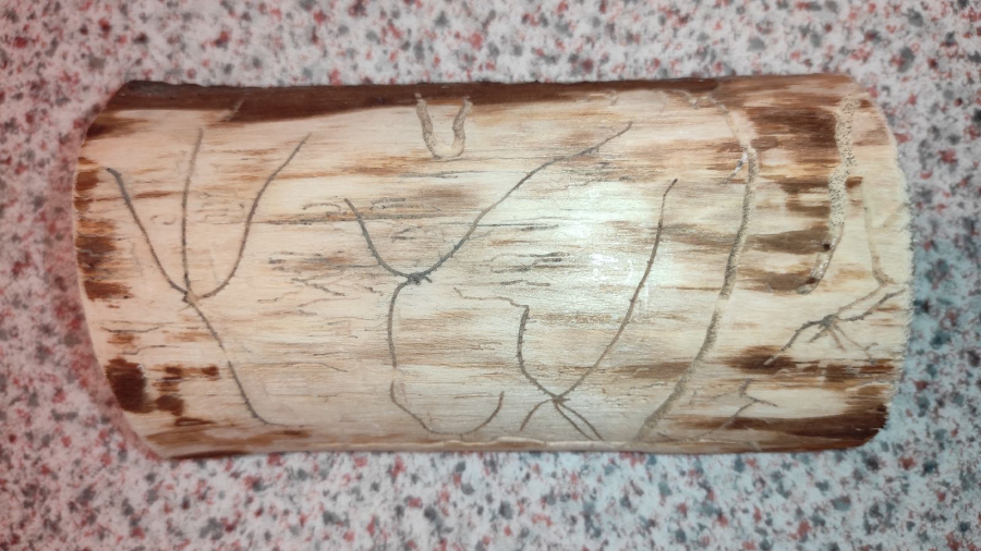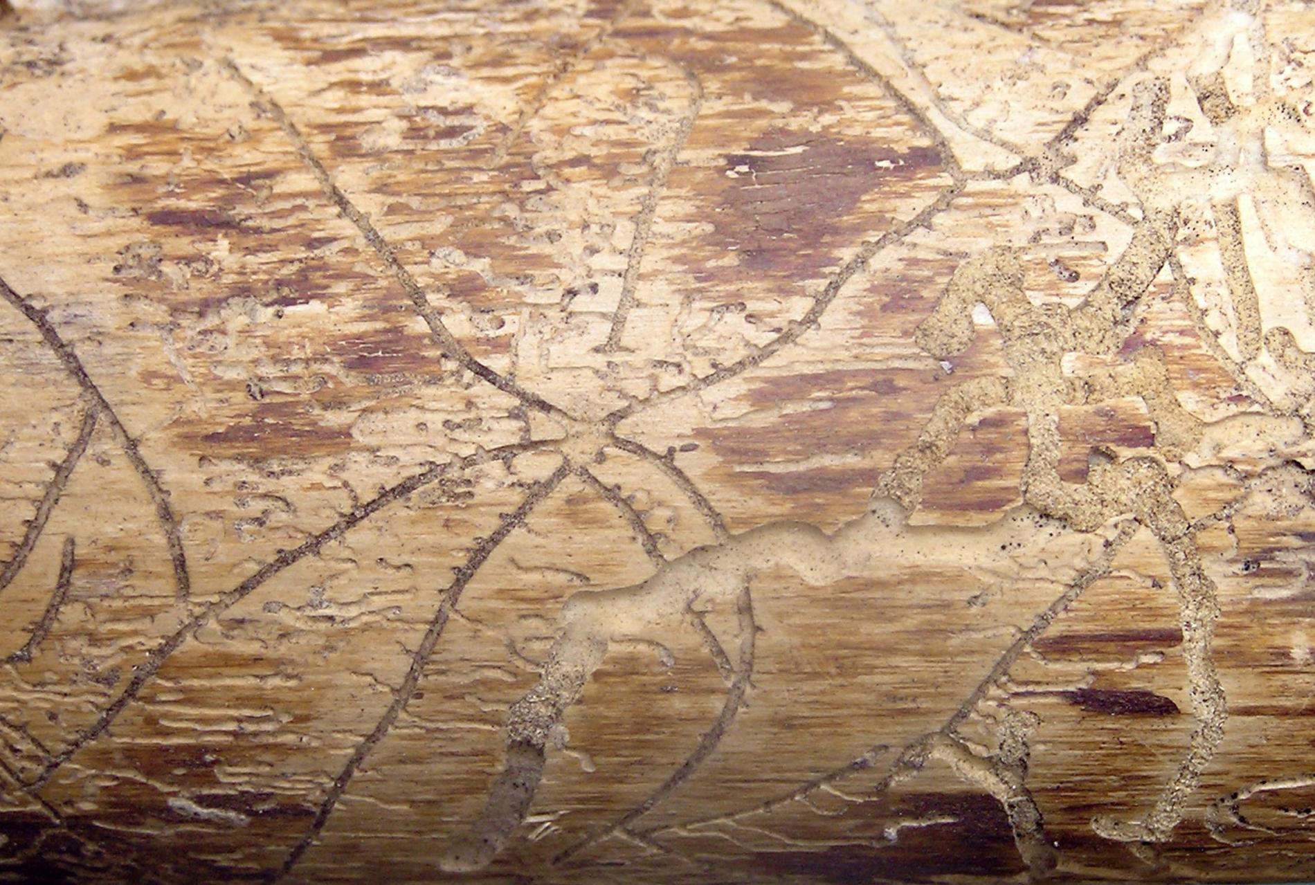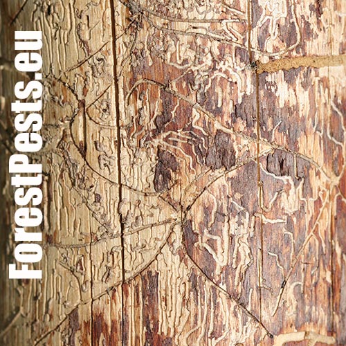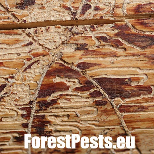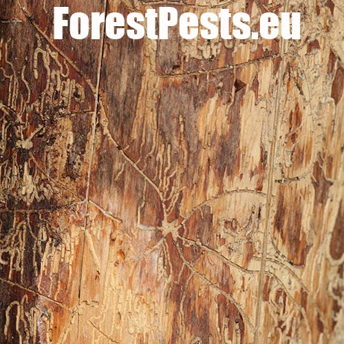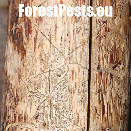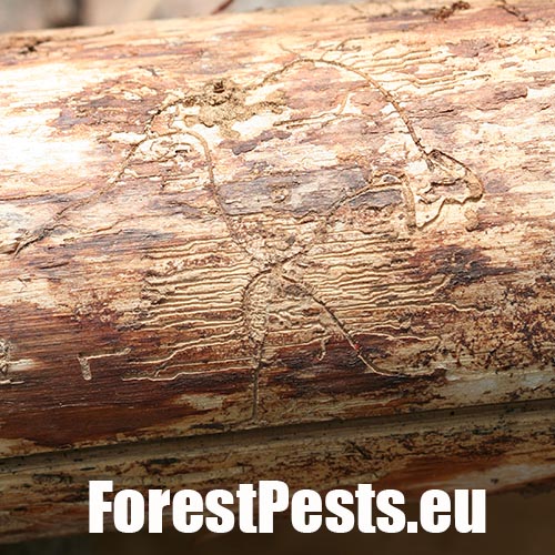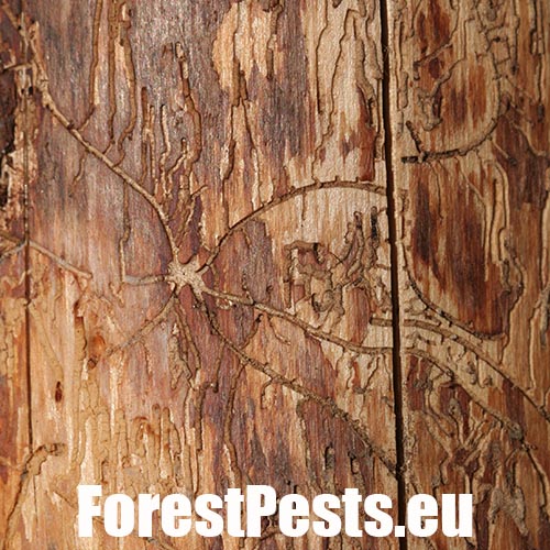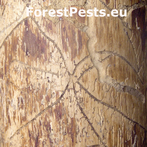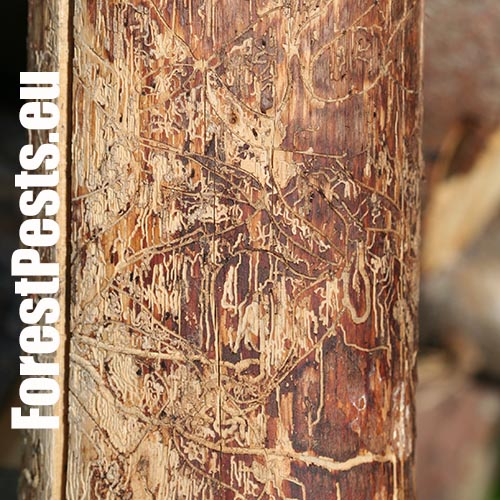 Galleries are deeply cut into sapwood. The larval tunnels are quite dense and regular. Nuptian chamber is good visible in the wood.