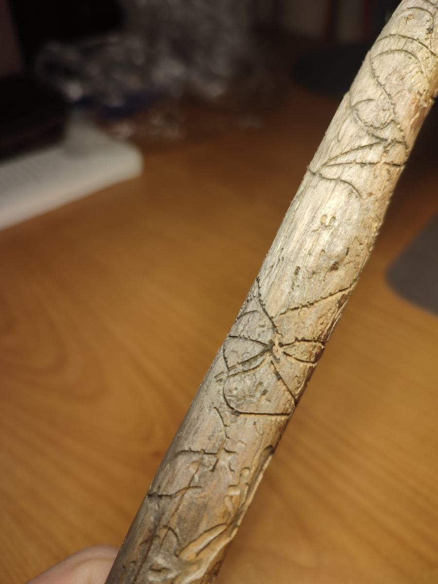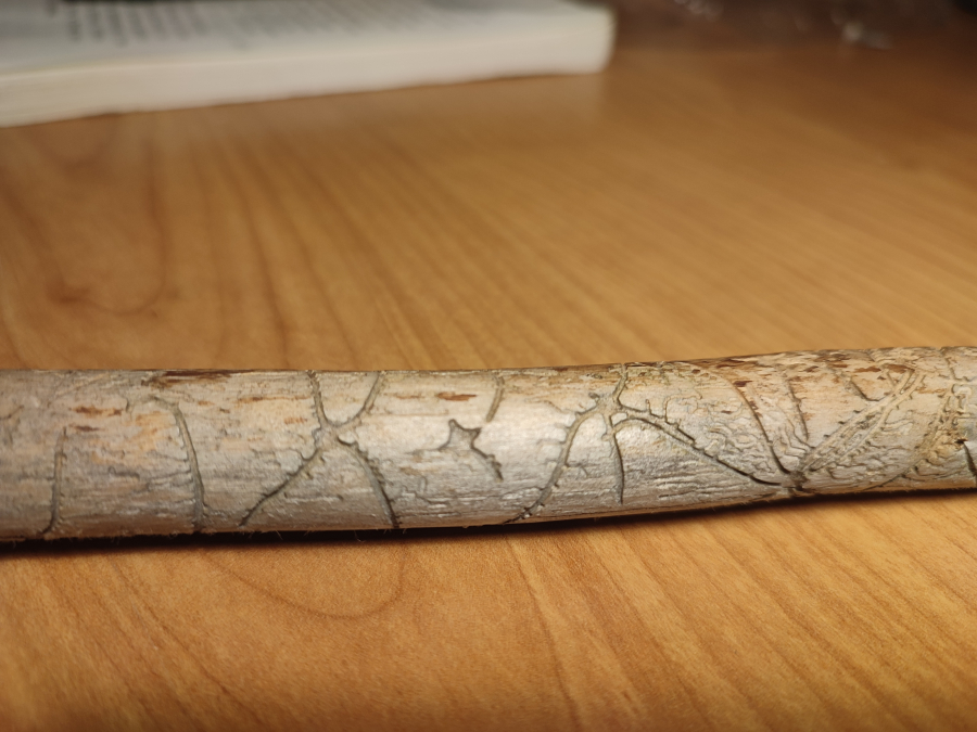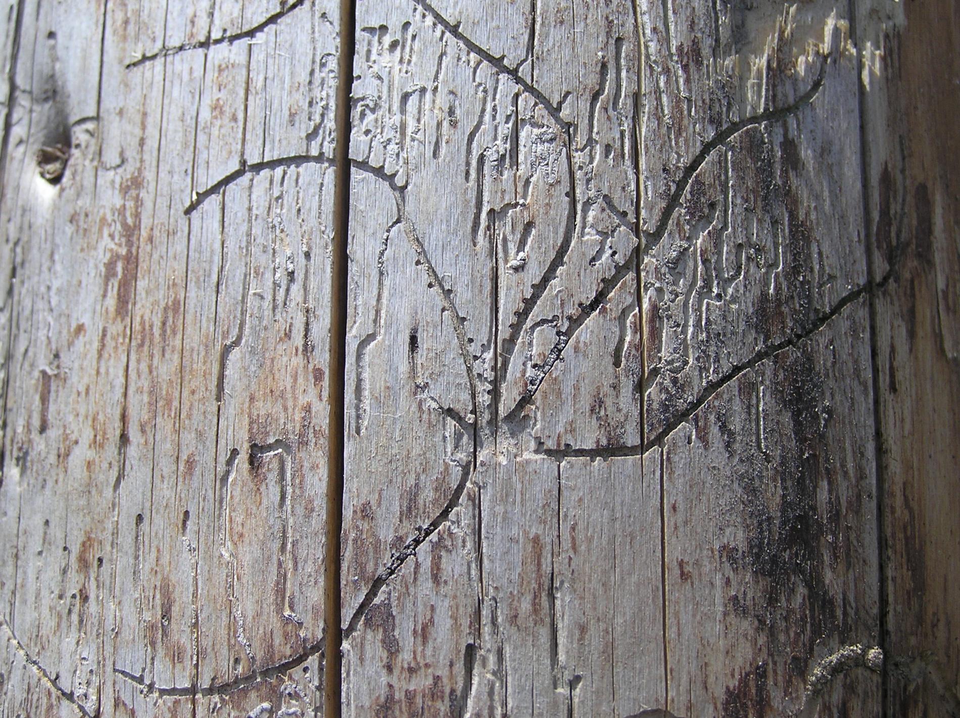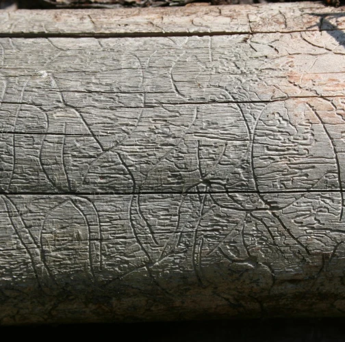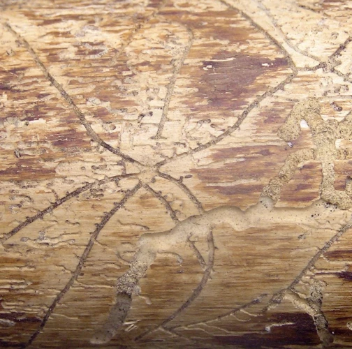 Galleries are deeply cut into sapwood. The larval tunnels are quite dense and regular. Nuptian chamber is good visible in the wood.