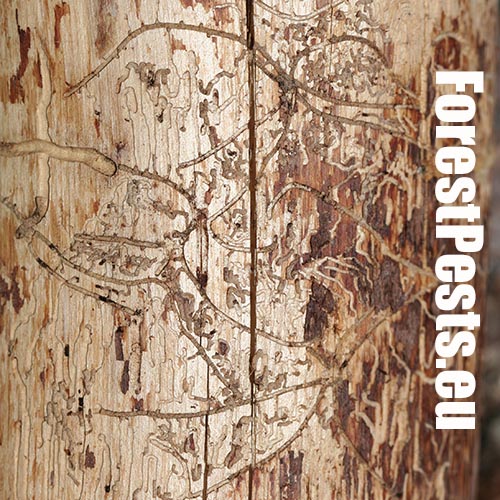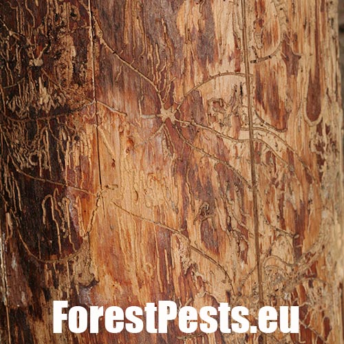 The adult is narrowly cylindrical, brownish-black, shiny, about 1.1-1.7 mm long. It swarms in spring, in April and May. About 3-8 females (usually 5-7) follow the male into the nuptial chamber and excavate star-shaped egg chambers after fertilization. The egg chambers are usually relatively long, not rarely 12-15 cm in length. Galleries are deeply cut into sapwood. The larval tunnels are quite dense and regular. It has two generations per year, in mountains usually only one. Damaged trees change the colour of their needles, especially on the most colonized branches which gradually die. In case of intensive attack, the bark falls off.