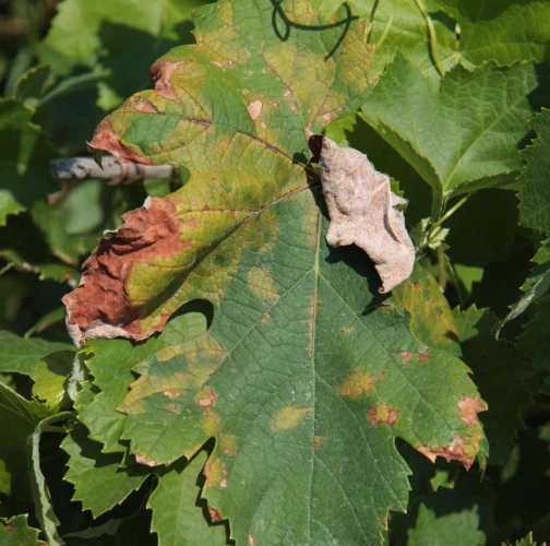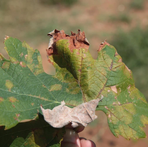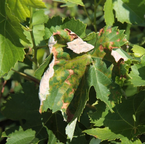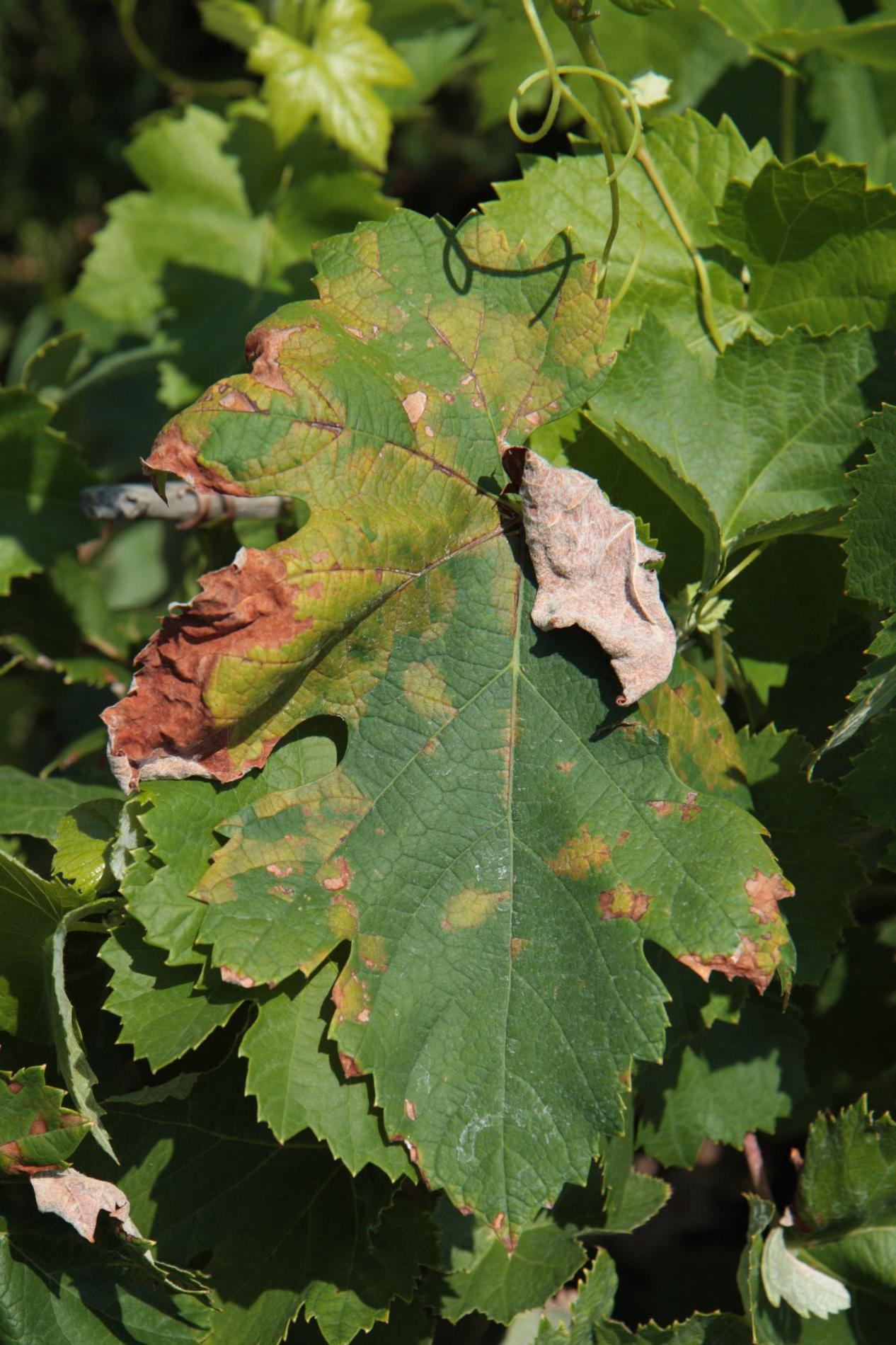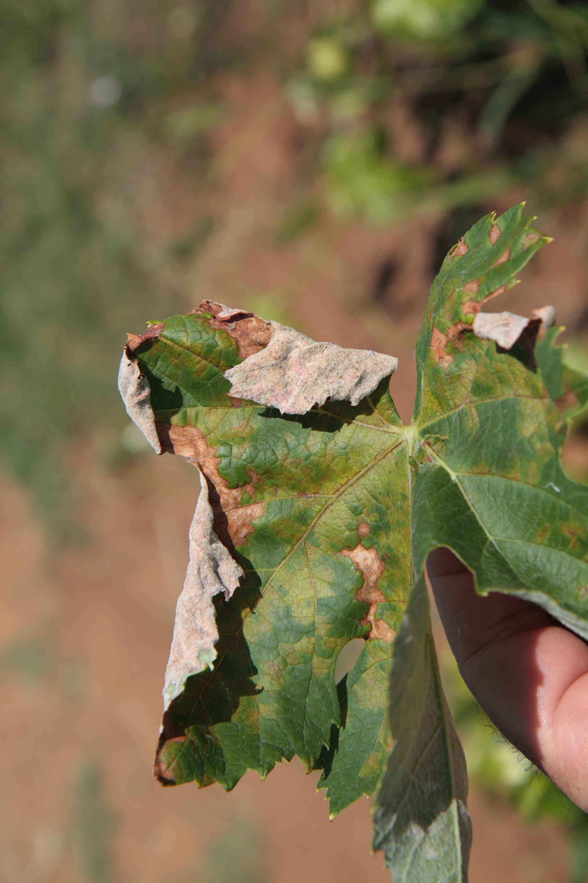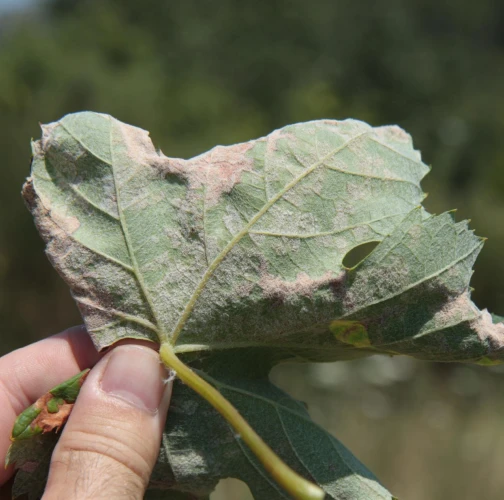 The primary symptom of grapevine downy mildew is the appearance of yellow to brown spots on the upper leaf surface, often described as "oil spots." On the underside of the leaf, especially in humid conditions, a white, downy mold becomes visible. The fungus can also infect young berries, causing them to brown, shrivel, and fall prematurely. Infected berries lose market value and become unsuitable for winemaking. Severe infections can lead to premature leaf drop, reducing photosynthesis and weakening the vine. Over time, this can negatively impact grape yield and the overall productivity of the vineyard. In comparison, powdery mildew thrives in dry, warm conditions and produces a powdery white coating, mainly on the upper surfaces of leaves and fruits. Downy mildew, on the other hand, prefers cool, wet conditions, resulting in yellow, oily spots on the upper side of leaves and a downy white growth on the underside.