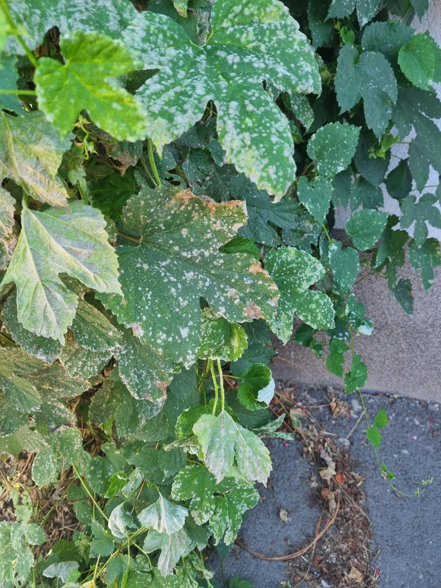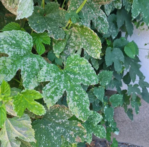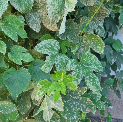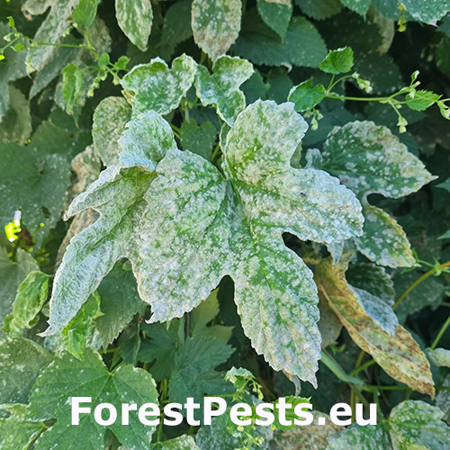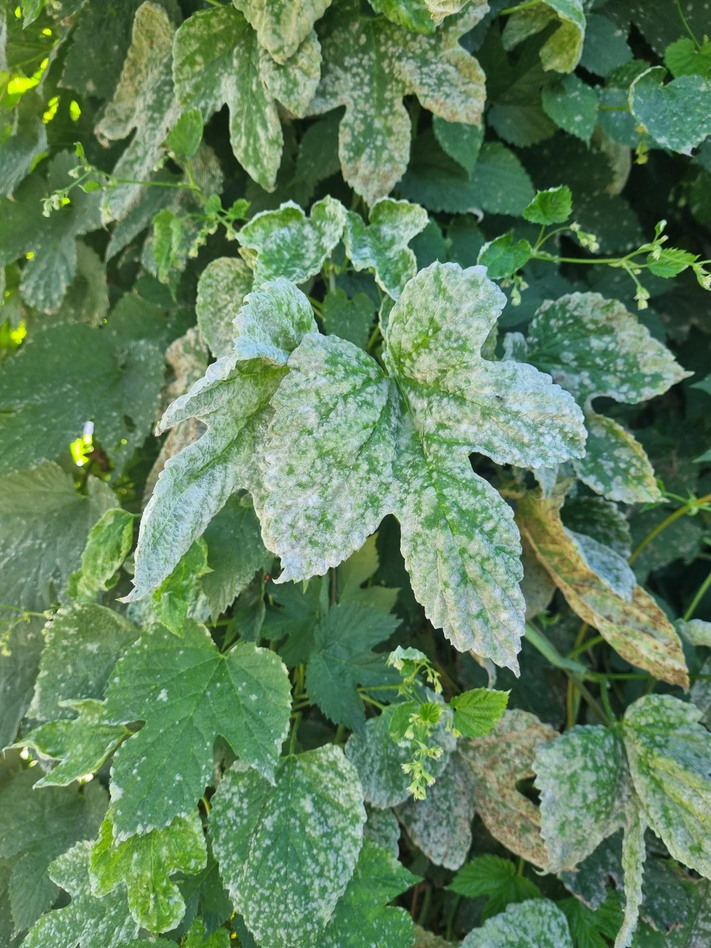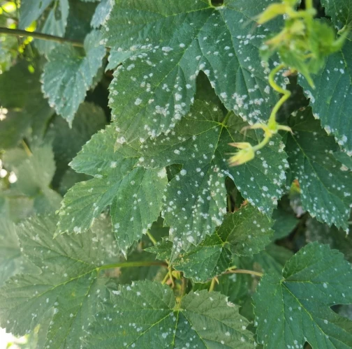 Podosphaera macularis is a fungal pathogen that causes powdery mildew on Humulus ssp., particularly hops (Humulus lupulus). It primarily affects the leaves, stems, and cones of the plant, forming white, powdery fungal growth. This disease can reduce photosynthesis, stunt plant growth, and impact the quality and yield of hop cones. The fungus thrives in moderate temperatures and high humidity but does not require free water to spread, making it a significant issue in hop-growing regions. Control methods include the use of resistant cultivars, fungicides, and proper spacing for airflow.