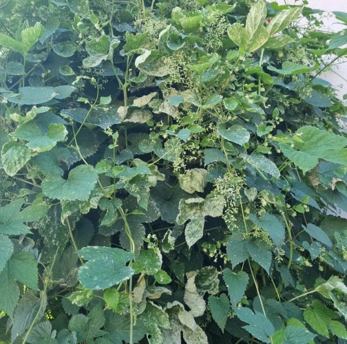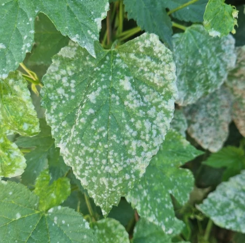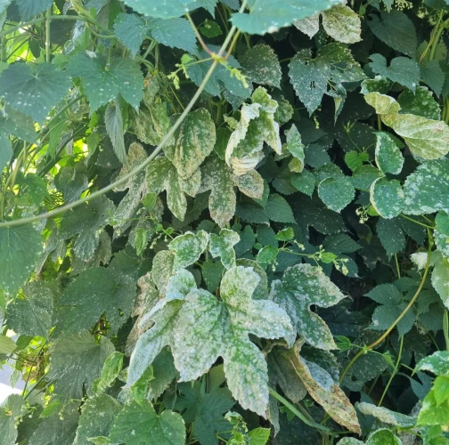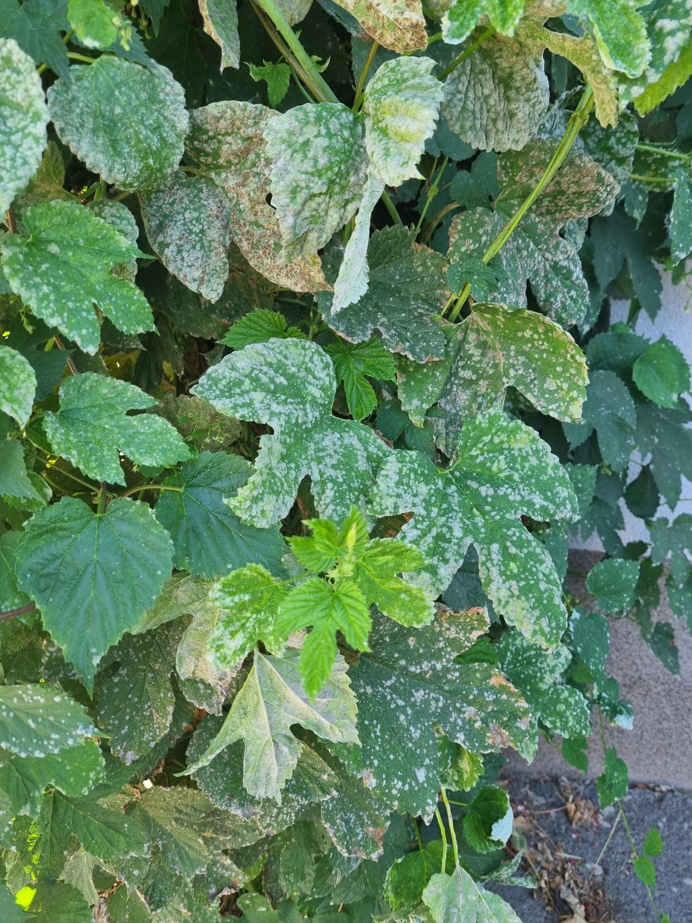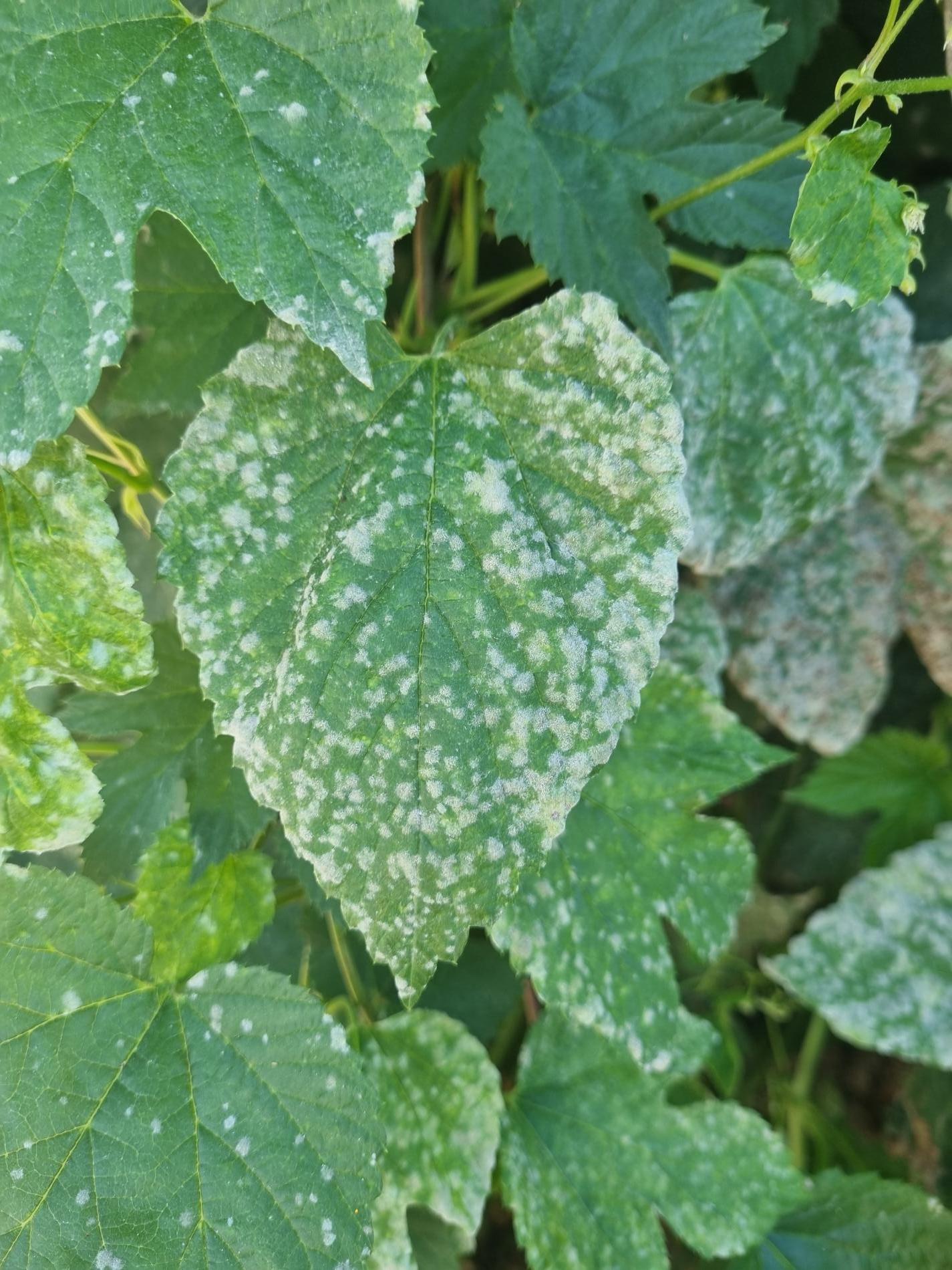 Podosphaera macularis is a fungal pathogen that causes powdery mildew on Humulus ssp., particularly hops (Humulus lupulus). It primarily affects the leaves, stems, and cones of the plant, forming white, powdery fungal growth. This disease can reduce photosynthesis, stunt plant growth, and impact the quality and yield of hop cones. The fungus thrives in moderate temperatures and high humidity but does not require free water to spread, making it a significant issue in hop-growing regions. Control methods include the use of resistant cultivars, fungicides, and proper spacing for airflow.