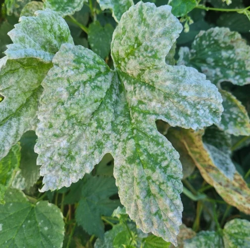 Symptoms of Podosphaera macularis on hops include white, powdery fungal growth on the upper surfaces of leaves, stems, and hop cones, leading to leaf distortion and reduced cone quality. Infected plants may show stunted growth and premature leaf drop.