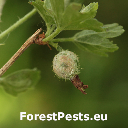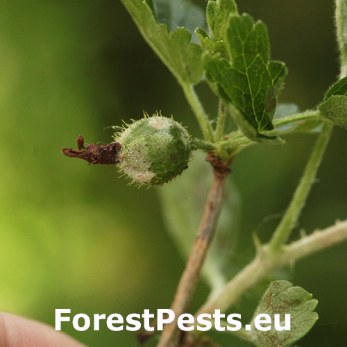 Podosphaera mors-uvae is a fungal pathogen responsible for American gooseberry mildew (or powdery mildew of currant), a destructive disease affecting gooseberries and currants. This fungus produces a characteristic white powdery coating on leaves, young shoots, flowers, and fruits. As the infection progresses, affected plant parts may deform, leading to a decline in overall plant health and reduced yields. The fungus thrives in warm and humid conditions and can persist throughout the growing season. It overwinters in infected plant tissues and spreads quickly in favorable weather. Podosphaera mors-uvae is particularly harmful to gooseberries, causing significant damage, while on currants, it primarily affects the tips of new shoots. Proper plant care, including regular pruning and the use of fungicides, is essential to prevent and control the spread of the disease. There are resistand cultivars of gooseberry and currant on the market.