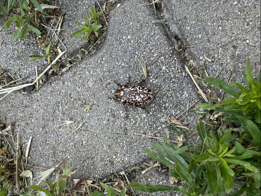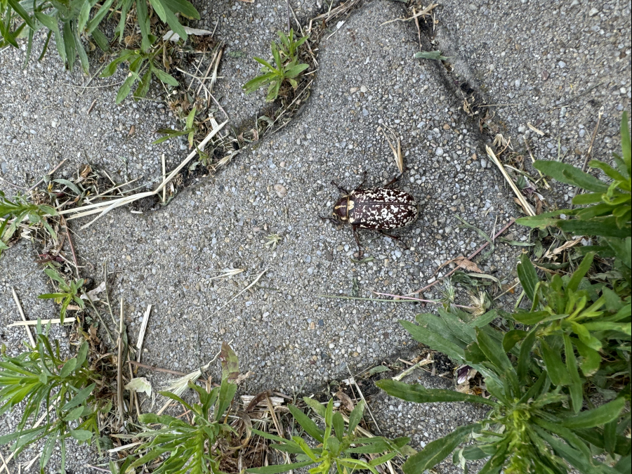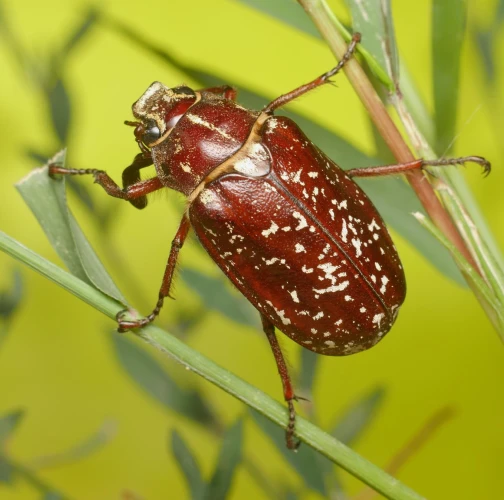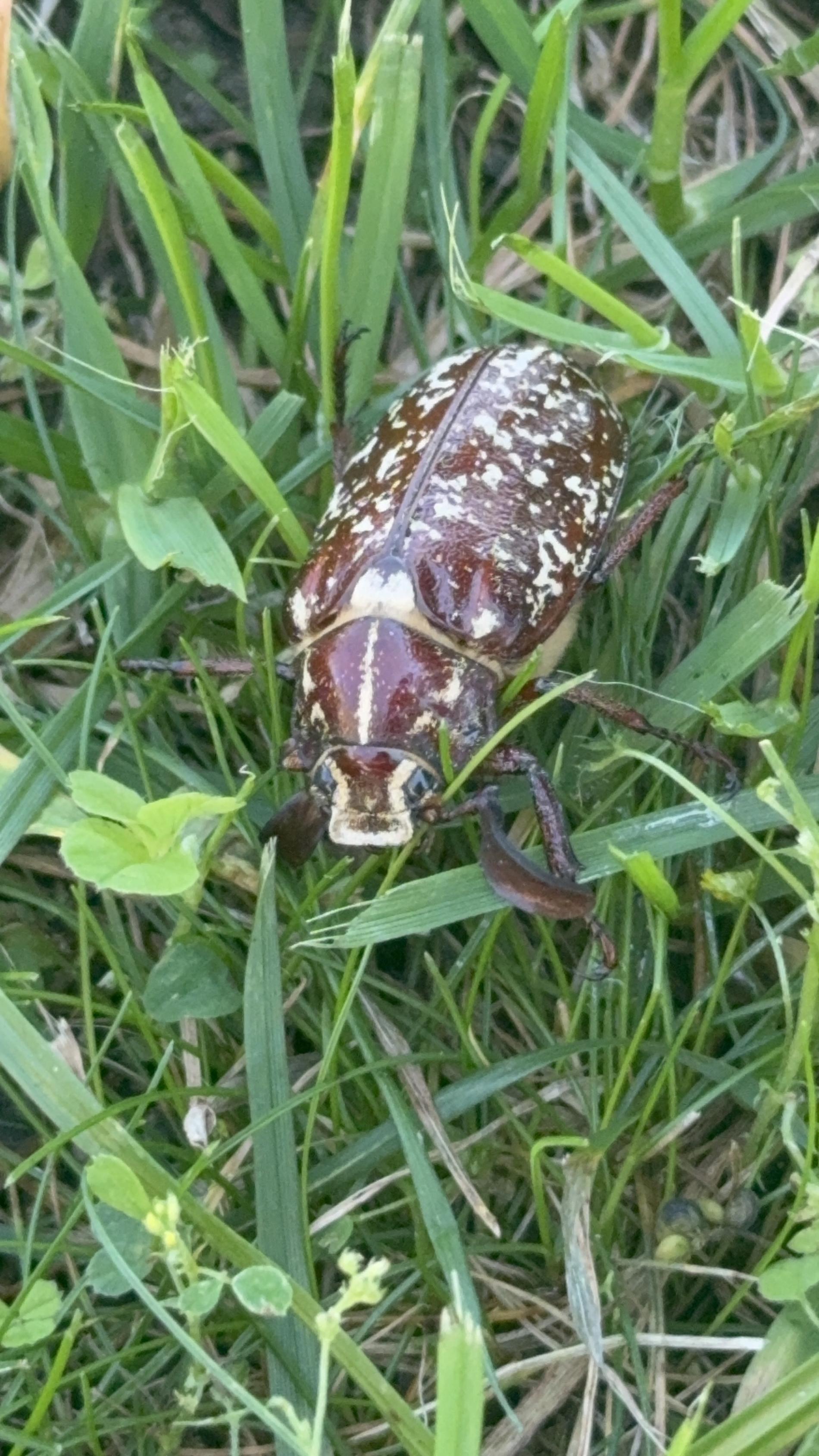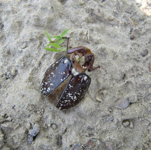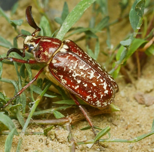 The larvae damage roots of herbs and trees. Adult is a large, brown beetle.