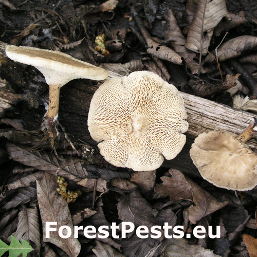 Presence of fruiting bodies with brown to brown-ocher cap, depth slightly scaly.