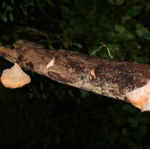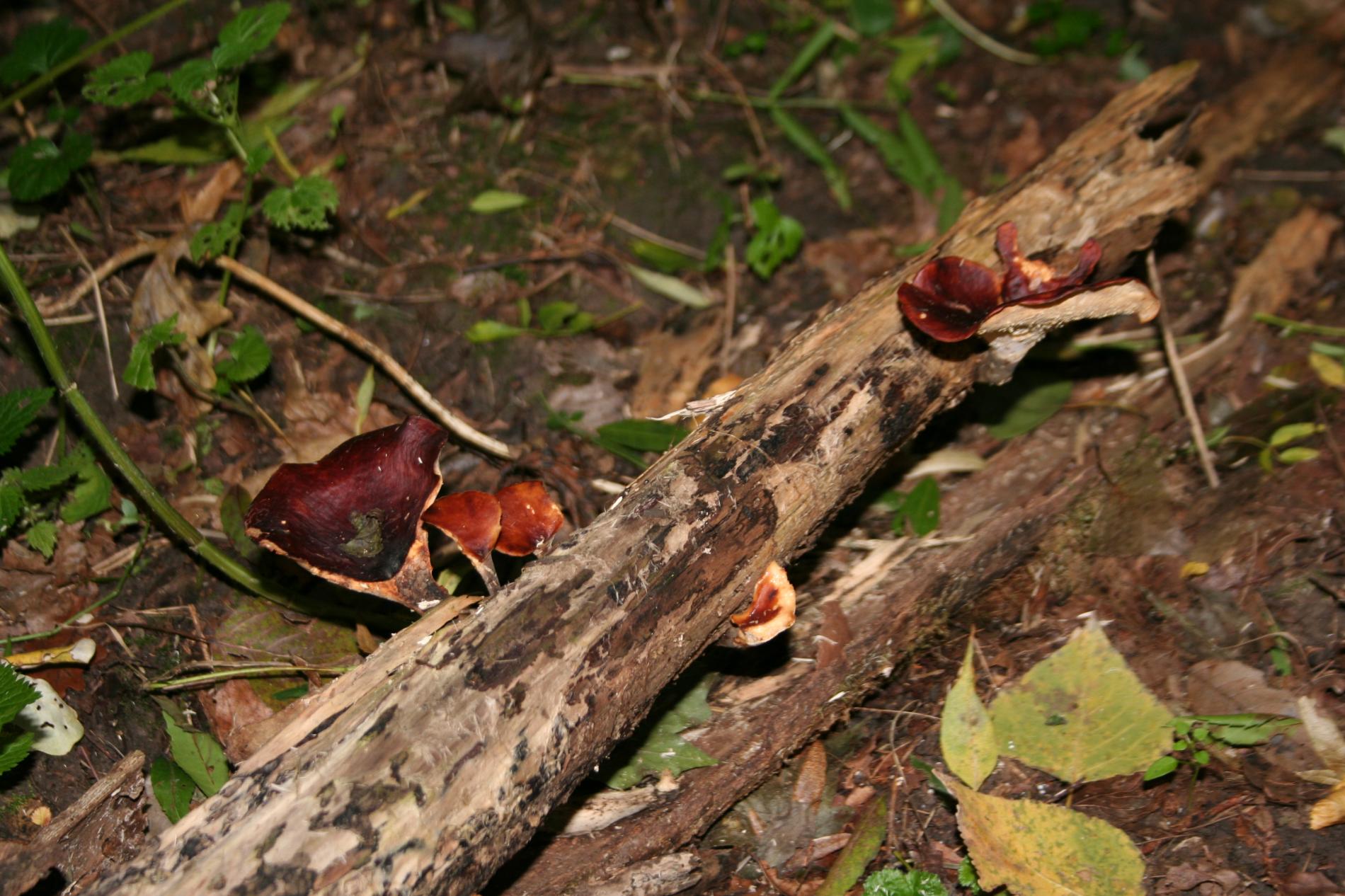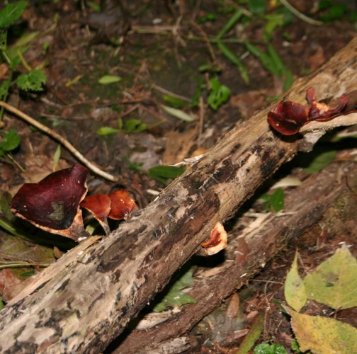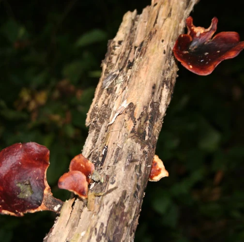 Presence of dark brown to dark red fruiting bodies on dead wood.