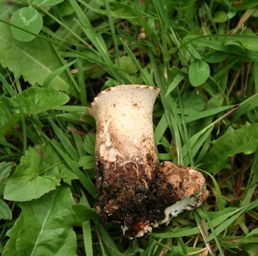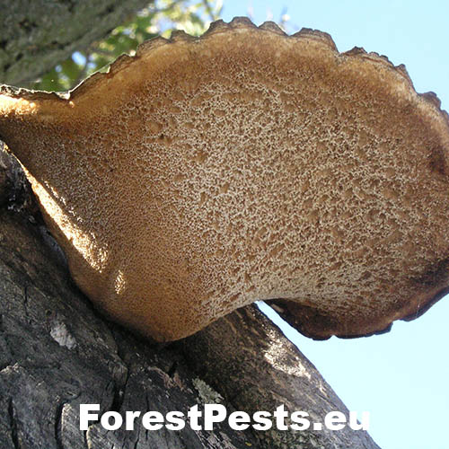 It is parasitic on deciduous trees, especially elm, beech and sycamore, causing intensive white rot. It grows from spring to summer, annual. Bracket is 5–60 cm across, 0.5–5 cm thick, initially circular or fan-shaped, ochraceous- cream covered in concentric dark brown fibrillose scales. Stem is 30–100 × 20–60 mm, lateral or occasionally off-centre, blackish towards the base. Flesh is 1–3 cm thick, succulent when fresh, drying corky, white. It smells strongly of meat. Tubes are 5–10 mm long, decurrent down the stem, white to creamy. Pores are 1–3 × 0.5–1.5 mm, irregular and angular, whitish to ochraceous-cream. Spores are white, oblong-ellipsoid, 10–15 × 4–5 μm.