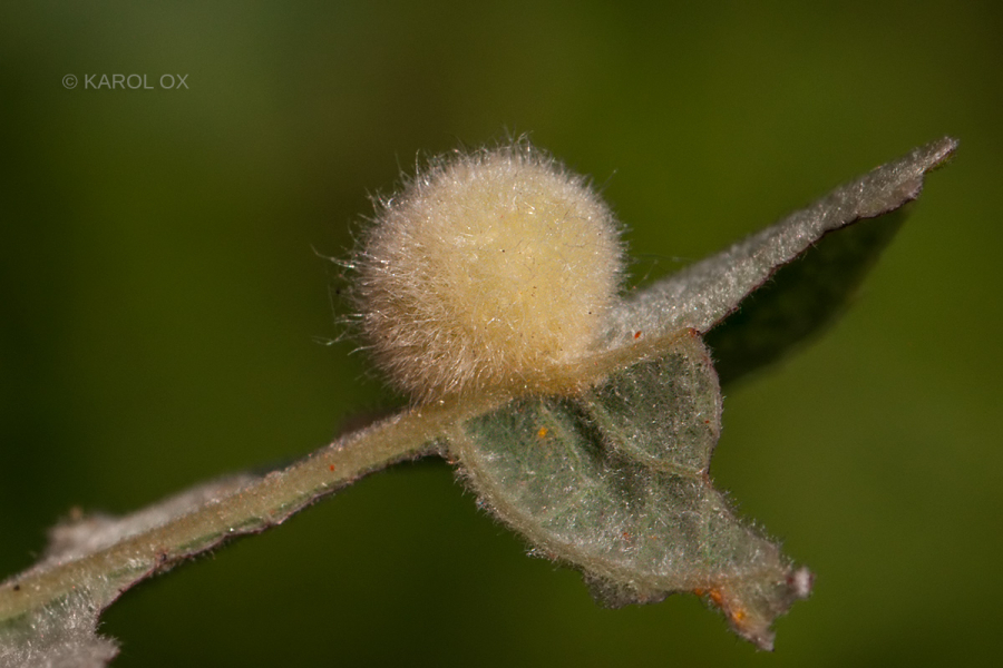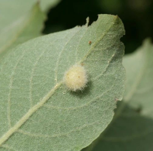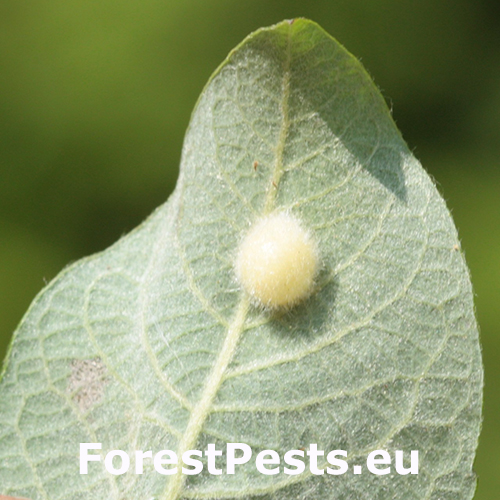 This gall sawfly causes more or less globular, light greenish, densely hairy galls (ca. 4–5 mm in diameter) on the underside of the leaf.
