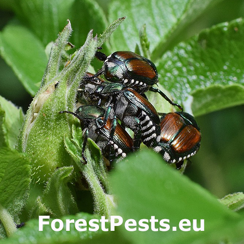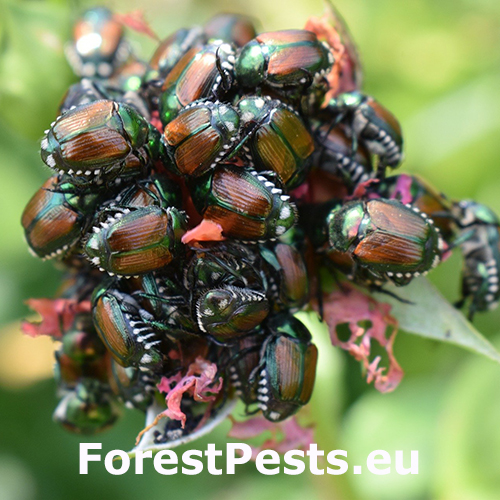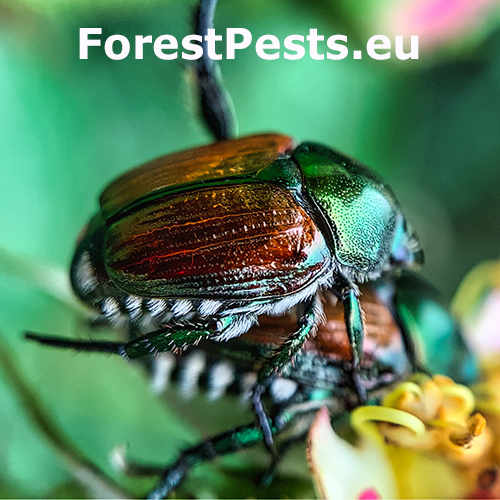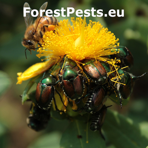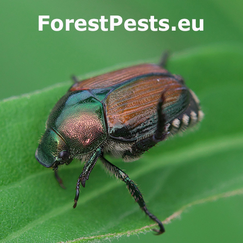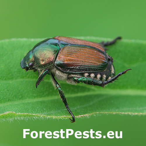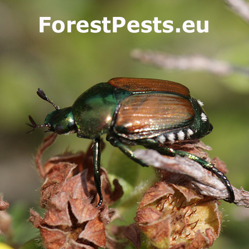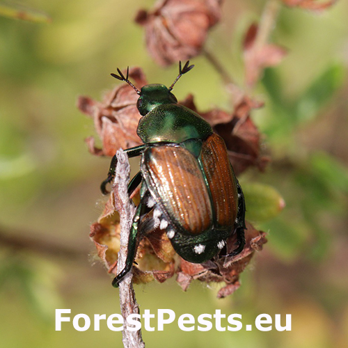 This is a species of scarab beetle. The adult measures about 15 mm. It has iridescent copper-colored elytra and a green thorax and head. It comes from Japan. It is not very dangerous and does not cause damages in Japan, where it is controlled by natural predators. However, in North America and Europe, where it was artificially introduced, it is a noted pest of many tree species. The adult beetles damage plants by skeletonizing the foliage and damaging fruits. Larvae feed on the roots of grasses and other plants.