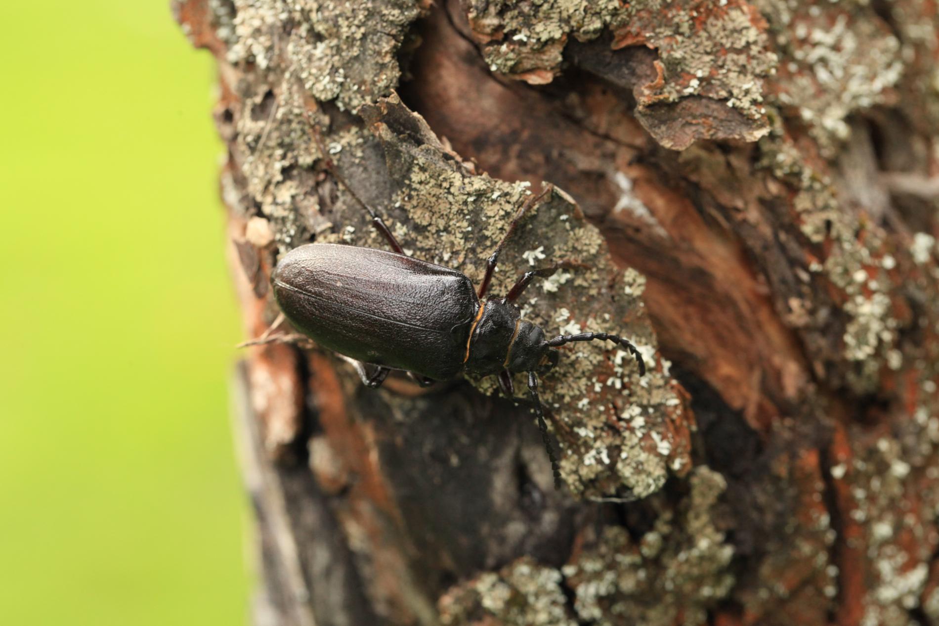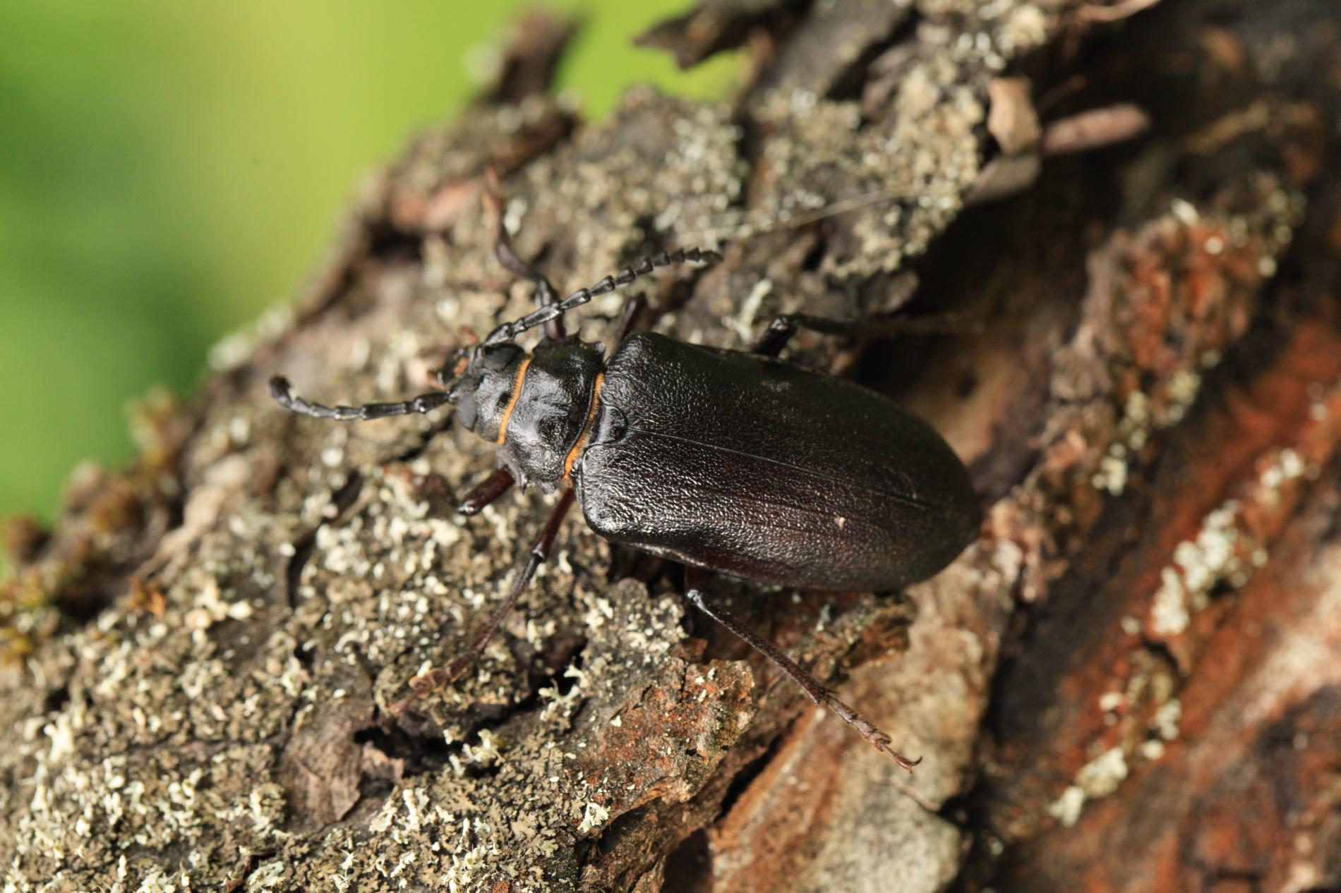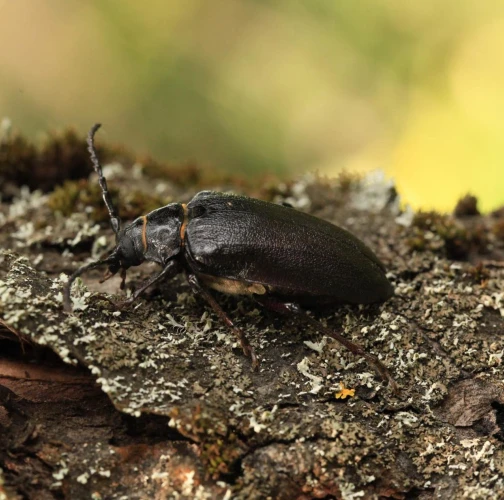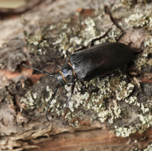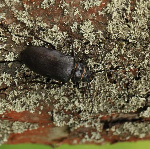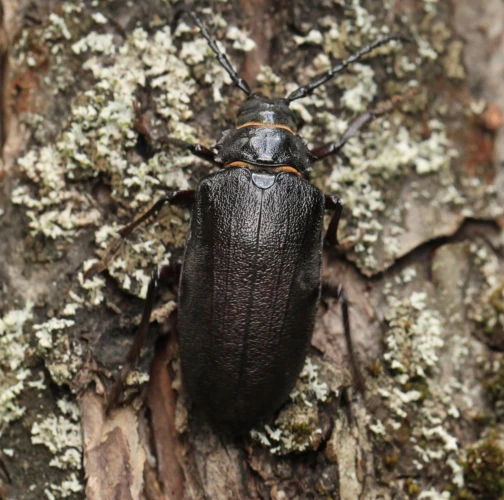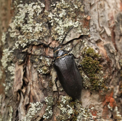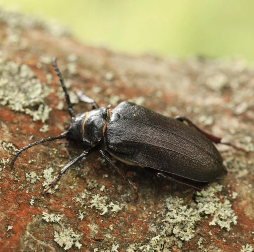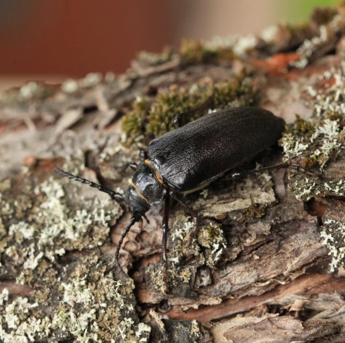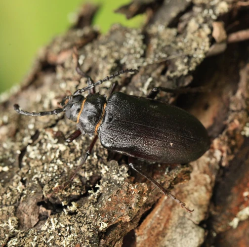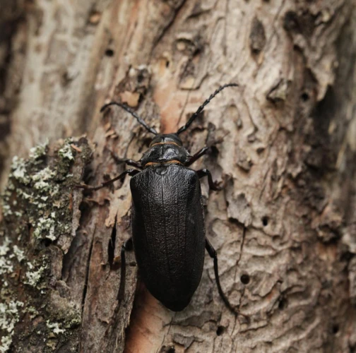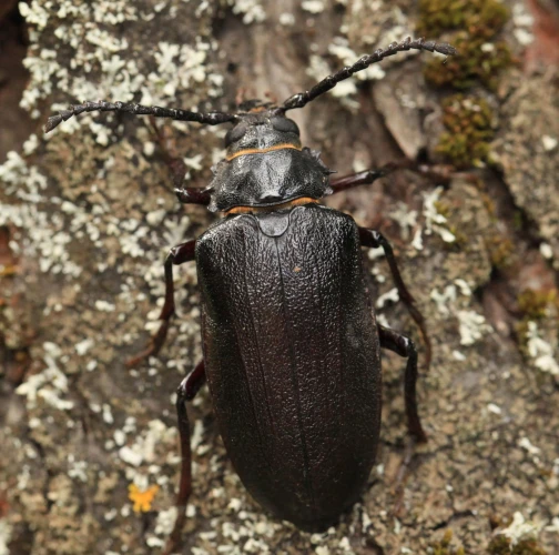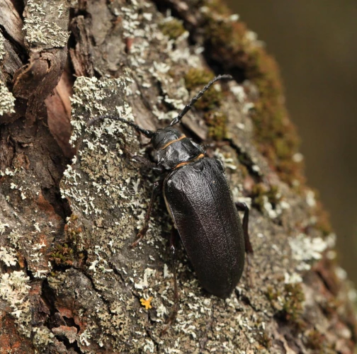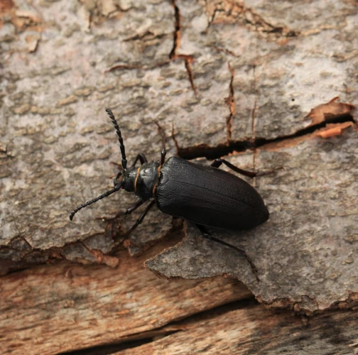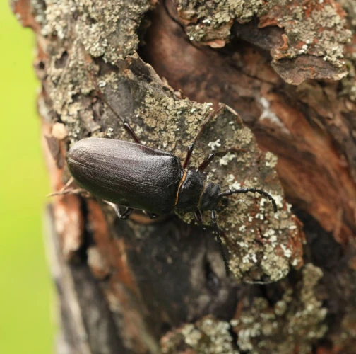 The tanner beetle Prionus coriarius is a beetle from the family Cerambycidae within the order Coleoptera. It is known for its impressive size, reaching lengths of 18–45 millimeters, making it one of the most massive beetles in Europe. Females are larger than males. The body of P. coriarius is shiny and dark brown to black.This beetle is polyphagous and typically develops in dead and decayed wood of both deciduous and coniferous trees. The larvae feed on rotten wood, contributing to its decomposition, rather than attacking live trees. The life cycle of Prionus coriarius lasts at least 3 years. Adults are most commonly observed from July to September.