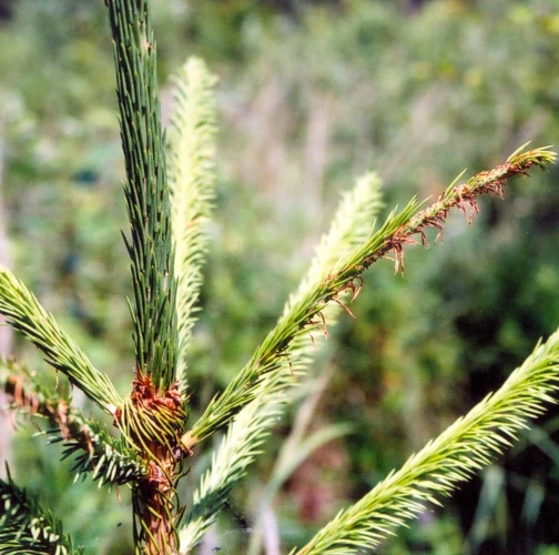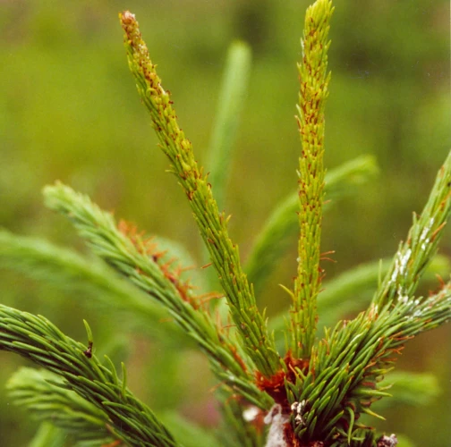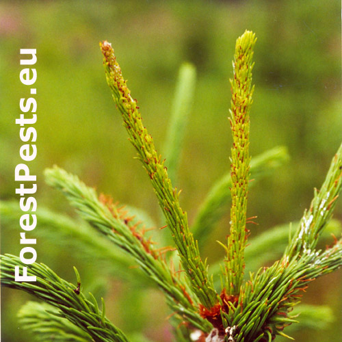 A black-and-yellow sawfly with transparent membranous wings. The female body length is around 5-6 mm and its wingspan is 9-14 mm. Males are a bit smaller. Its swarming period is already in late April. The females lay eggs singly in sprouting needle buds. One female can lay as many as 100 eggs, with larvae hatched after 5 days. Green in colour, they grow to a size of about 15 mm. The pest attack occurs in form of foliage degradation in upper parts of tree canopy. Needles on the infested twigs turn rusty brown and eventually fall off, leaving the twigs bare. The larvae feed only on fresh seasonal needles and avoid older foliage. The sawfly is more common in younger stands of up to 20-30 years.
