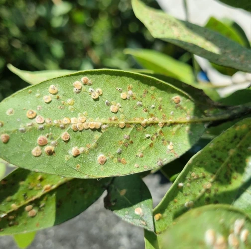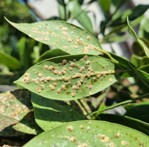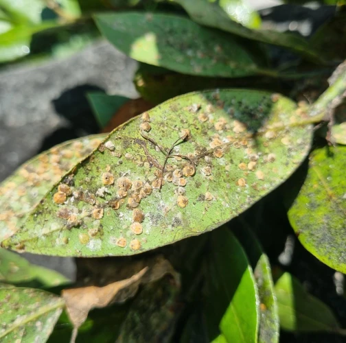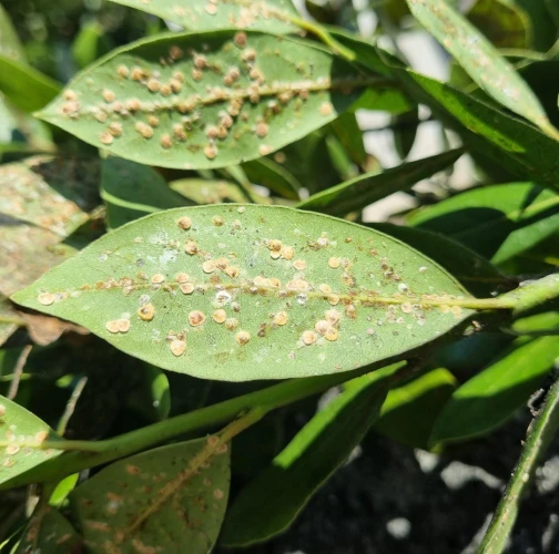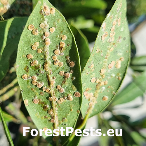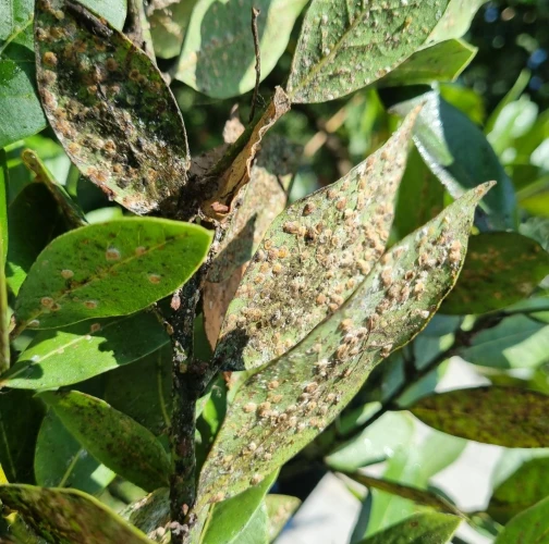 Sticky leaves, sooty mould development, presence of round-shaped scales on shoots and leaves.