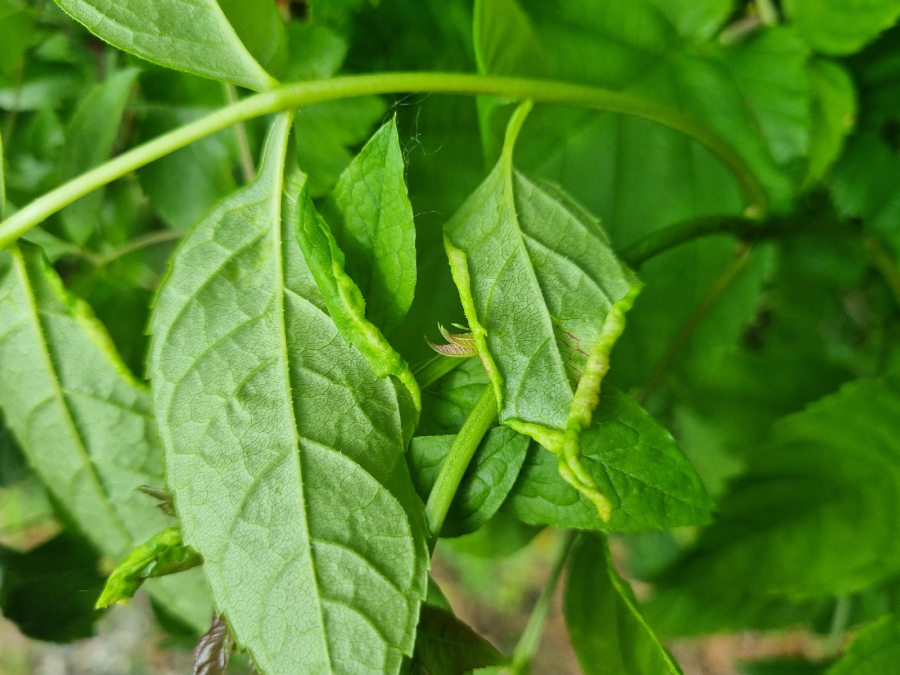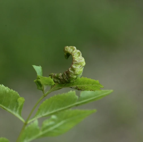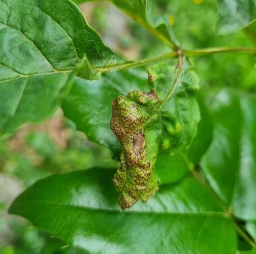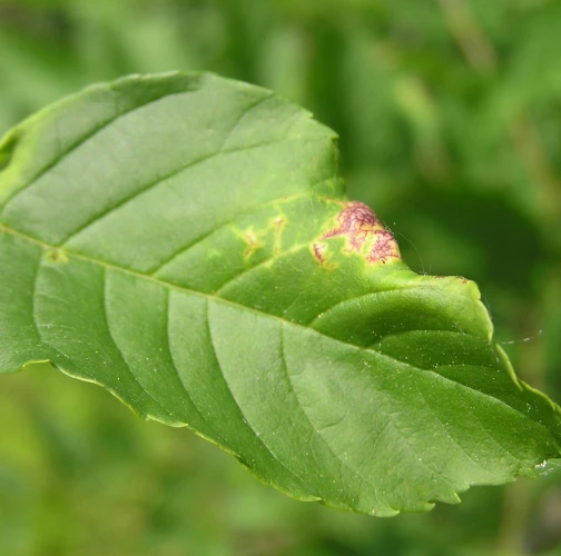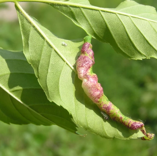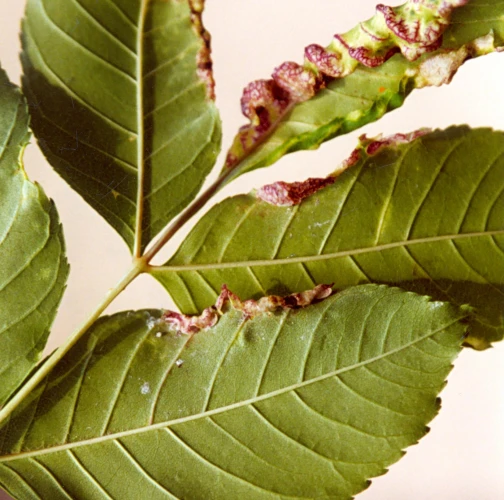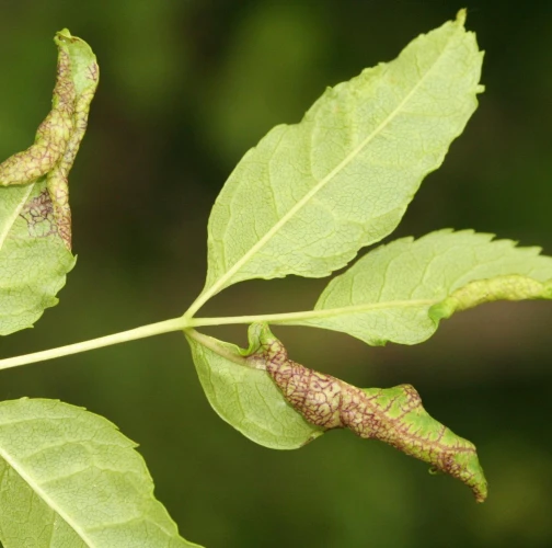 The leaf edges are galled, rolled in spirals downwards, with swellings and a fleshy red discolouring. The pest is a small insect, a few millimitres in size, with two pairs of membranous wings.