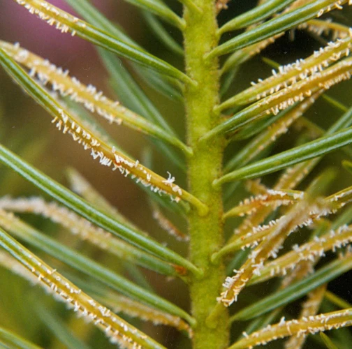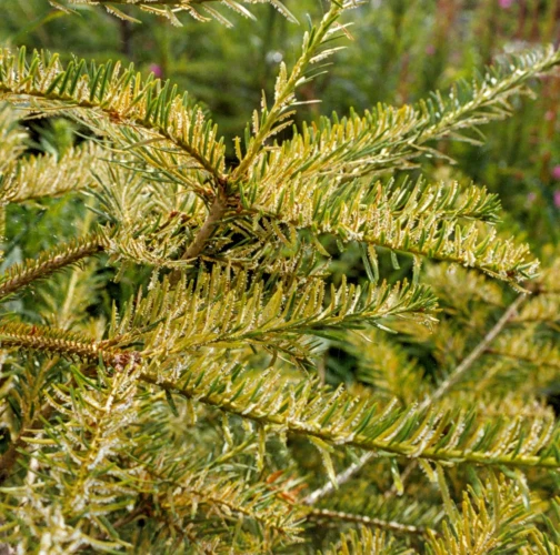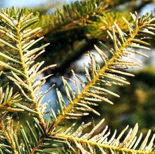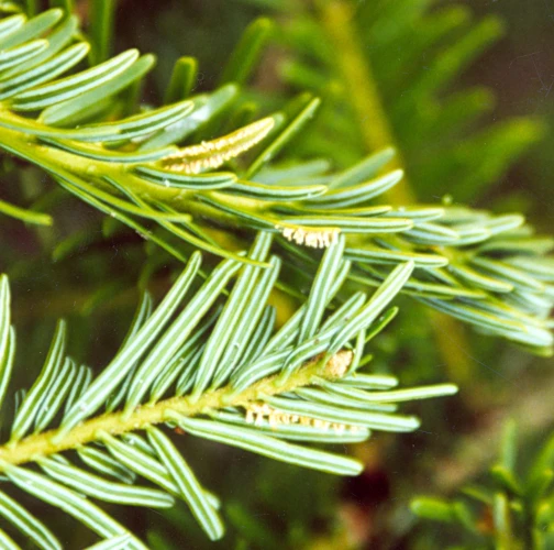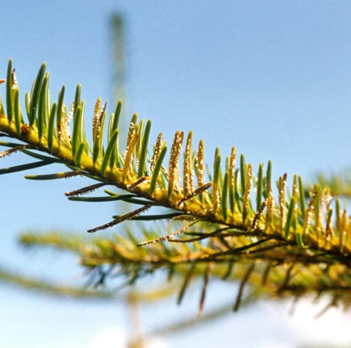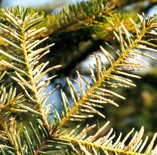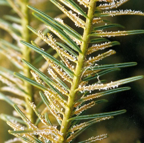 The underside of the needles of the fir trees are covered with yellowish or orange aecia. They are elongated, about 1 mm long. Very good visible even from the distance of several meters.