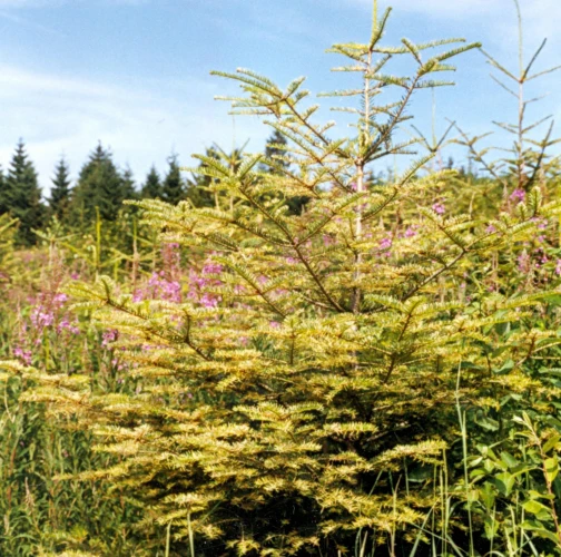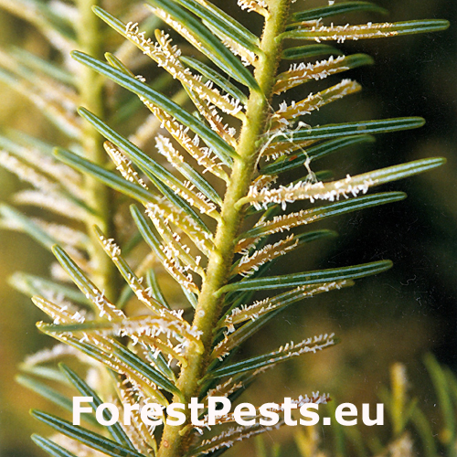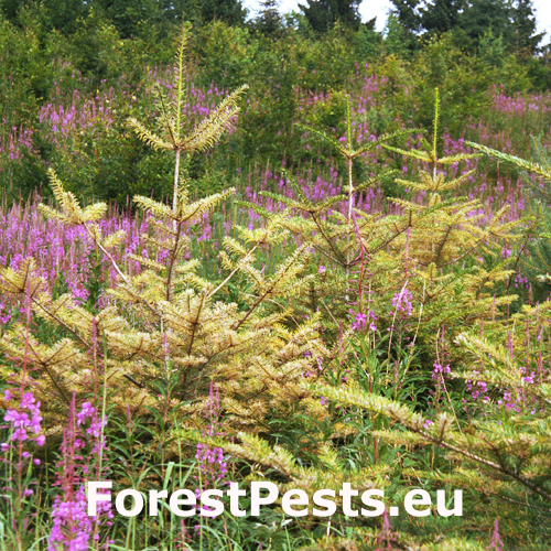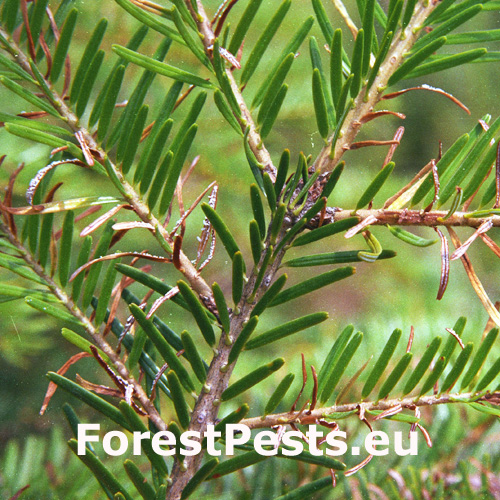 The underside of the needles of the fir trees are covered with yellowish or orange aecia. They are elongated, about 1 mm long. Very good visible even from the distance of several meters.The occurs in the summer time on the more wet stands with occurrence of the  alternate host - willow herb Epilobium spp. The needles of infeceted trees turns yellow as season progress. The protection lies mainly in mechanical removal of willow herb from the neighborhood of fir trees. The second alternative is a chemical protection of needles just in bud by the contact fungicide in the spring season. However, the nature itself usually takes care of effective protection e.g. from the phenology point of view, the forming of basidiospores is not harmonized with the budding of fir trees and in the end, infection does not arise without protective measures either.