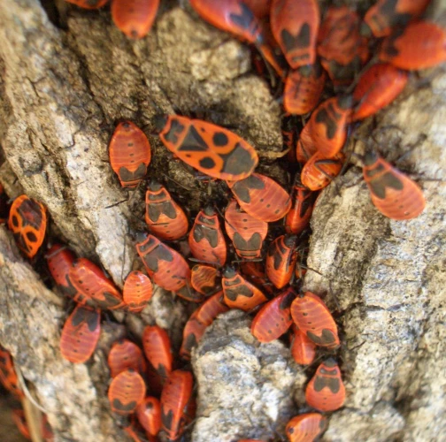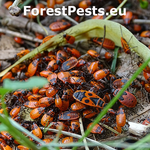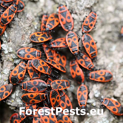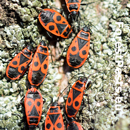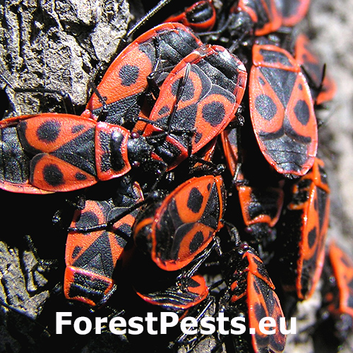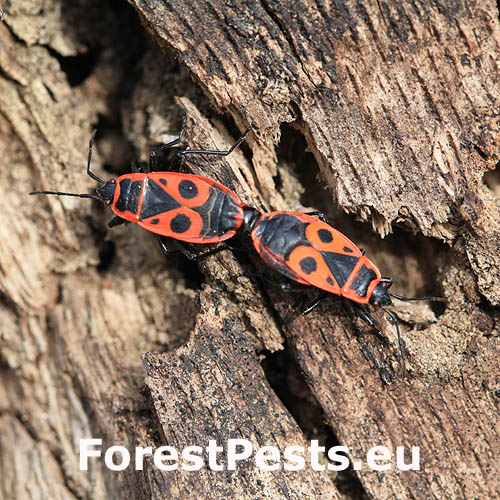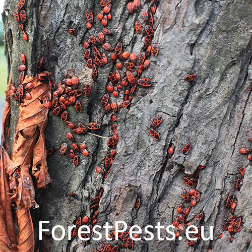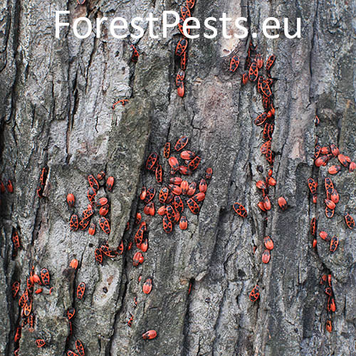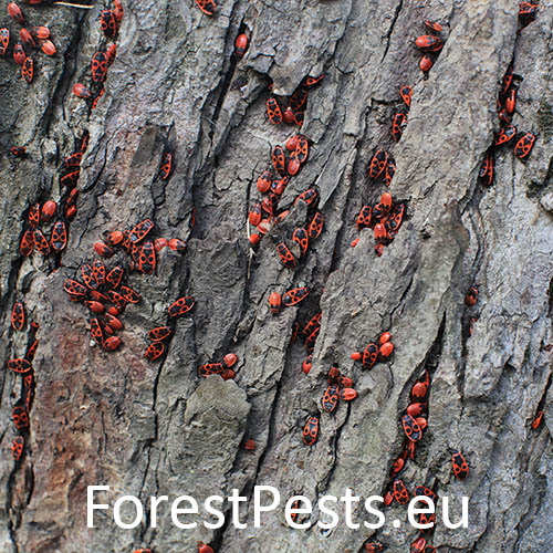 In spring, the colonies of firebugs, which overwintered under the bark, or in other places, bask on walls, rocks and tree trunks, especially on lime trees. The colonies cannot be overlooked due to their red color. They have only short atrophied elytra with a noticeable red pattern, slightly different in every individual. They like to feed on juices flowing out of tree wounds and on young, especially lime, sprouts. They are common in parks, gardens and alleys.