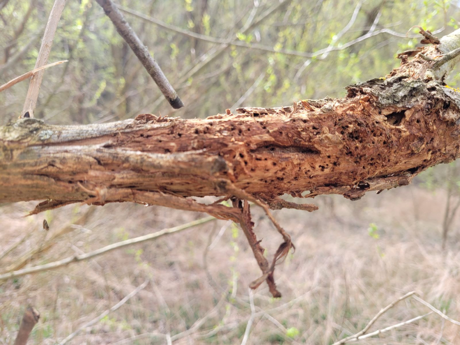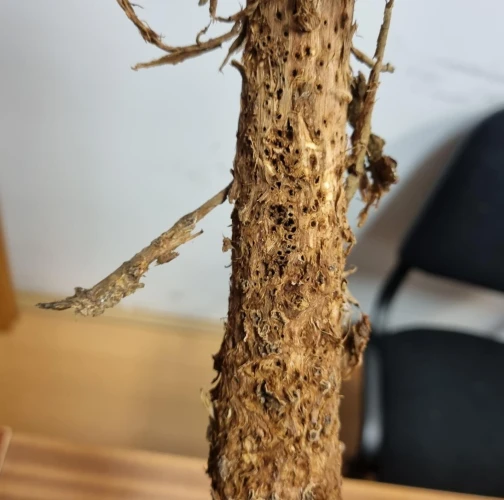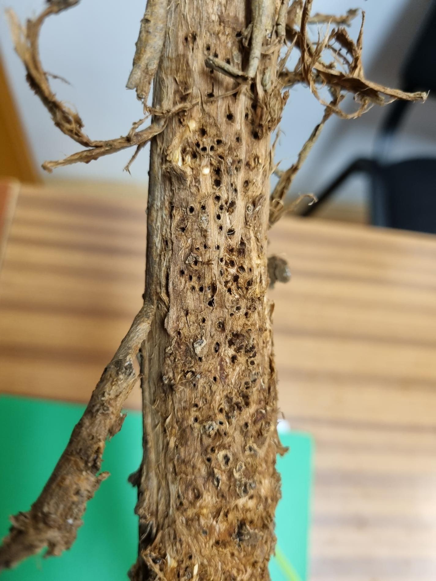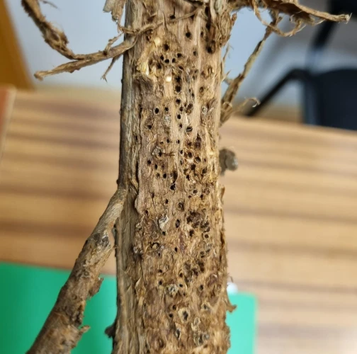 Affected trunks swell and peel, showing a typical shothole-like damage.