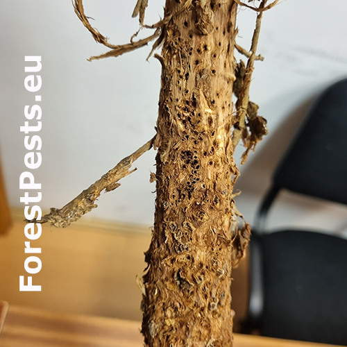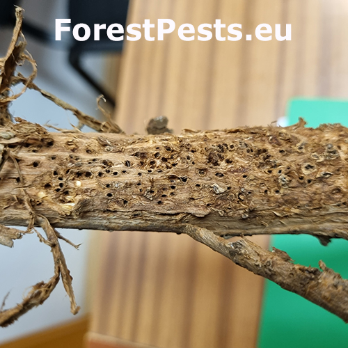 Small, tiny 2–3 mm midge - mosquito like insect. Adults have black head and thorax, reddish abdomen, markedly sharp in the females. Univoltine. The females oviposit on the bark from April to June. The young larvae bore the bark to form a cell in the wood where they develop during summer by feeding on sap. After overwintering, mature larvae move perpendicularly to stemand pupate. Adults finally emerge in great numbers from small circular holes. Since attacks may occur year by year on the same section, the trunks swell and peel, showing a typical shothole-like damage. Although young trees can dry up above the affected section at times, the pest has only a small significance. It can be found mostly in mixed riparian forests, less frequently in willow stands up to 1,500 m.