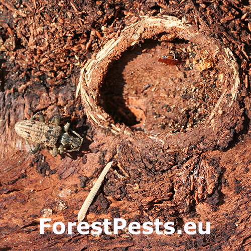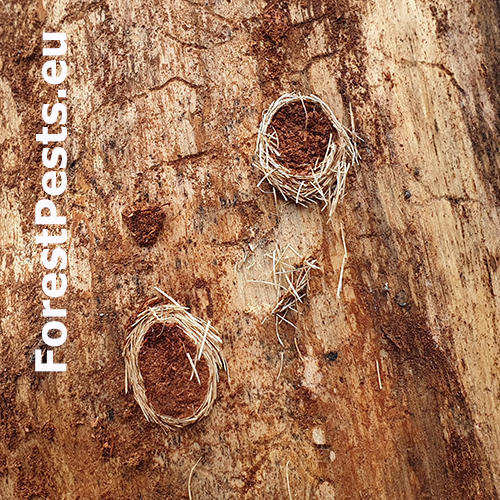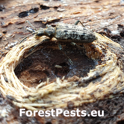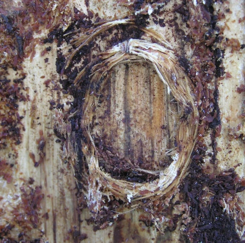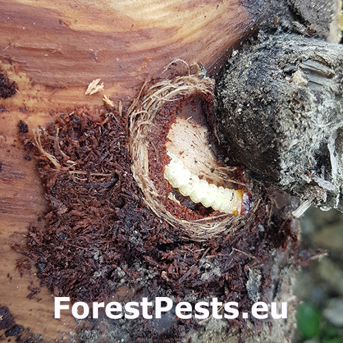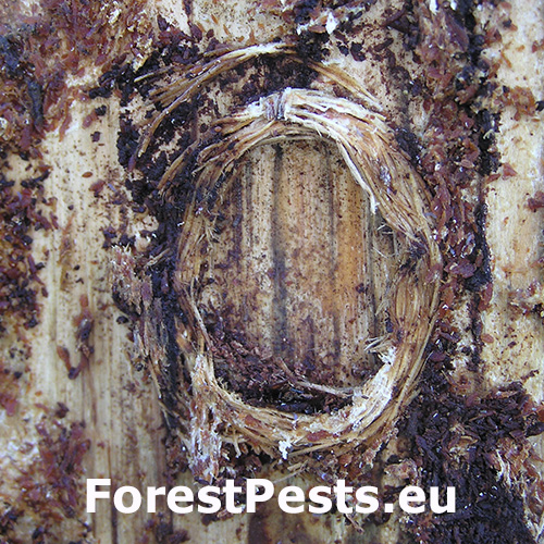 The larva excavates under the bark wavy galleries, in some places up to 2 cm wide. When larvae develop under a thin bark, they pupae in wood, but usually develop under a thicker bark, where they form a very typical circular to elliptical cocoon cradle. Excavation holes are oval.