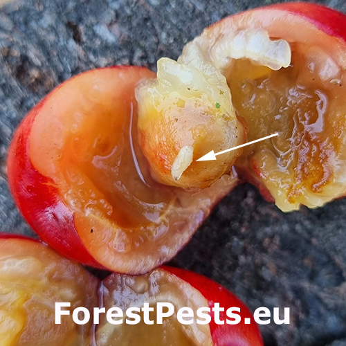 Infested cherries often exhibit signs of premature ripening, premature drop, or show visible exit holes where the mature larvae emerge. The damage caused by the larvae can result in substantial crop losses and decreased fruit quality. Small white larva inside the fruit.