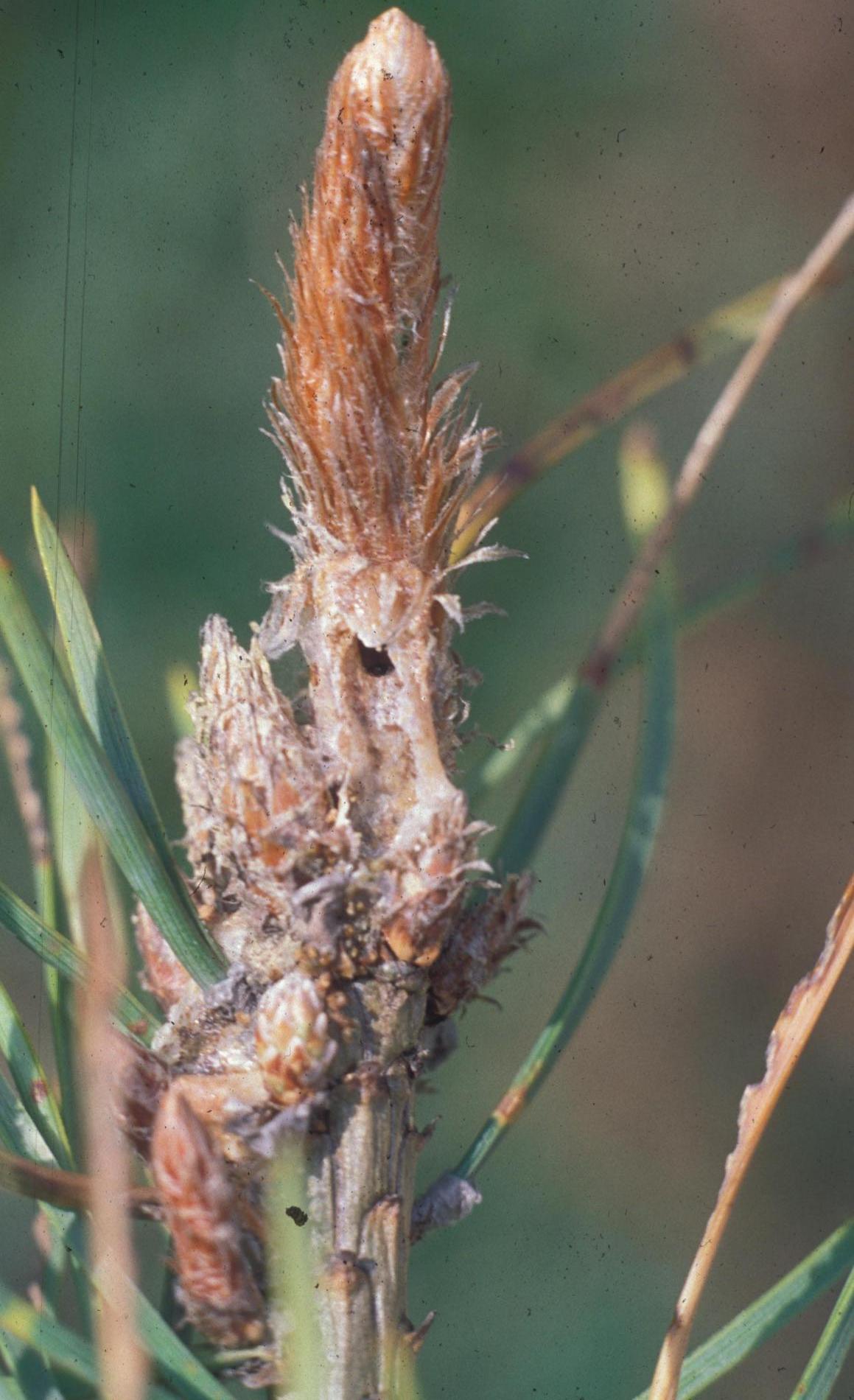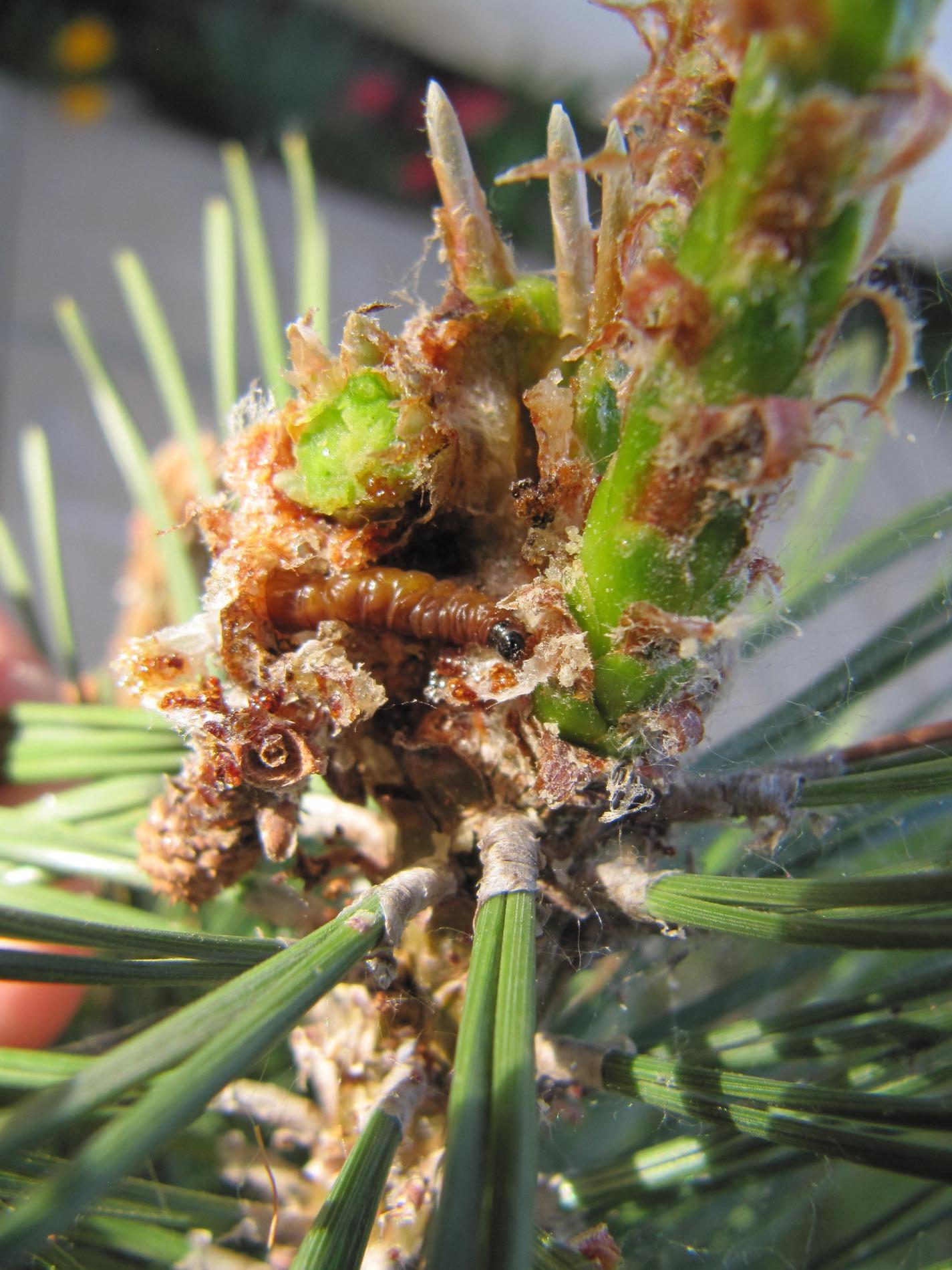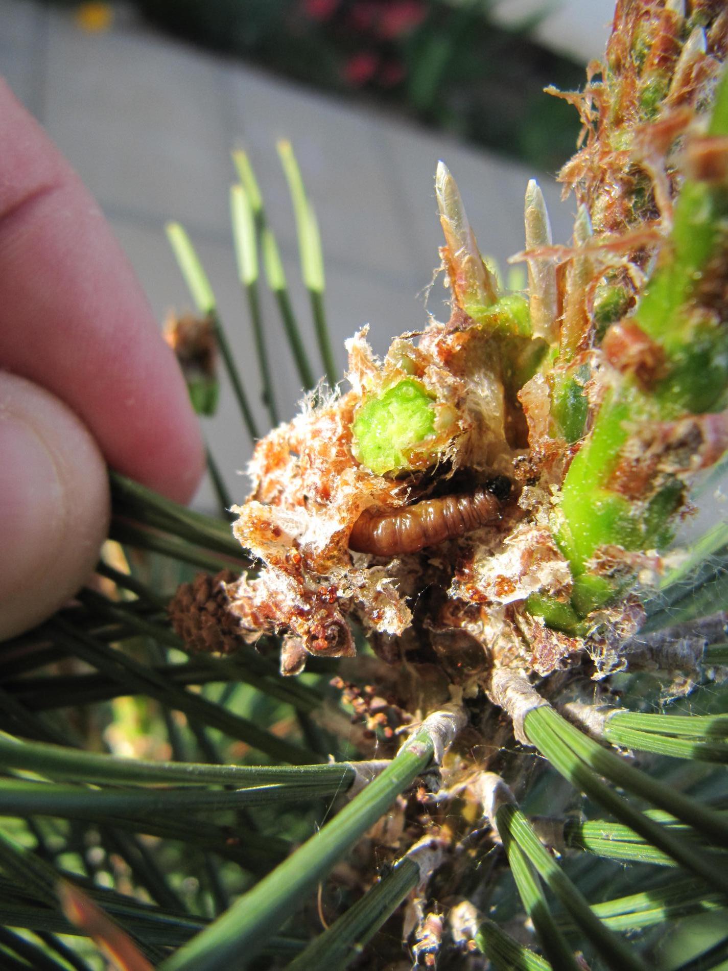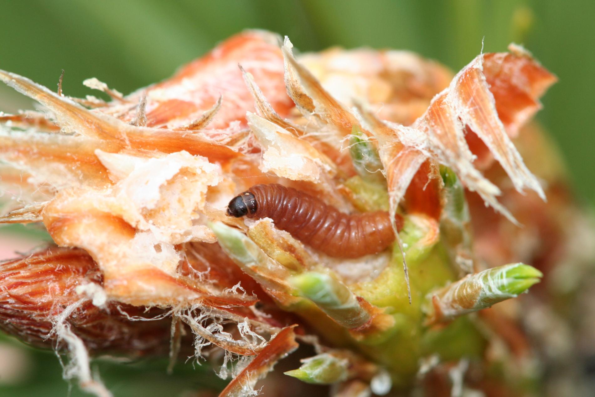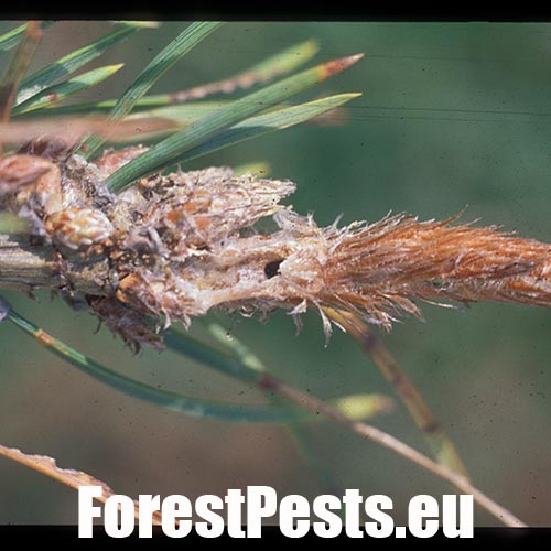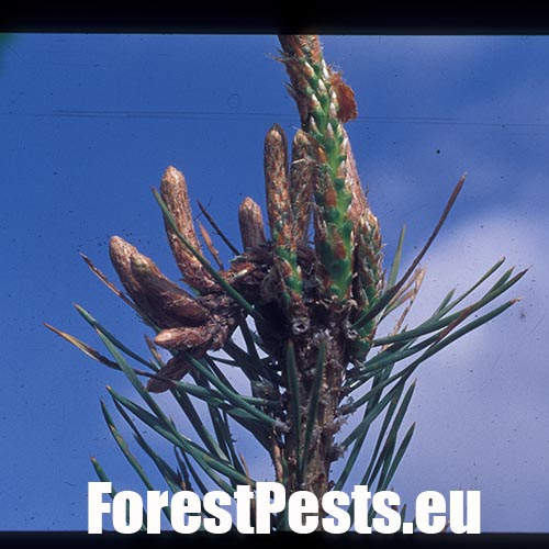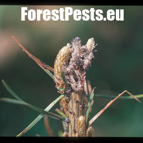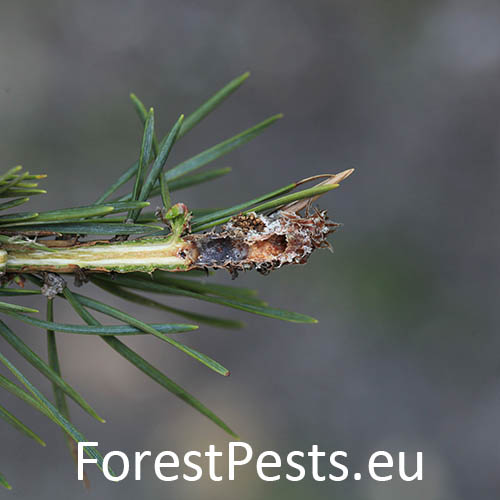 Infested buds dry out gradually and trees form deformed compensatory pipe-shaped bent sprouts (bayonets).