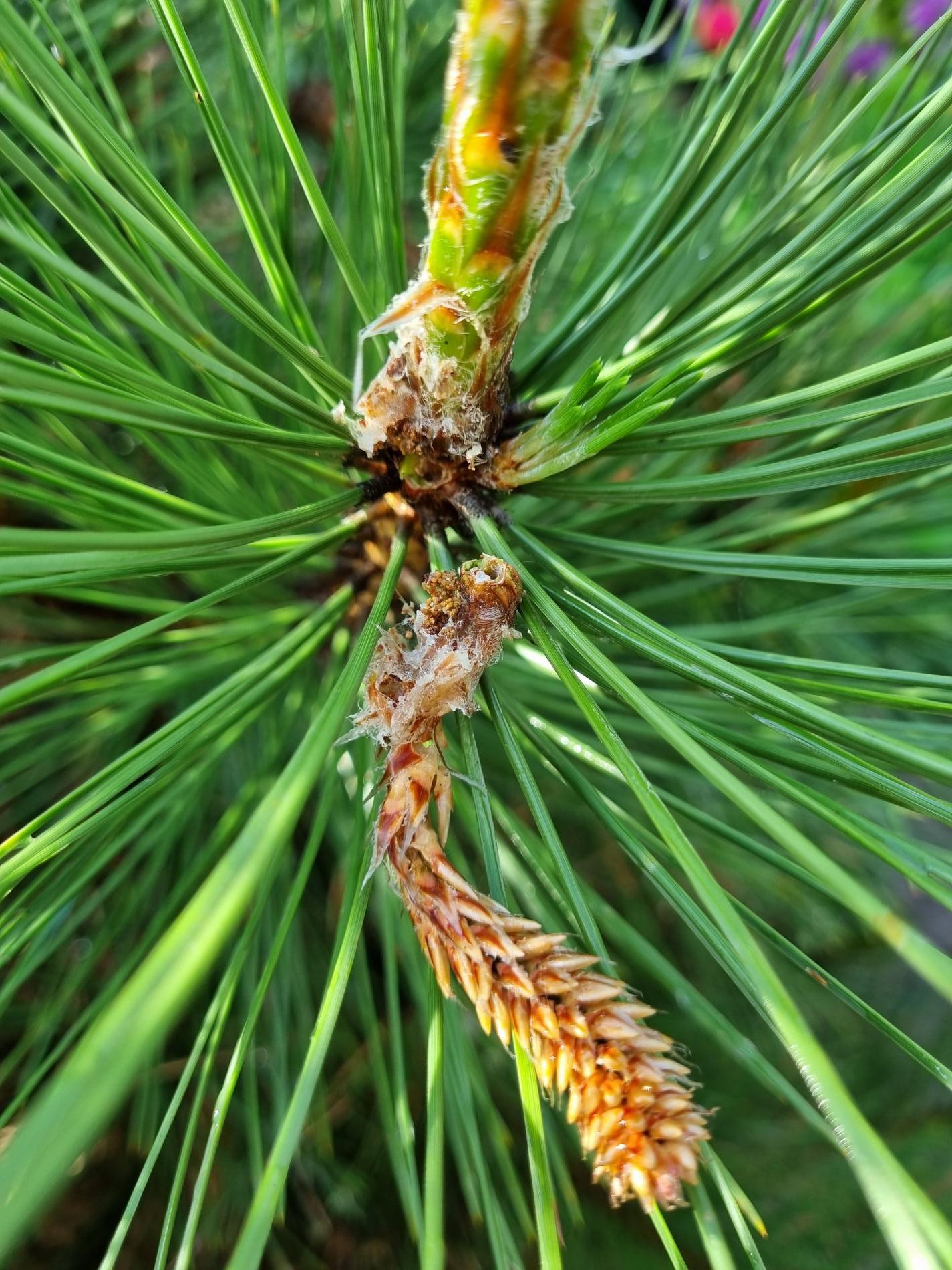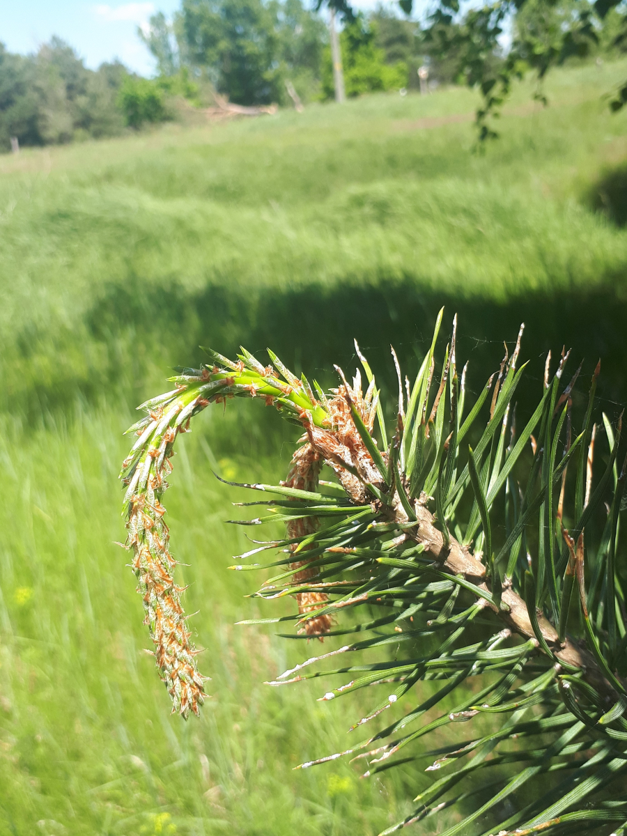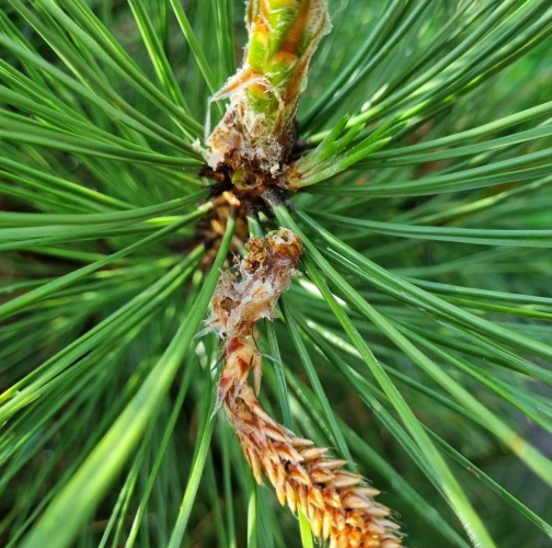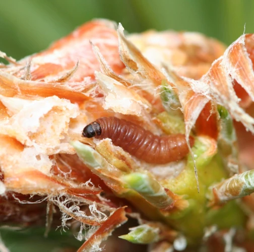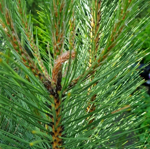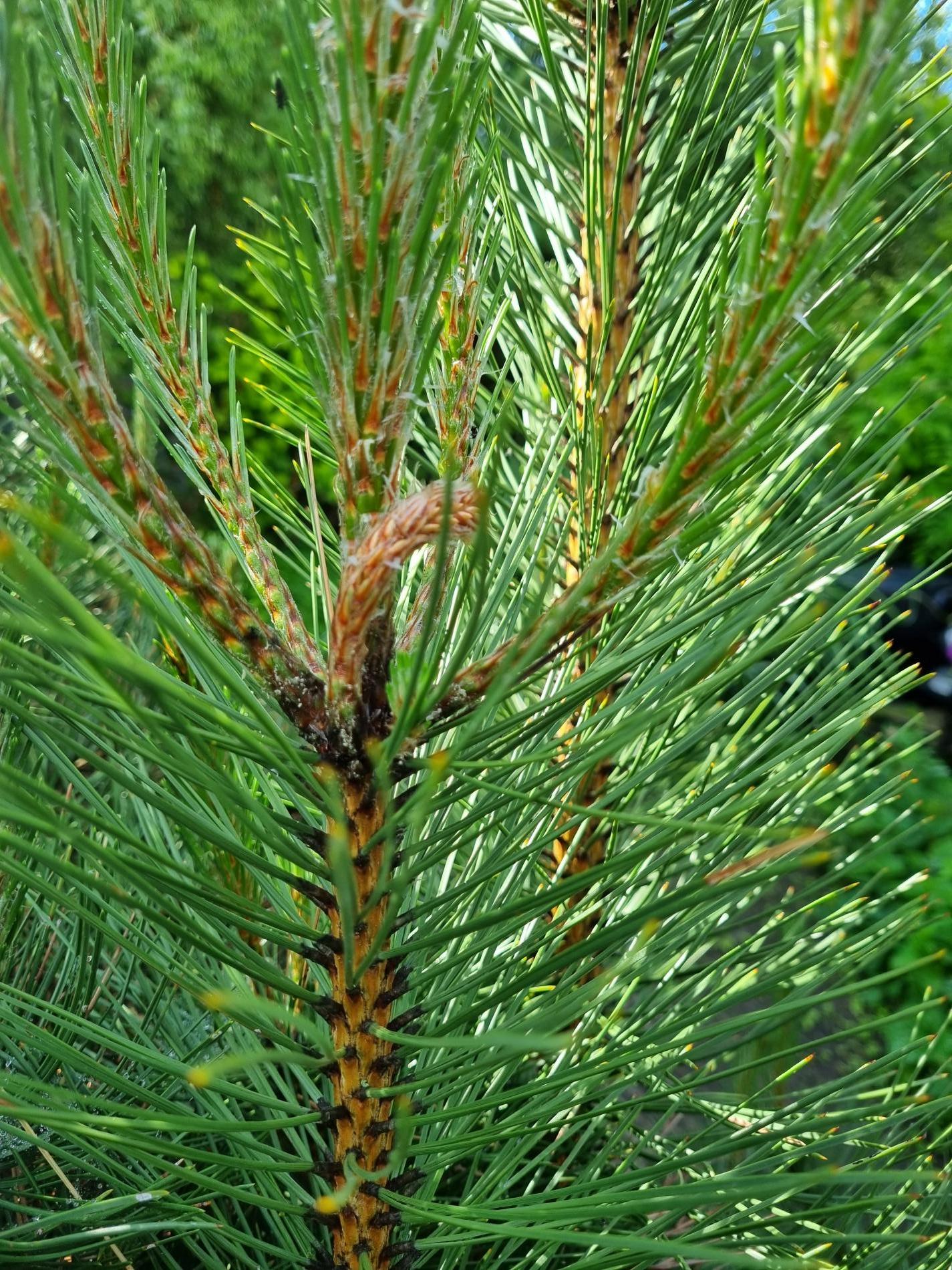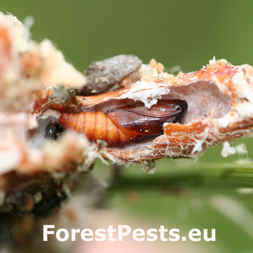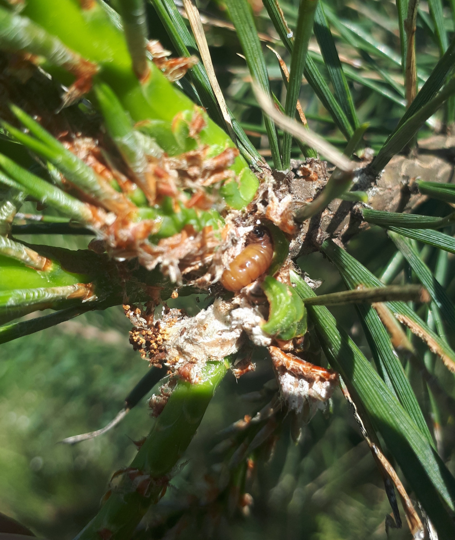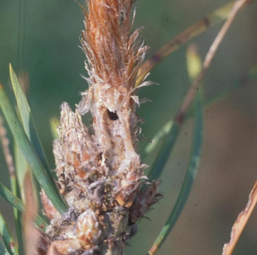 Infested buds dry out gradually and trees form deformed compensatory pipe-shaped bent sprouts (bayonets).