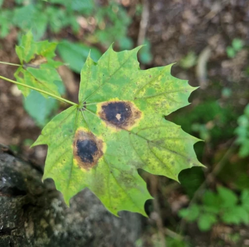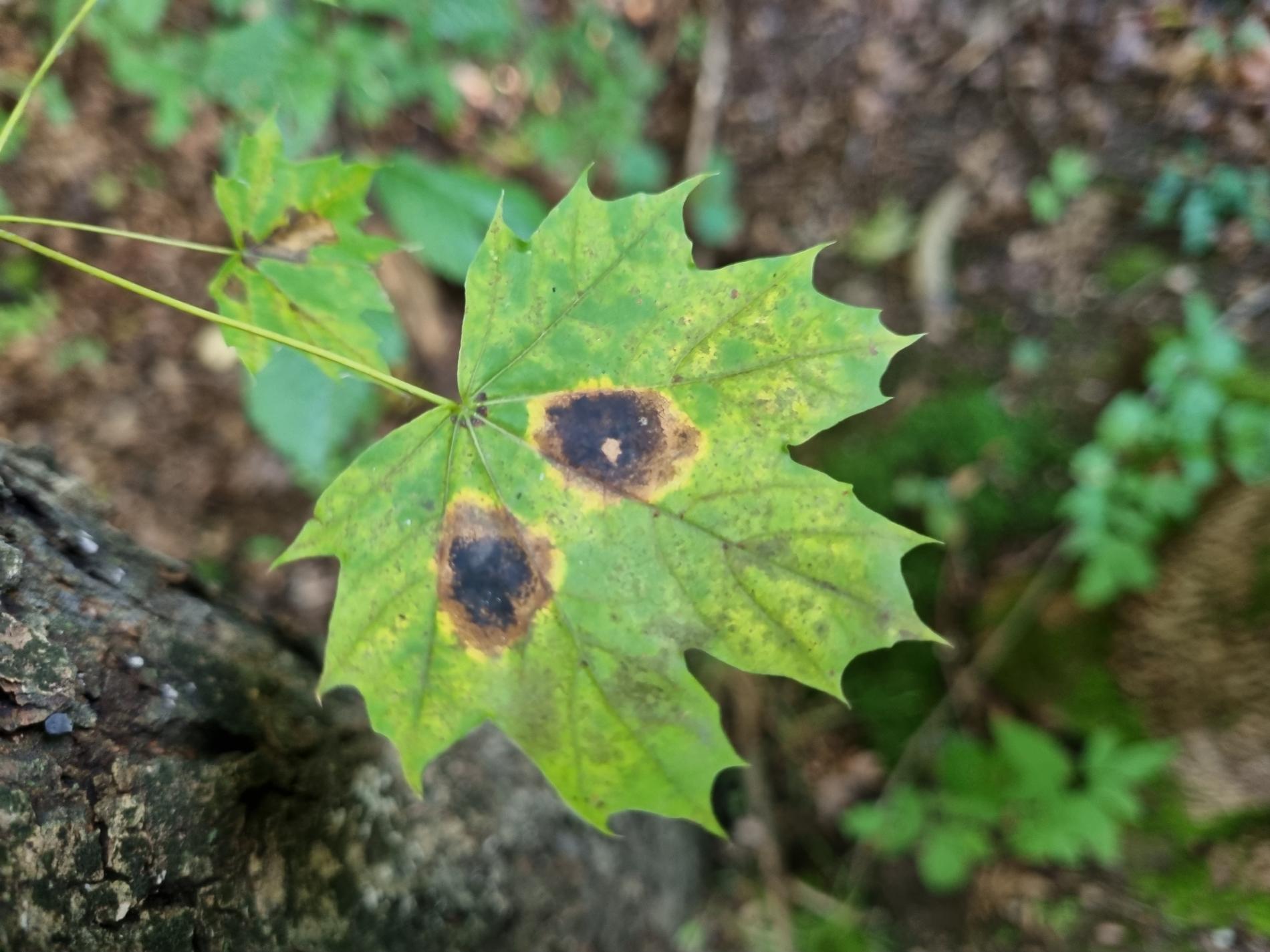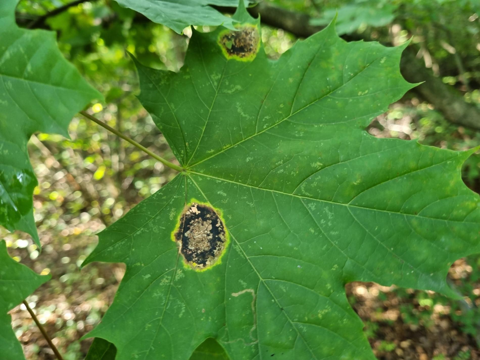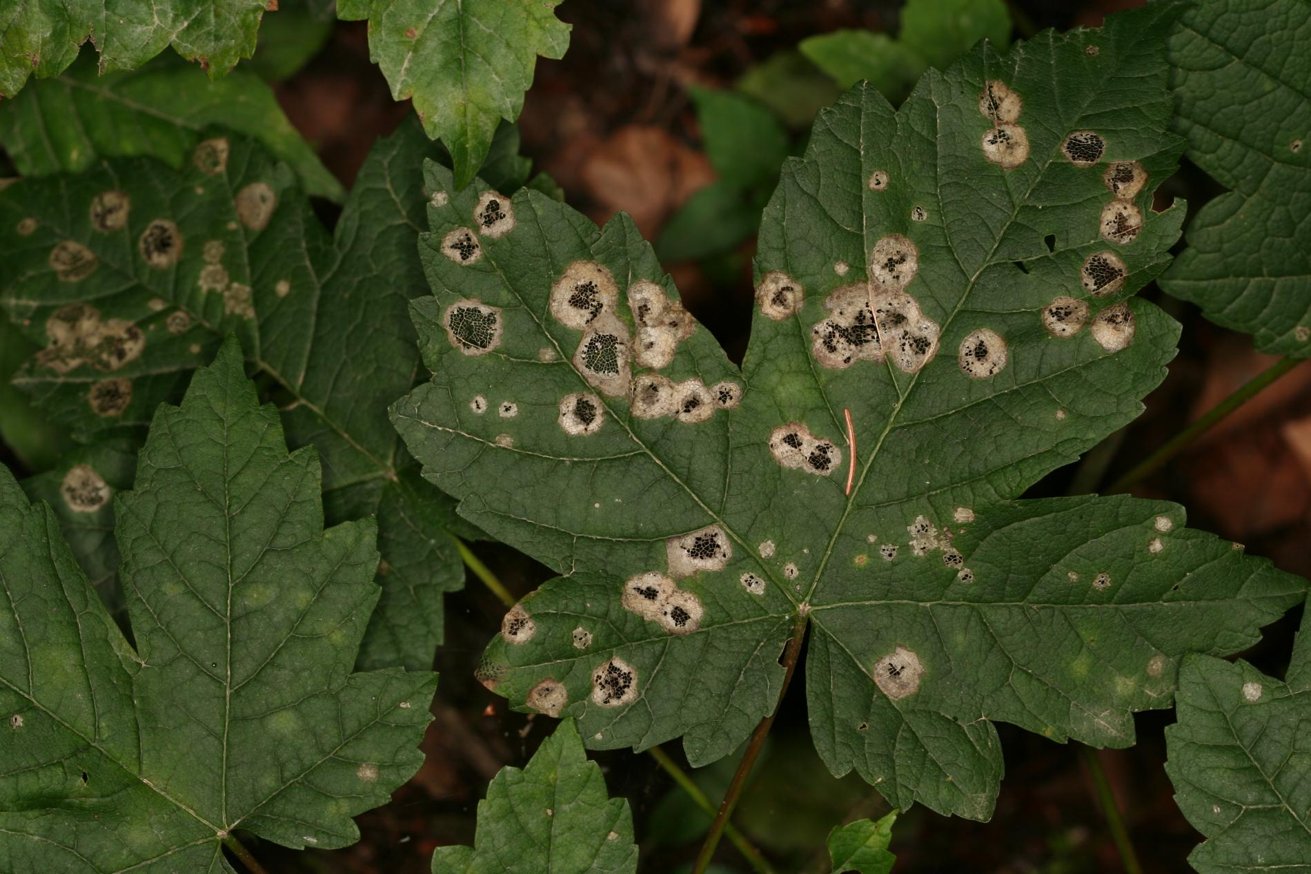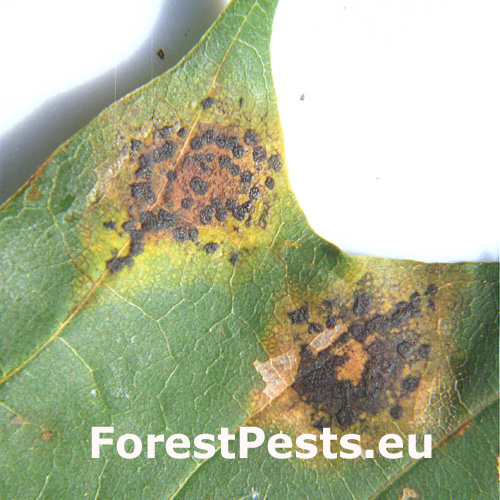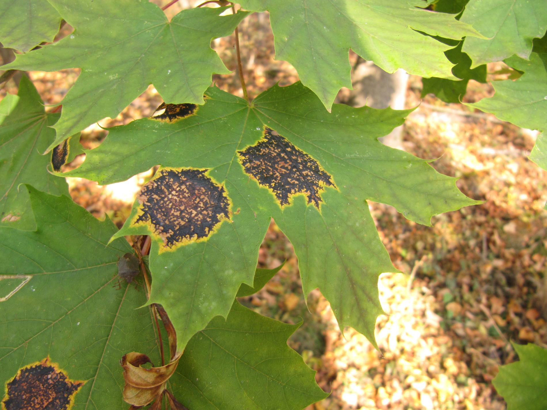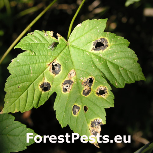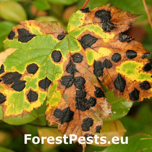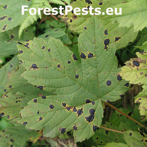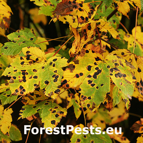 Leaves are infected through stomata on their lower side in May. From the end of May up to July, on leaves can be found yellowish spots in which gradually appear black dots. They grow and join together to form one 0.7-2 cm long, larger black spot which can fall off in time. Macroscopically,  Rhytisma punctatum is different as the black dots do not join together to make one spot even at the stage of maturity. Microscopically, it differs in spores. The disease is of a practical significance only in nurseries where it reduces the assimilation surface on seedlings and transplants, and thus reducing also their increment and resistance. Infected leaves can turn yellow or brown as the season progress. The fungus is also an indicator of relatively clean air of the environment where it develops. It prefer Acer montana ? but can be foun on other maple species too (Acer campestre).