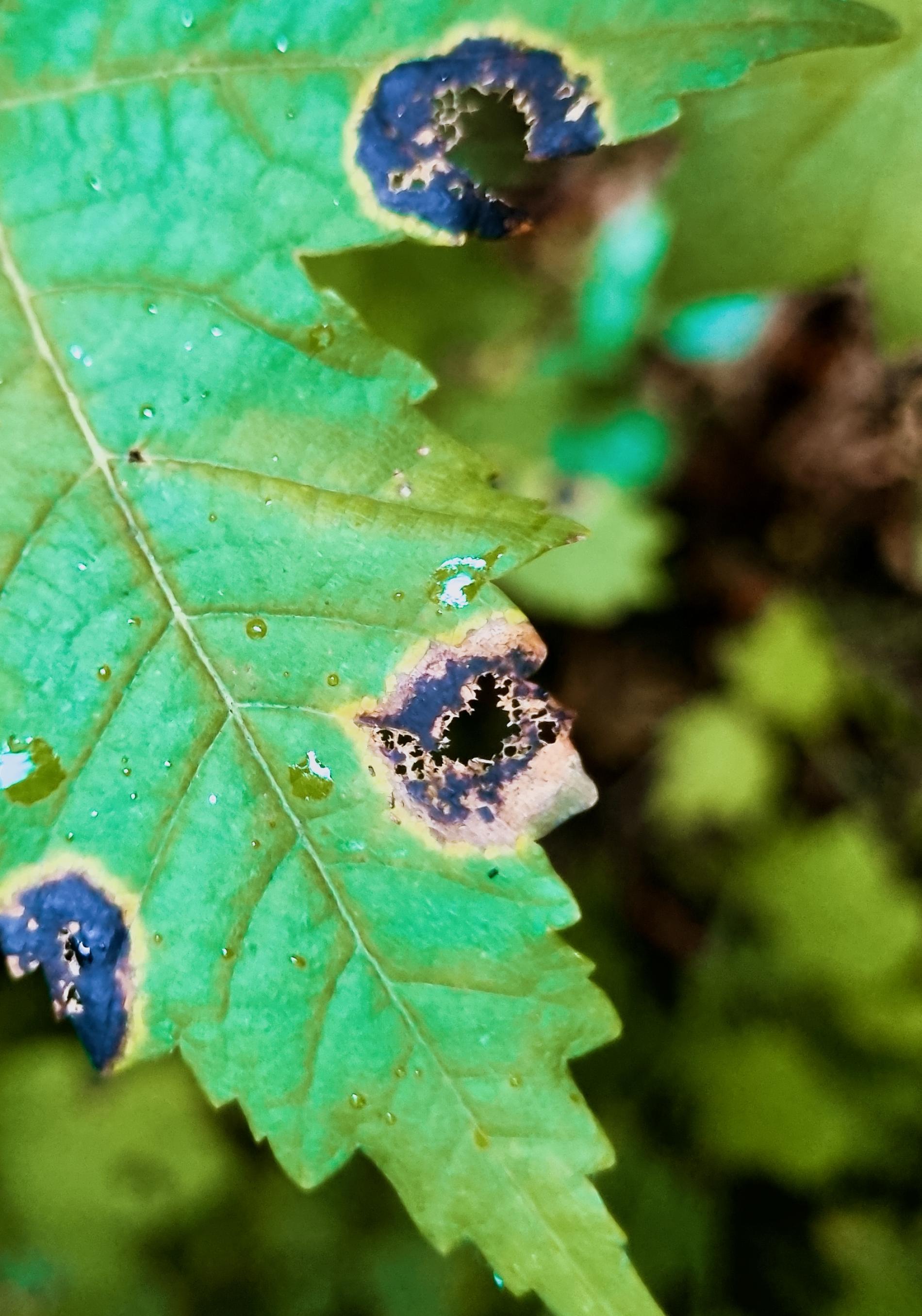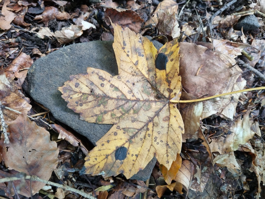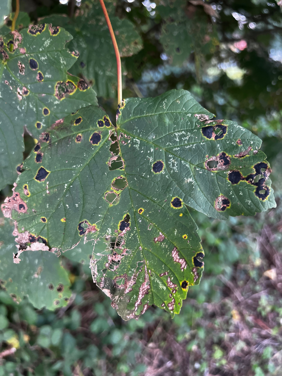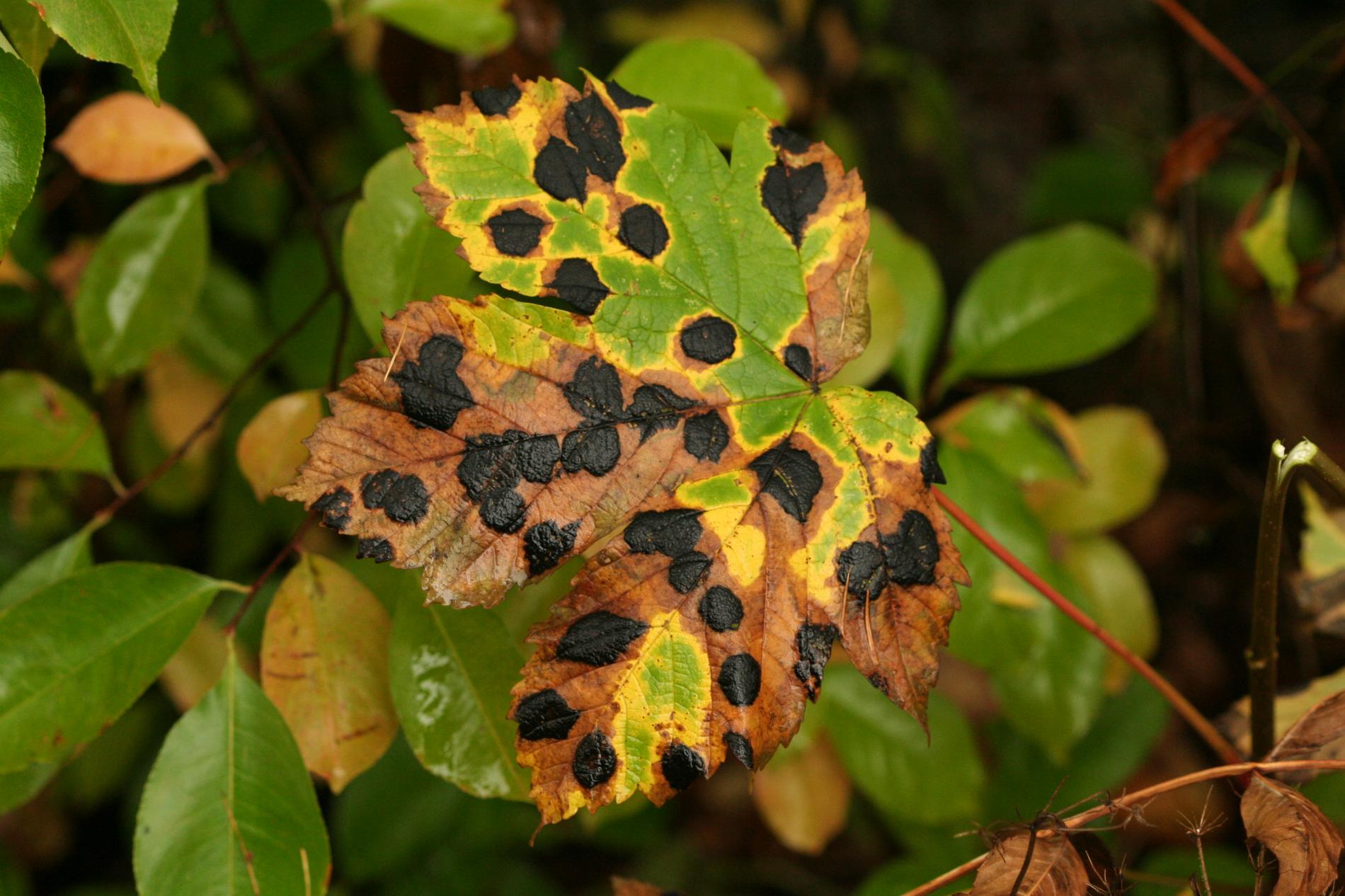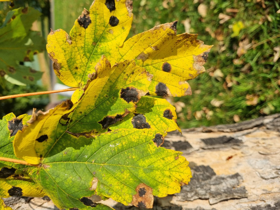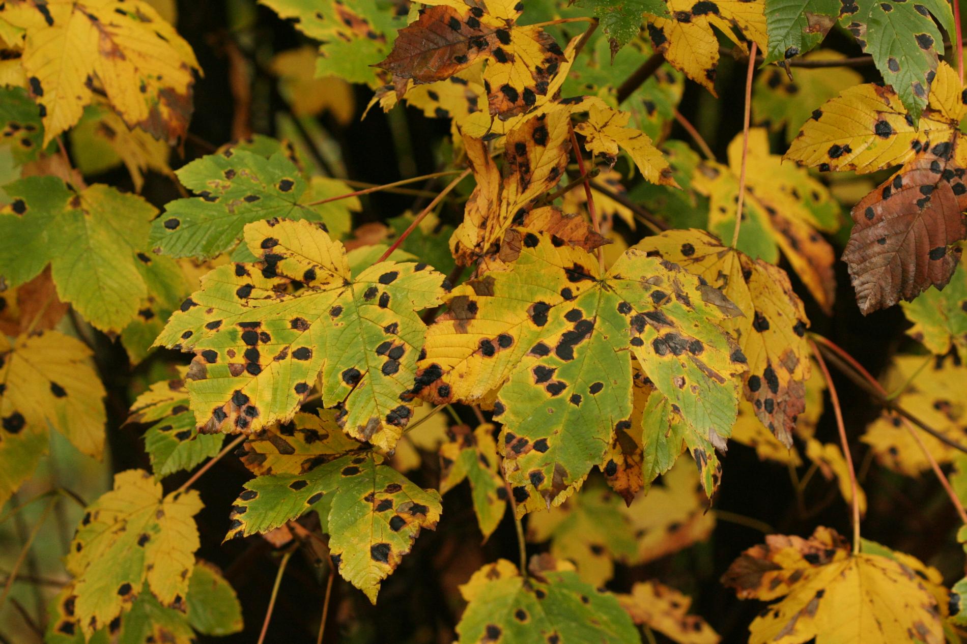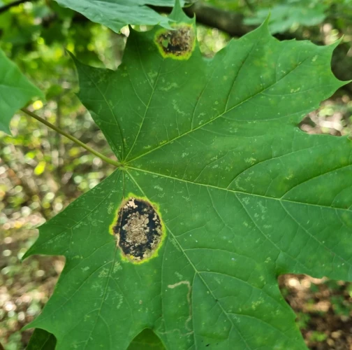 Leaves are infected through stomata on their lower side in May. From the end of May up to July, on leaves can be found yellowish spots in which gradually appear black dots. They grow and join together to form one 0.7-2 cm long, larger black spot which can fall off in time. Macroscopically,  Rhytisma punctatum is different as the black dots do not join together to make one spot even at the stage of maturity. Microscopically, it differs in spores. The disease is of a practical significance only in nurseries where it reduces the assimilation surface on seedlings and transplants, and thus reducing also their increment and resistance. Infected leaves can turn yellow or brown as the season progress. The fungus is also an indicator of relatively clean air of the environment where it develops. It prefer Acer montana ? but can be foun on other maple species too (Acer campestre).