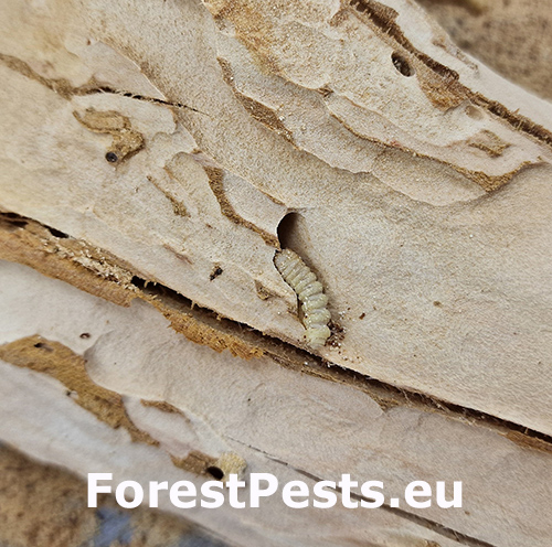 This thermophilic species inhabits forest-steppe areas, edges of deciduous forests, old orchards, and abandoned gardens. It is common in Southern Europe. It's a polyphagous species that attacks dozens of species of deciduous trees, especially fruit trees like apple, plum, peach, cherry, and walnut, and also commonly attacks beech firewood from forest trees. The adult reaches sizes up to 3 cm, is nearly black, similar To Cerambyx scopolii imago. Swarming occurs from late April to July. Larvae develop under the bark in branches and thinner stems, creating wide, flat galleries visible even in sapwood. The exit hole is elliptical, with a size ranging from 6 to 10 mm along the longer side, depending on the variable size of the adult. The developmental cycle lasts 1 to 2 years, depending on climatic and food conditions. From a forestry perspective, it's not a major pest, but theoretically, it can damage fruit trees, especially with ongoing warming trends. When infesting firewood, it can multiply rapidly, and larvae can literally disintegrate the wood under the bark. During logging, this can result in significant wood sawdust falling from the affected material.