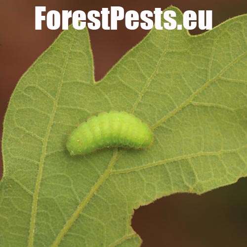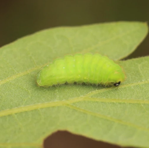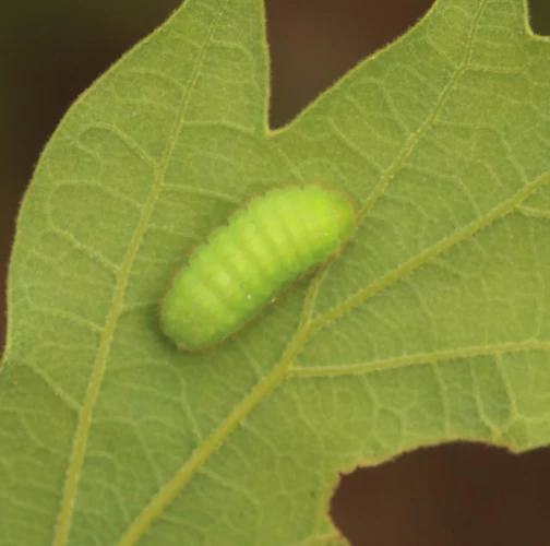 The caterpillar has a very atypical shape. It is oval and resembles a small snail without a shell rather than a butterfly caterpillar.