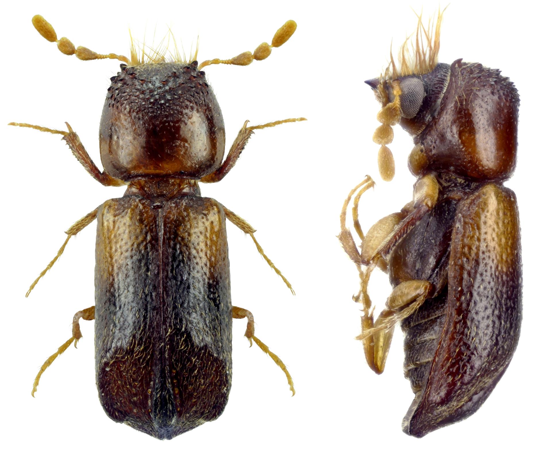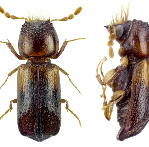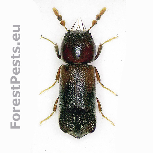 Scobicia chevrieri is a xylophagous beetle from the family Bostrichidae, common in the Mediterranean region and parts of the Near East. It primarily develops in dry, dead, or weakened wood of deciduous trees, with host genera including Castanea, Quercus, Ficus, Laurus, Morus, Olea, and also some introduced species like Eucalyptus. Larvae bore irregular galleries in dry wood, often in sun-exposed branches and trunks. This species is considered of minor economic importance. In Europe, it occurs in southern and southeastern regions.