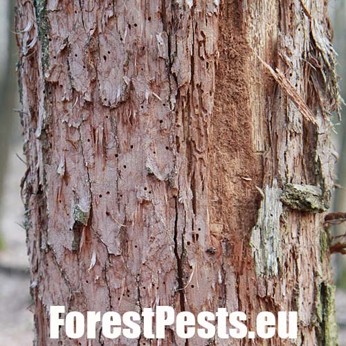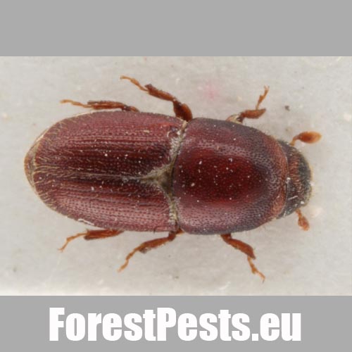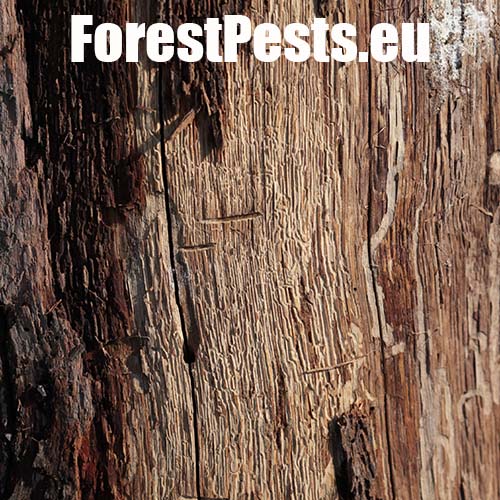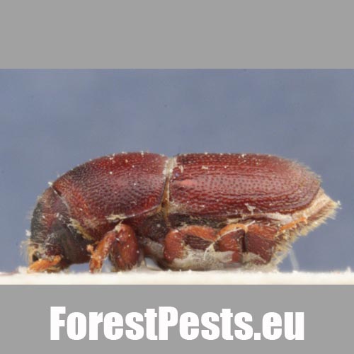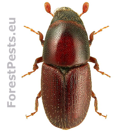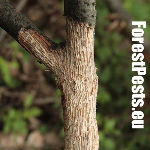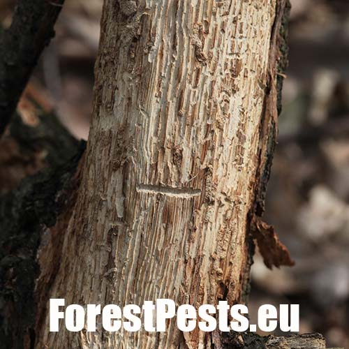 The beetle is up to 2.5–4 mm long. The female excavates a transverse egg gallery (1 – 2 cm long) under the bark of branches greater than 5 cm in diameter, but more frequently on tree trunks. Larval galleries extend parallel to the grain (perpendicular to the egg gallery) and can reach lengths of 10 to 15 cm. Swarming usually begins in late April or early May. The adults perform maturation feeding on oak twigs. As the vector of spores of vascular fungi of the genus Ophiostoma, ones from the most significant reasons of the oak forest dieback. Infested trees exhibit general symptoms of decline that include reduced growth, crown thinning (i.e. reduced foliage cover) and mortality. As a control method in the forest standing trap trees are deployed with a goal of reducing the pest population.