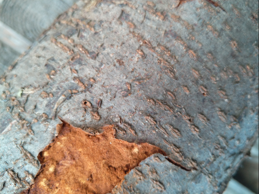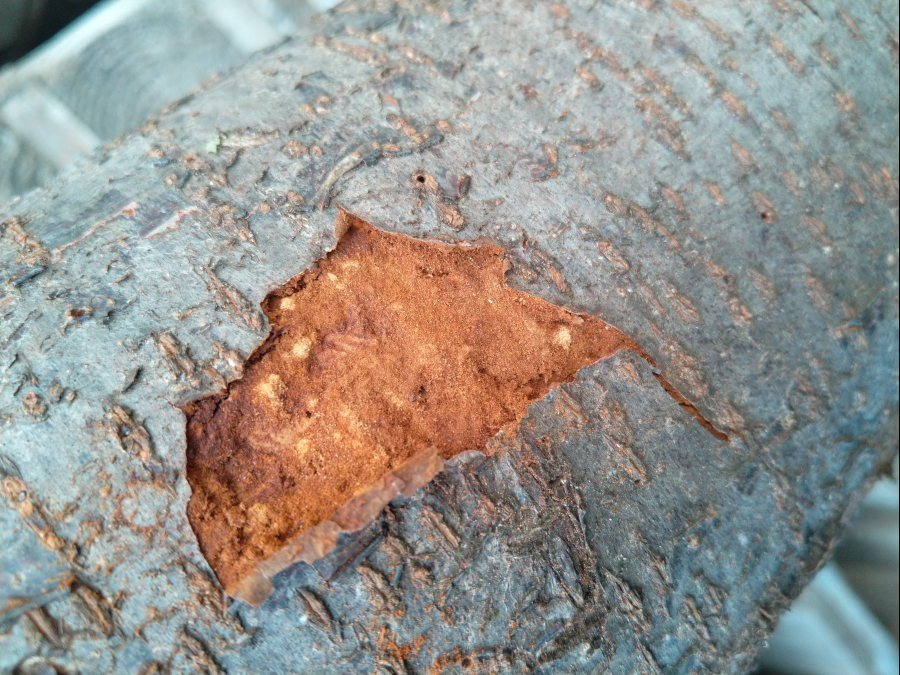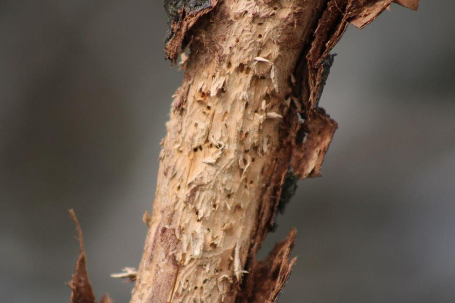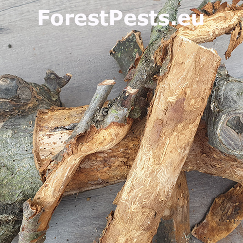 Exit holes with a diameter of approximately 1 to 1.5 mm. Under the bark are short longitudinal maternal corridors. The infested tree dries up in a few years. Often only the infested branch dries out. Woodpeckers are searching for overwintering larvae and thus markin the infested trees.