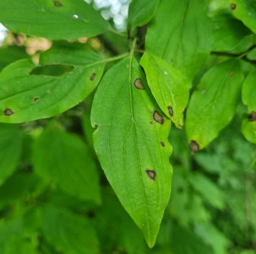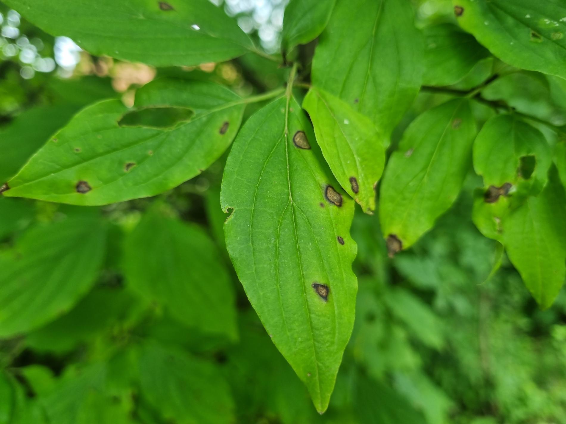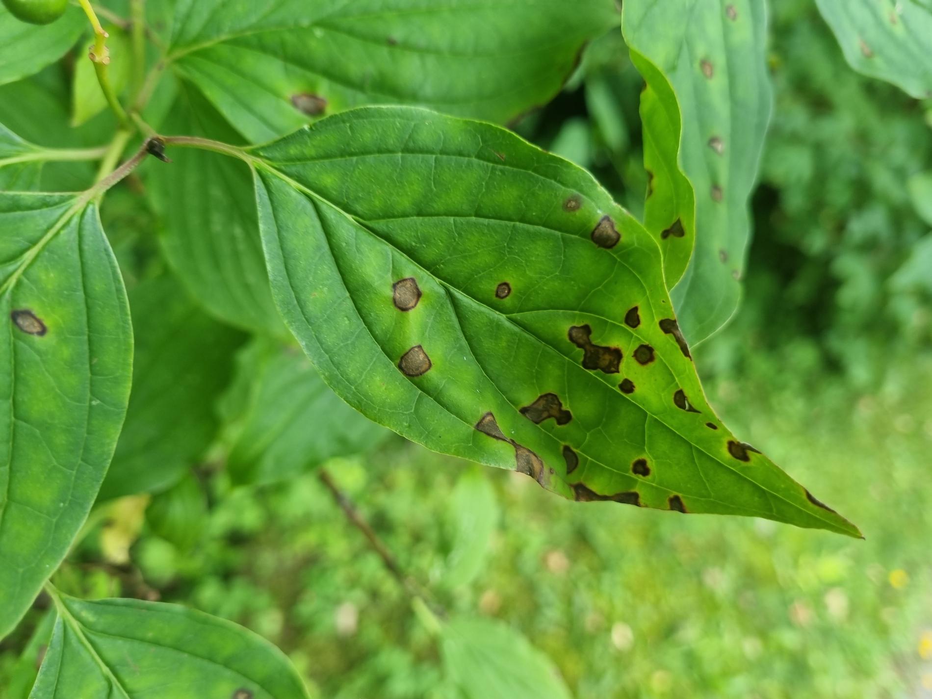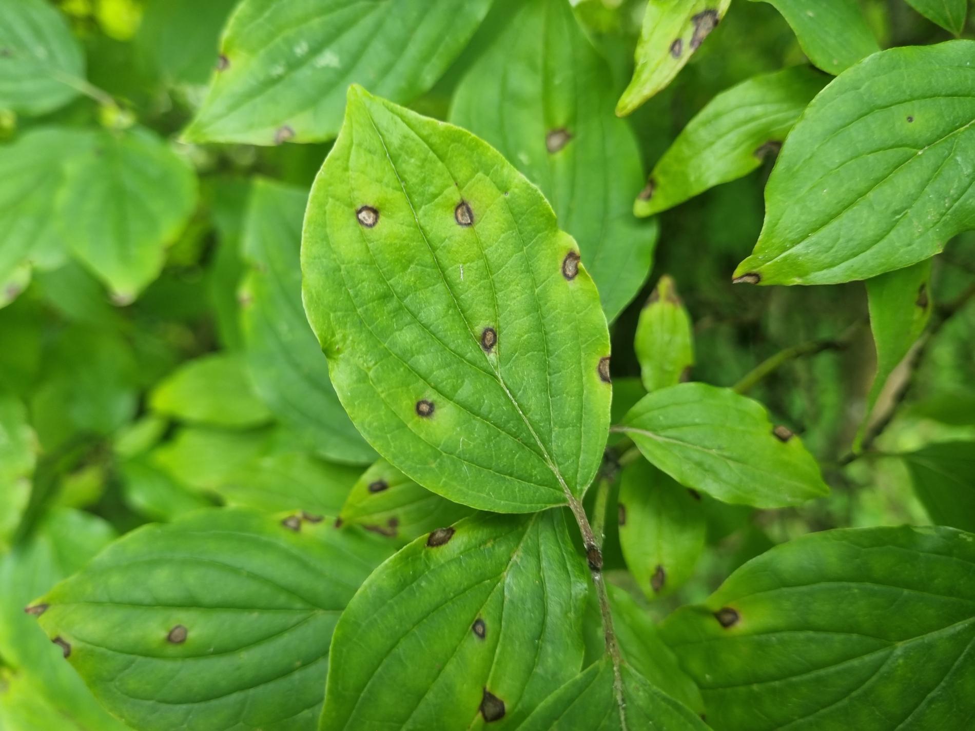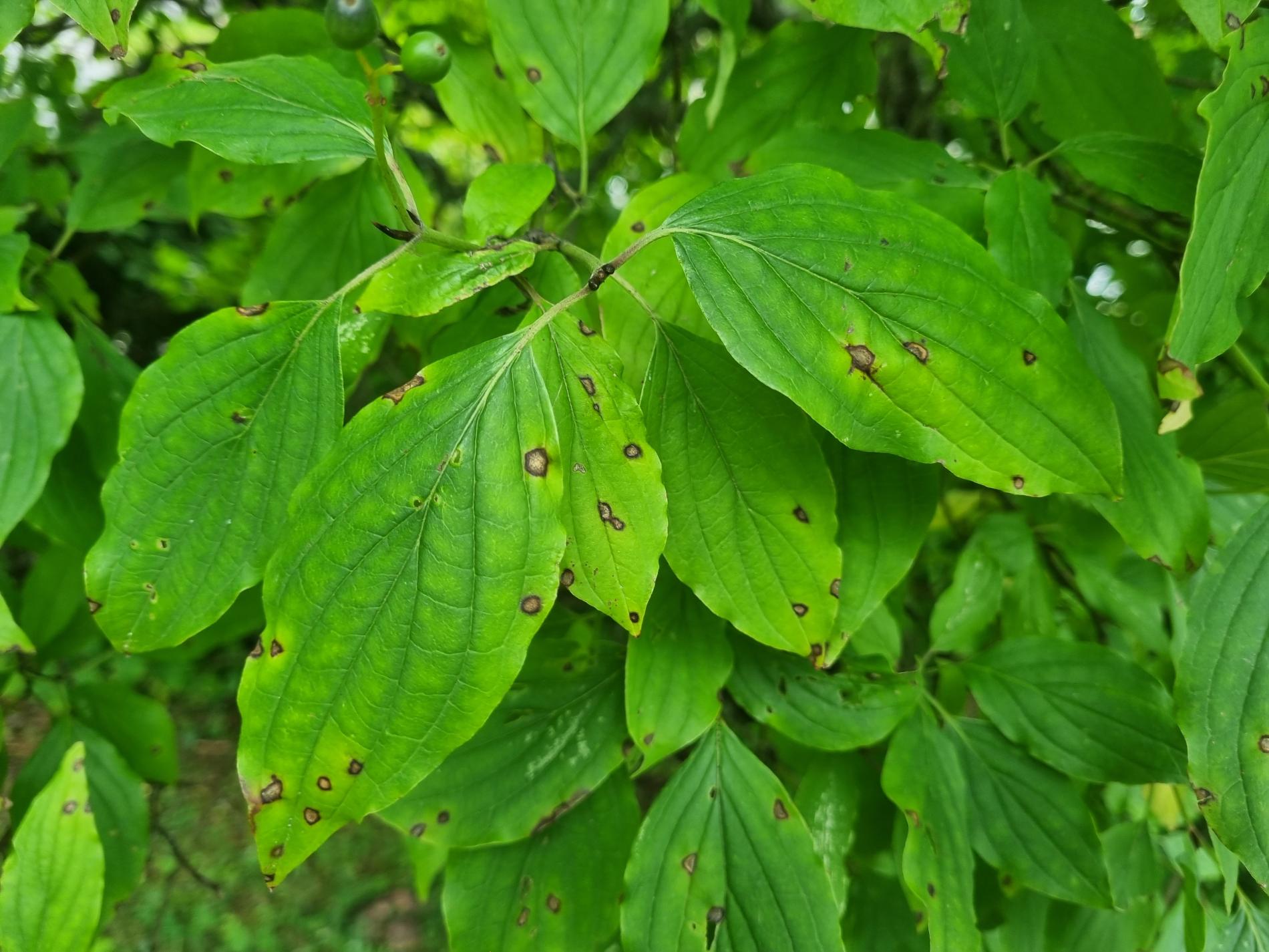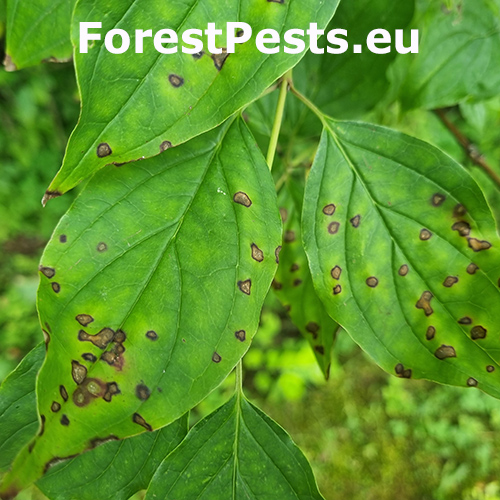 Septoria leaf spot on dogwoods Septoria cornicola is a fungal pathogen that primarily infects dogwood species (Cornus spp.). The fungus is widely distributed across European countries, thriving in moist environments conducive to its development, particularly if occur in the spring and autumn. Septoria cornicola overwinters in fallen leaves and other plant debris. During wet weather, fungal spores are spread by wind or rain, infecting new leaves in spring. The cycle repeats throughout the growing season in conducive conditions. It causes leaf spots, typically appearing as dark brown to black lesions with lighter centers. Severe infections can lead to premature leaf drop, weakening the tree over time, though it rarely causes tree death. While it doesn’t generally cause significant economic loss in forestry or agriculture, it can reduce the ornamental value of dogwoods in gardens and landscapes, affecting nurseries and plant sales. Effective management includes removing infected leaves and applying fungicides if necessary.