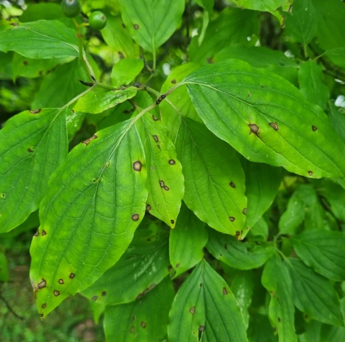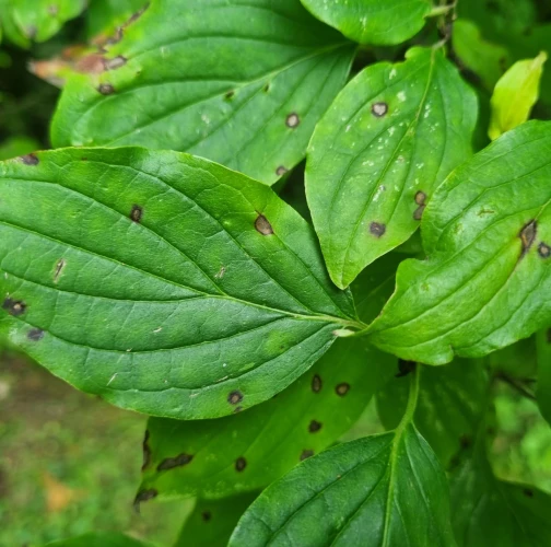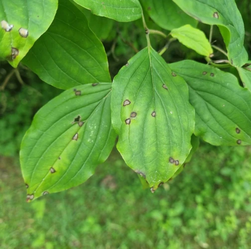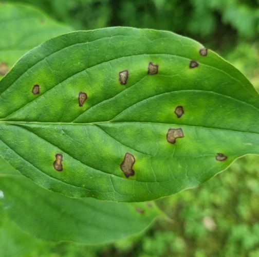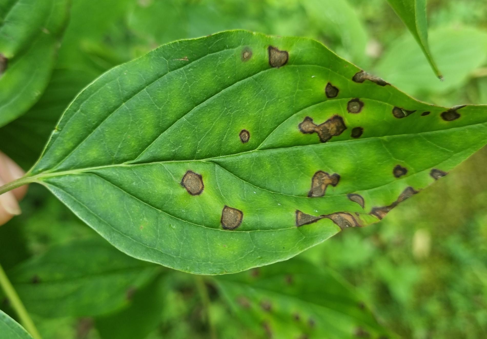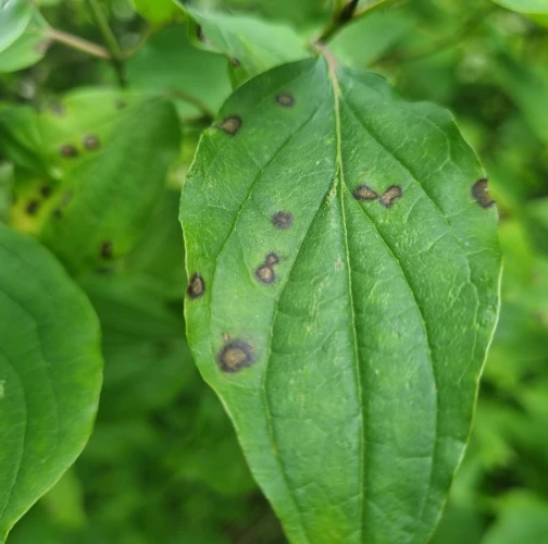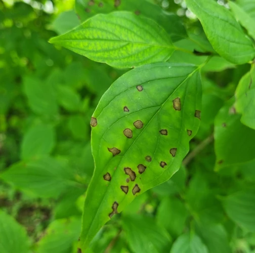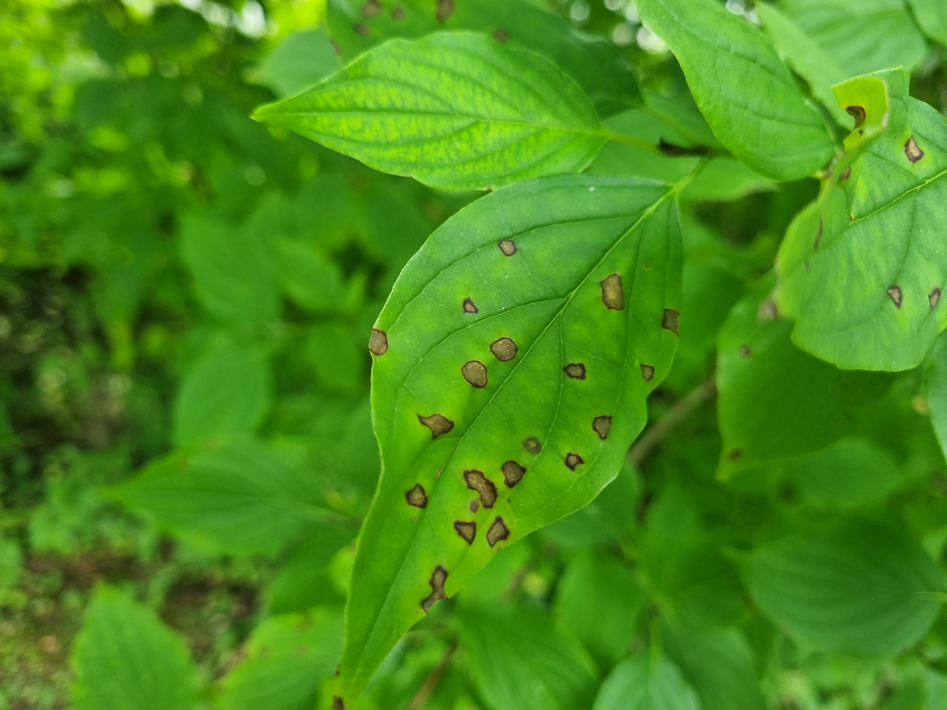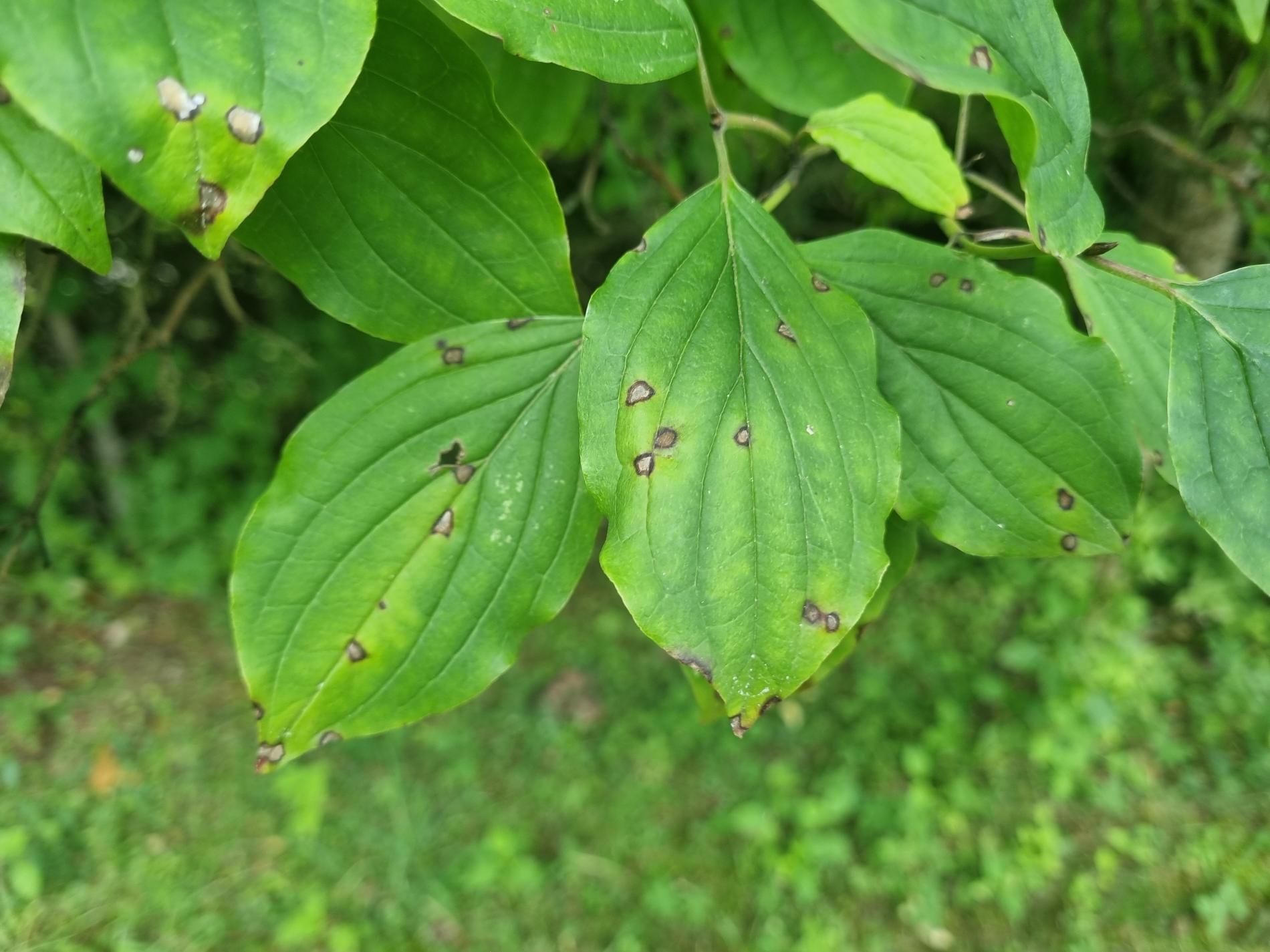 Septoria leaf spot on dogwoods Septoria cornicola is a fungal pathogen that primarily infects dogwood species (Cornus spp.). The fungus is widely distributed across European countries, thriving in moist environments conducive to its development, particularly if occur in the spring and autumn. Septoria cornicola overwinters in fallen leaves and other plant debris. During wet weather, fungal spores are spread by wind or rain, infecting new leaves in spring. The cycle repeats throughout the growing season in conducive conditions. It causes leaf spots, typically appearing as dark brown to black lesions with lighter centers. Severe infections can lead to premature leaf drop, weakening the tree over time, though it rarely causes tree death. While it doesn’t generally cause significant economic loss in forestry or agriculture, it can reduce the ornamental value of dogwoods in gardens and landscapes, affecting nurseries and plant sales. Effective management includes removing infected leaves and applying fungicides if necessary.