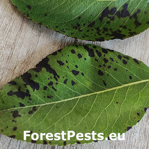 Septoria pyricola is a fungal pathogen causing leaf fleck, white spot, or septoriosis of pear. It is the anamorphic (asexual) stage of Mycosphaerella pyri, which represents the sexual stage of the same species. This fungus primarily attacks Pyrus spp., forming necrotic spots on leaves and sometimes on fruits. In Europe, the disease is frequent in Mediterranean countries, where it can lead to premature leaf fall and reduced fruit quality. Infections start in spring from ascospores on fallen leaves, and during the season the fungus spreads via rain-splashed pycnidiospores. Warm and rainy weather in late spring and summer favors its development. Repeated attacks lower the ornamental and production value of pear trees in orchards and gardens.