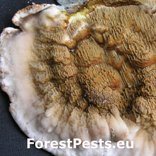 The fruiting bodies are annual, usually resupinate, 5-30 cm across, although they initially appear in shape of white cotton flakes. Later a yellowish orange to orange russet hymenium forms on the undulations in the centre. The cap retains a 2 cm wide white margin. The fruiting bodies develop in summer and autumn, but instead of outdoor habitats they inhabit dark cellars and lofts without access of light. Timber of dry constructions is also endangered, as the fungus doesn’t need much moisture. The fungus also creates white mycelial fans and string-shaped rhizomorphs. The decaying wood is brown and breaks in angular chunks. Water is generated by decay so copiously that mycelium is dewed with drops increasing the humidity of the site.