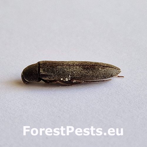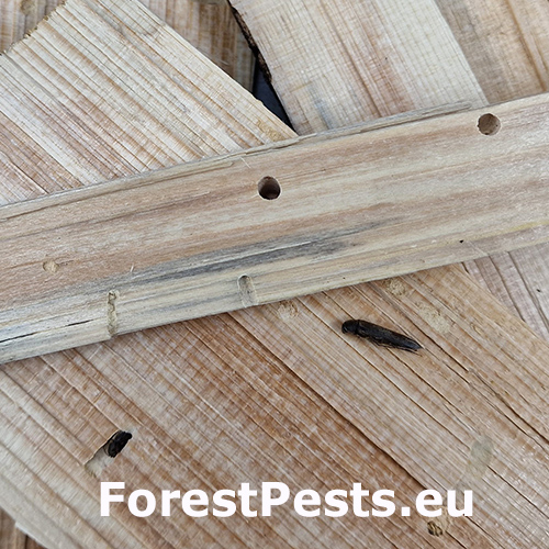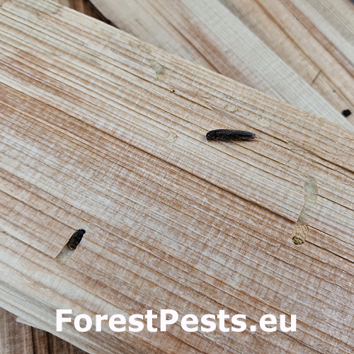 This beetle has no Slovak name and belongs to the family Melandryidae (known as Lencovití in Czech). It is found in Europe, primarily inhabiting coniferous and mixed forests. It is a xylophagous species whose larvae develop in wood, most commonly attacking spruce and fir trees. Adult beetles reach a length of 8 to 18 mm. Their bodies are cylindrical, dark brown to black. This species typically develops in weakened or freshly felled trees. The beetles are present in nature from July to September, with swarming occurring mainly at night. The female lays up to 170 eggs in bark crevices, from where the larvae burrow into the wood. They create tunnels with a circular diameter of 4–5 mm, which are filled and compacted with fine frass and can reach a depth of 10 cm. The mature larva grows to about 25 mm, and its development takes 2 to 3 years. The exit hole is circular, measuring 3 to 6 mm in diameter. This beetle often infests the same material as wood wasps of the genus Sirex.