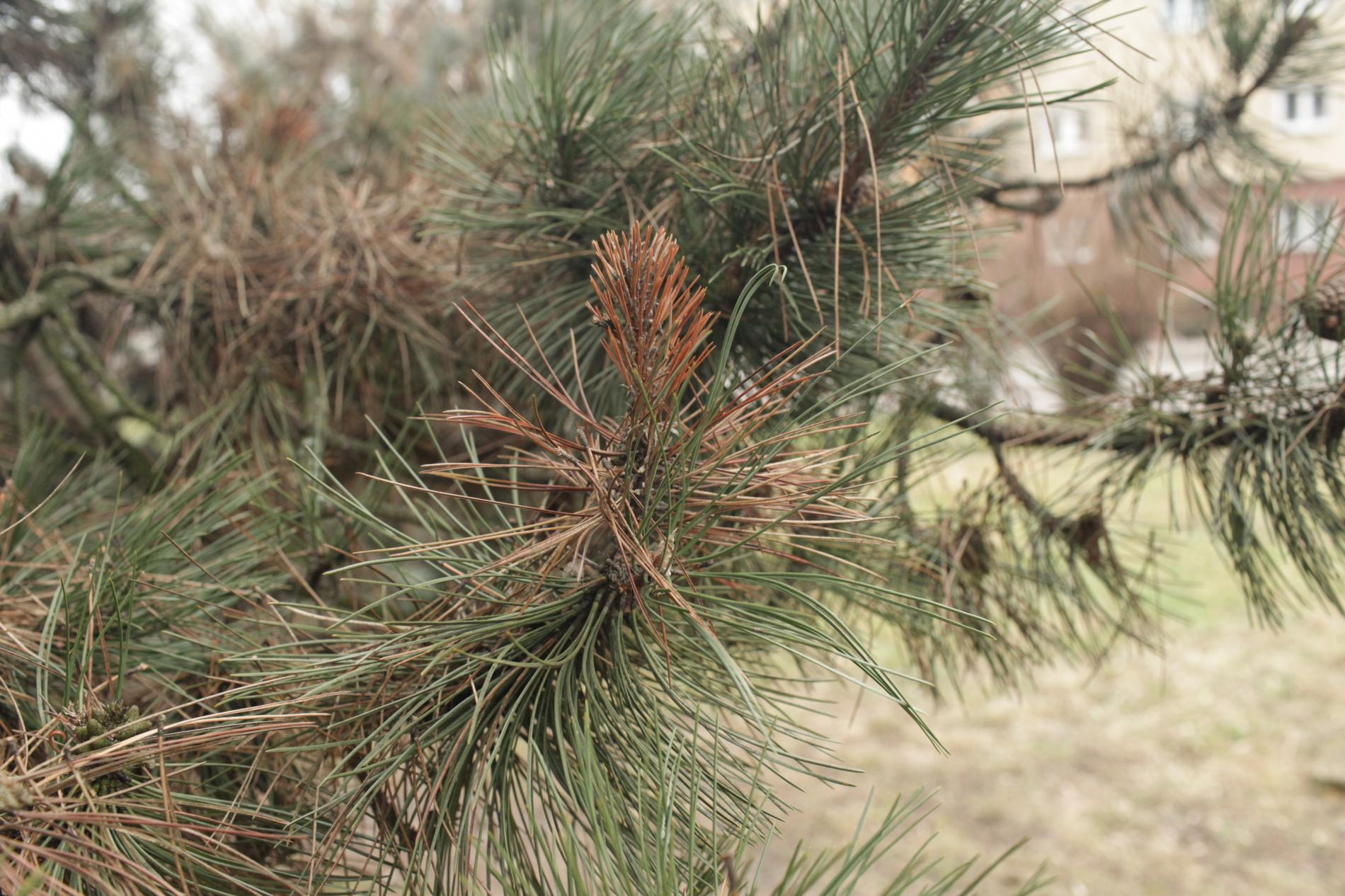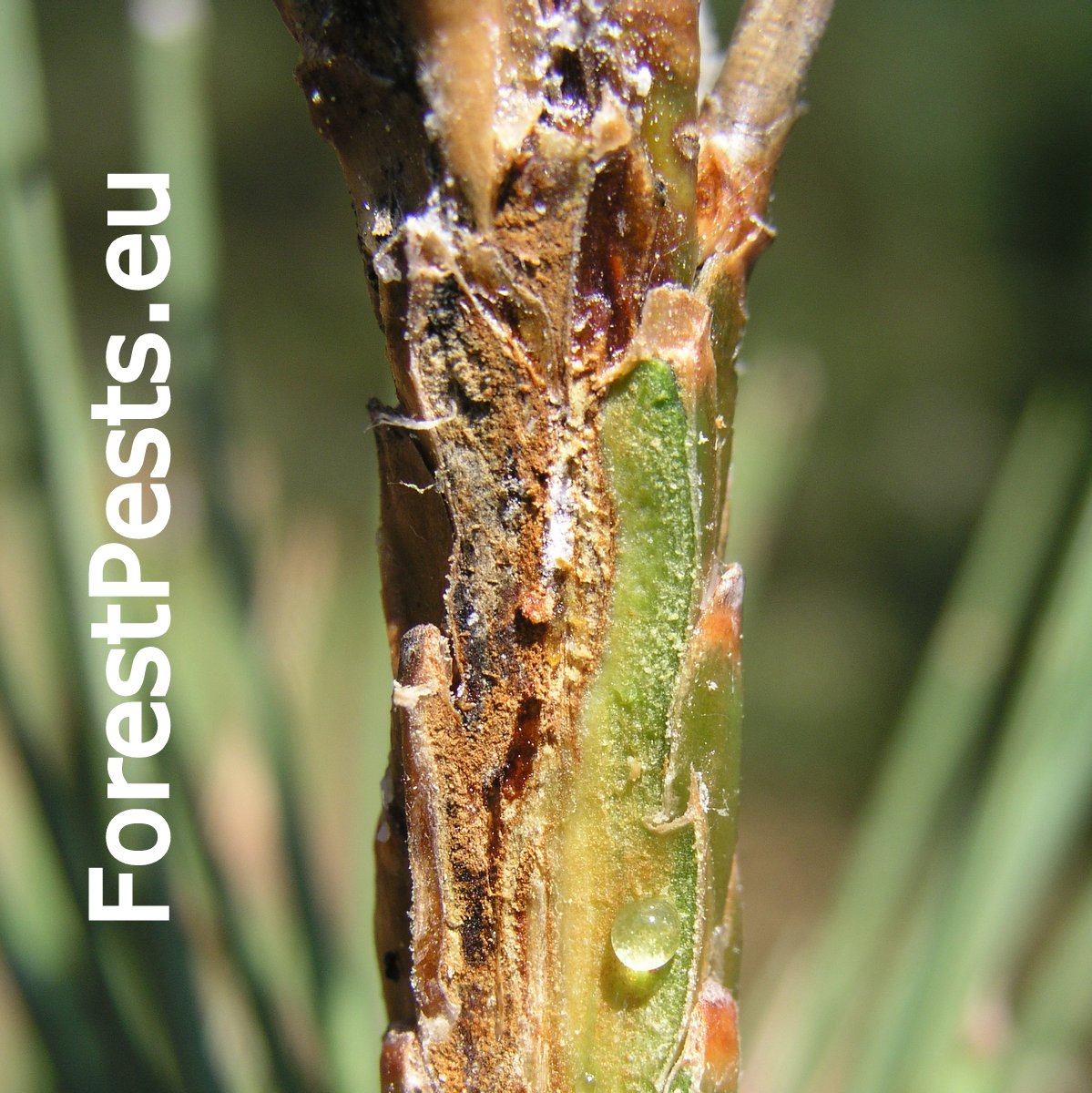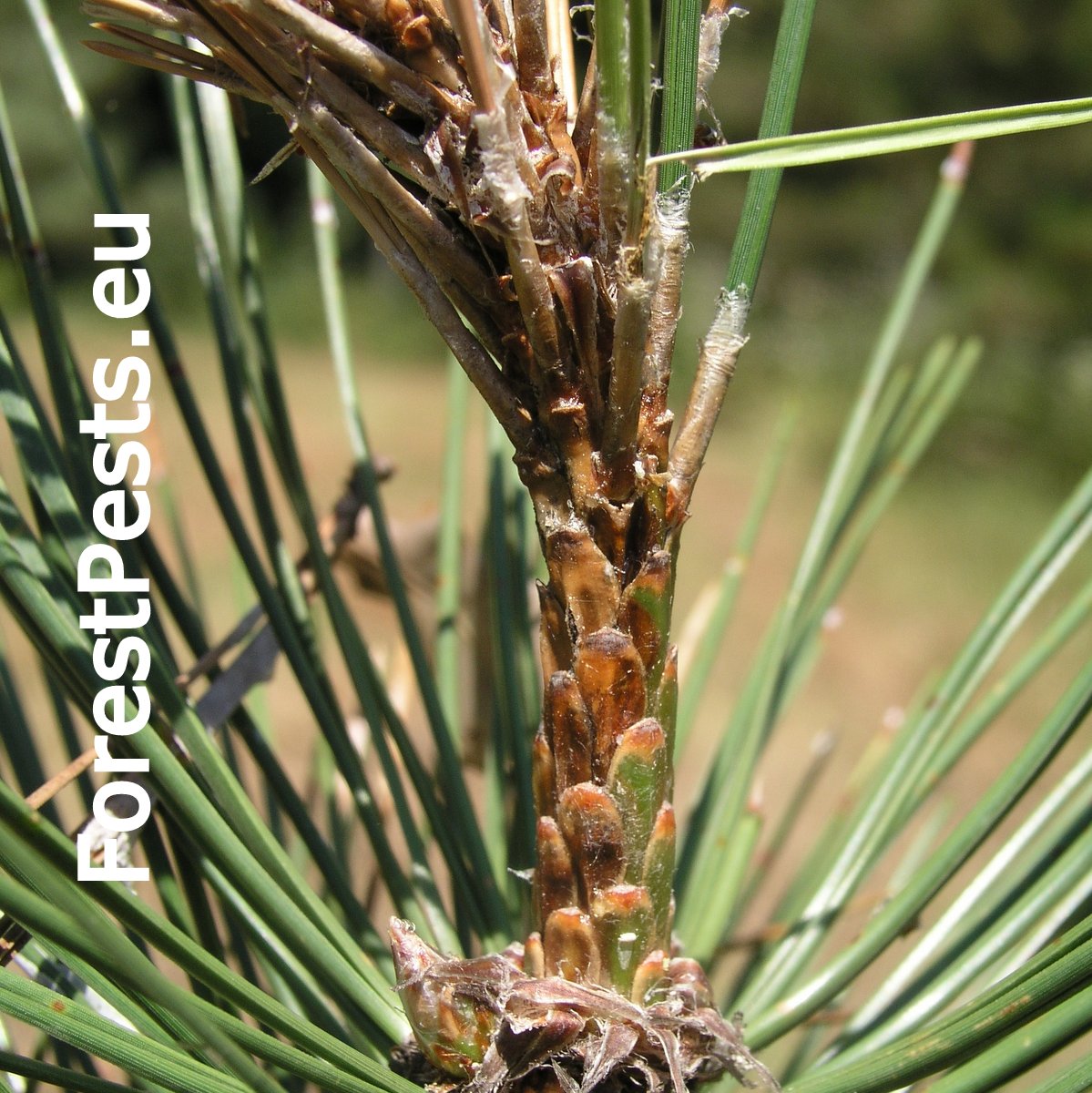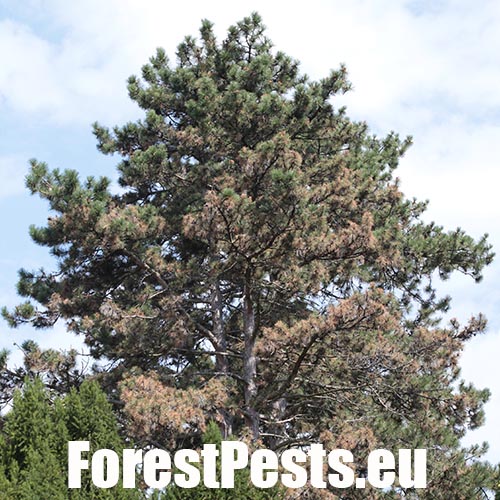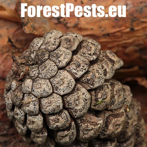 The fungus is a serious pathogen causing dieback of current year’s sprouts. The infection of needles and sprouts occurs in spring, during their flushing through a fleshy shoot in the stage of “candles”. The mycelium spreads rapidly and rounds the sprout before the needles finish their development. The shortened needles are pale brown by summer. As a result, the tree increases resin production. The mycelium spreads onto needle bases too and also infects cones and stem, where pycnidia are formed. The fungus can cause tree dieback.