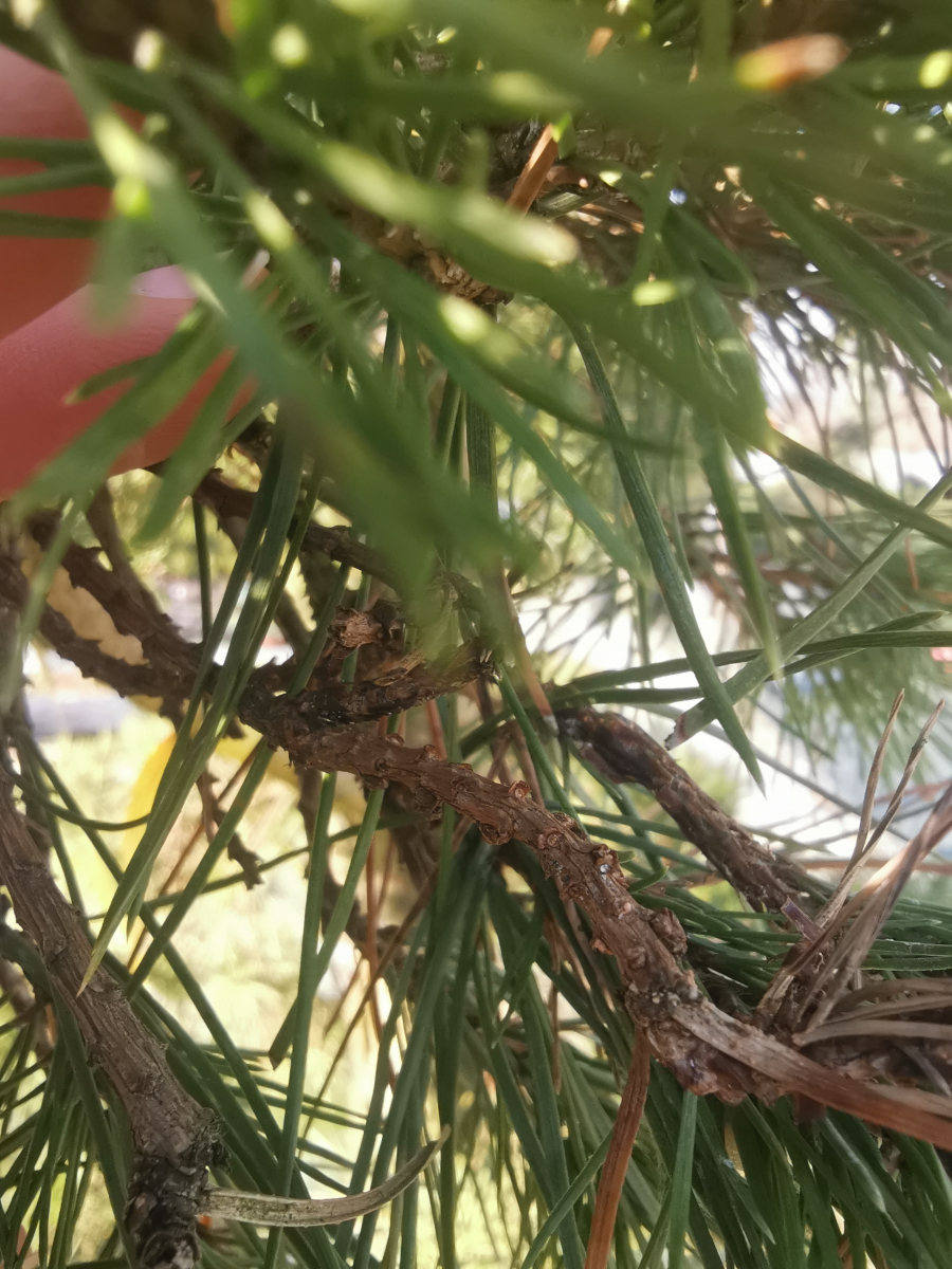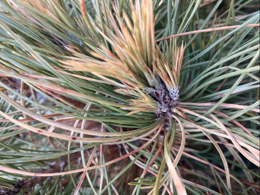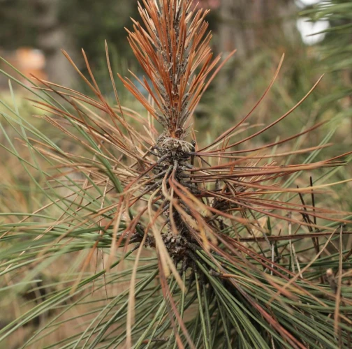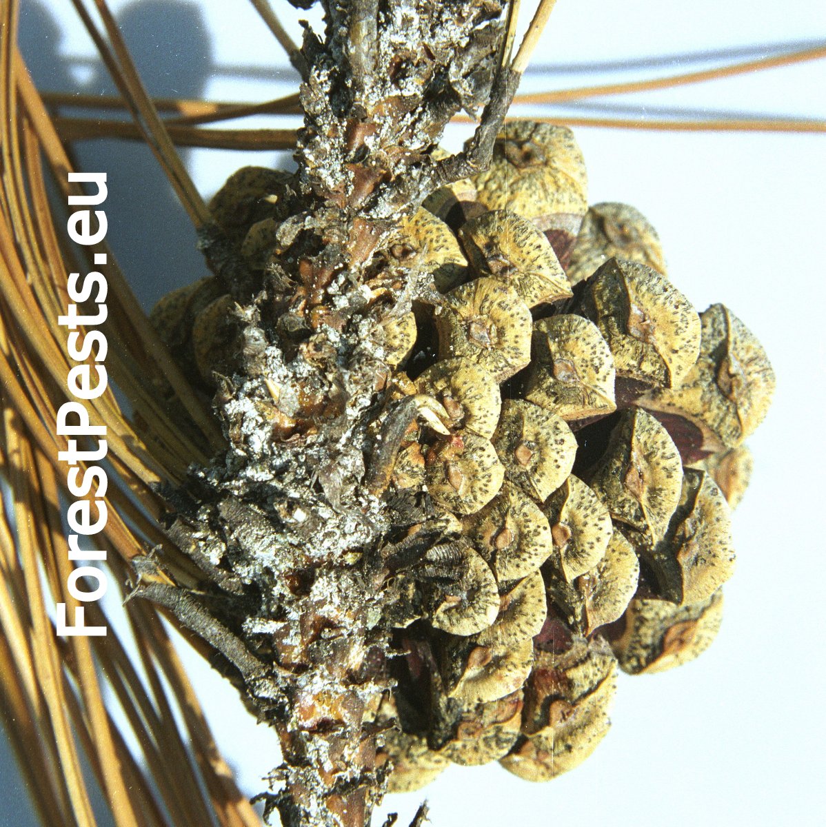 The fungus is a serious pathogen causing dieback of current year’s sprouts. The infection of needles and sprouts occurs in spring, during their flushing through a fleshy shoot in the stage of “candles”. The mycelium spreads rapidly and rounds the sprout before the needles finish their development. The shortened needles are pale brown by summer. As a result, the tree increases resin production. The mycelium spreads onto needle bases too and also infects cones and stem, where pycnidia are formed. The fungus can cause tree dieback.