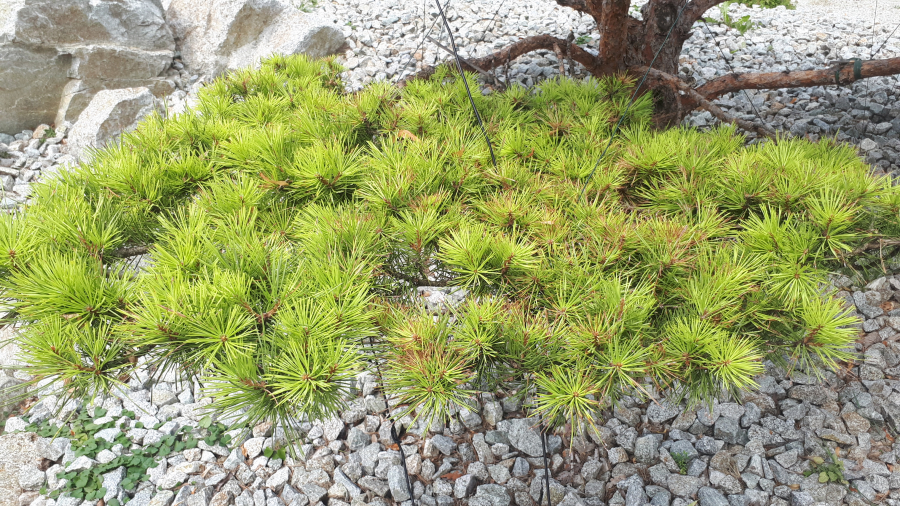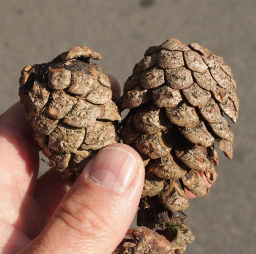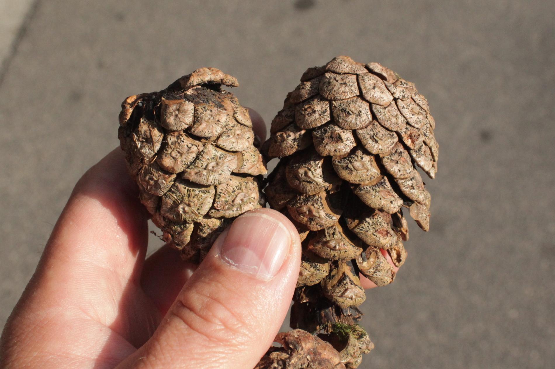 Tiny dots on cones, shortened needles.