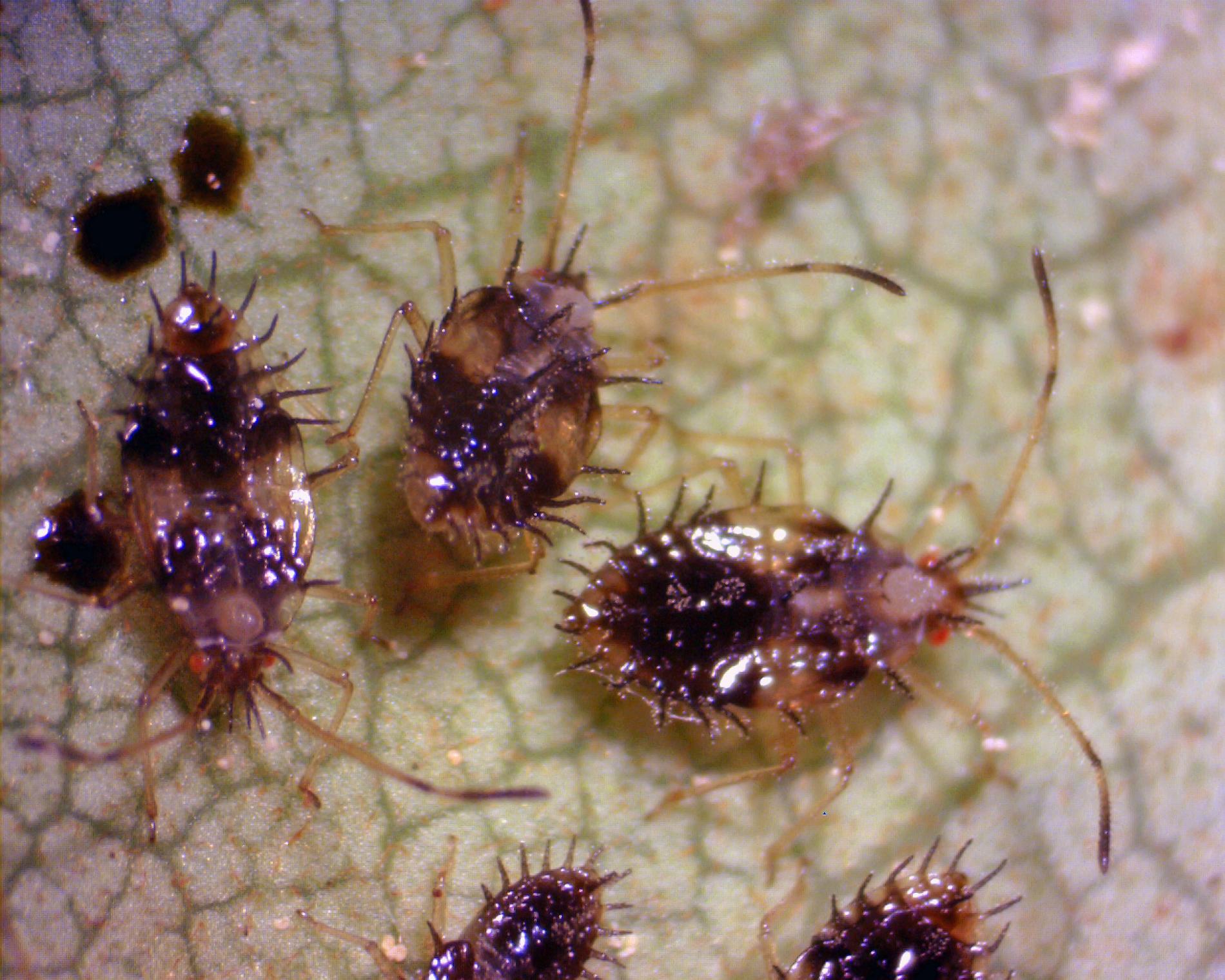 The insect completes several generations annually, with eggs overwintering in leaf tissue. Both adults and nymphs pierce leaves to extract sap, causing chlorophyll loss. Damaged leaves develop mottled discoloration and may drop prematurely, leading to reduced photosynthesis and stunted growth. The pest's activity is most severe on plants in sunny locations, where it can significantly reduce the ornamental value of affected shrubs.