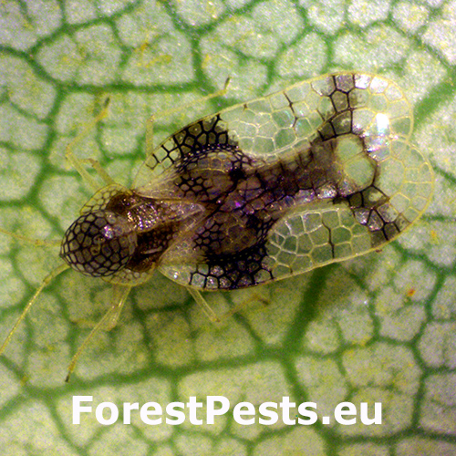 Stephanitis takeyai, known as the Andromeda lace bug, is a pest species originating from Japan, where it primarily infests Pieris japonica (Japanese andromeda). It has spread to Europe and North America via the plant trade and now poses a threat to ornamental gardens. Besides Pieris, it can also feed on rhododendrons (Rhododendron spp.) and azaleas. Adults measure about 3–4 mm, with lacy, black-and-white patterned wings and a rounded pronotum. Nymphs are dark and spiny in appearance.