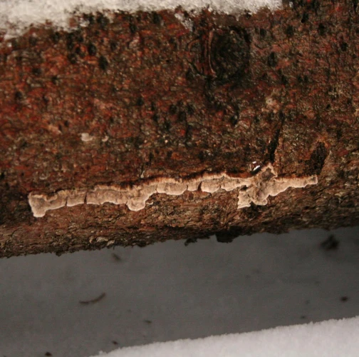 The fruiting bodies are resupinate, of irregular shape, or semi-resupinate with thin tiered caps, tawny or cinnamon brown, with spiked hairy margin and inconspicuous zoning.
